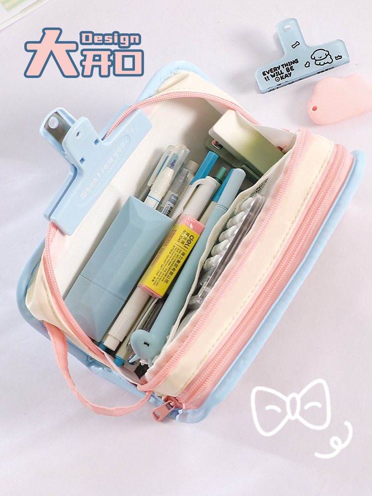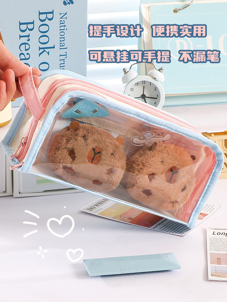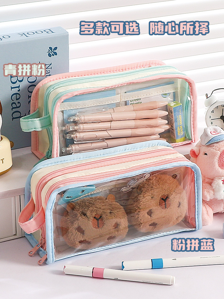 多巴胺可爱手提双透拼色笔袋小众不撞款中小学生文具袋
