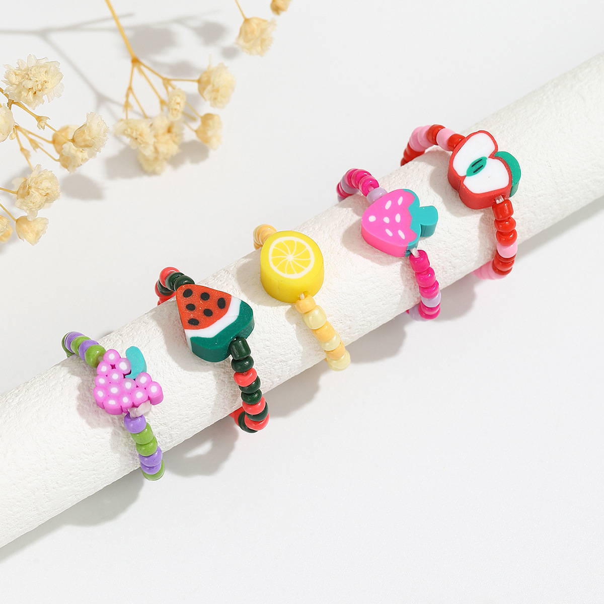 亚马逊热卖时尚经典简约彩色米珠戒指 软陶水果手工串珠指环女