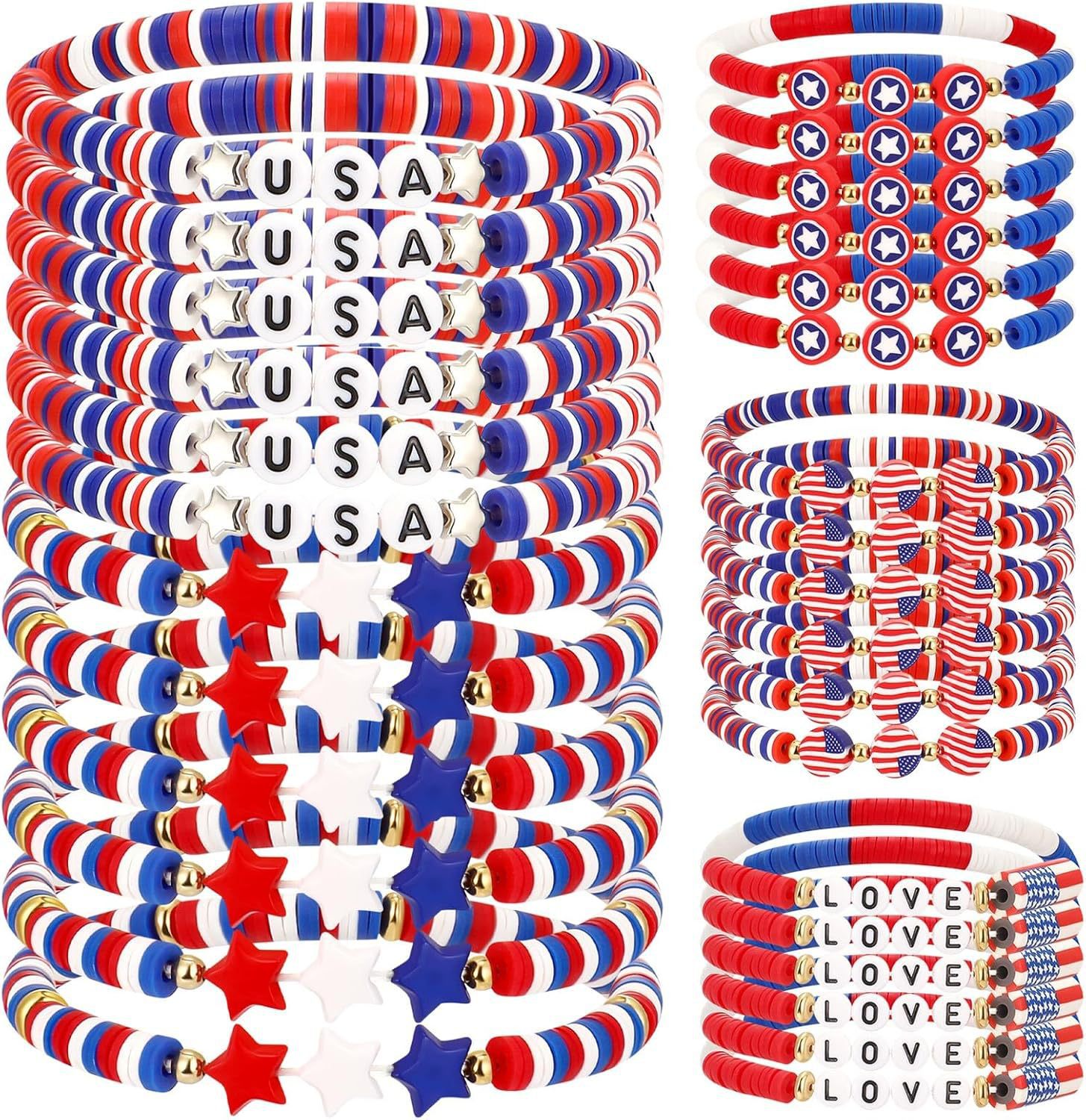 跨境欧美彩色红白蓝混色软陶手链美国国旗颜色多件套弹力字母手串 English | 投诉