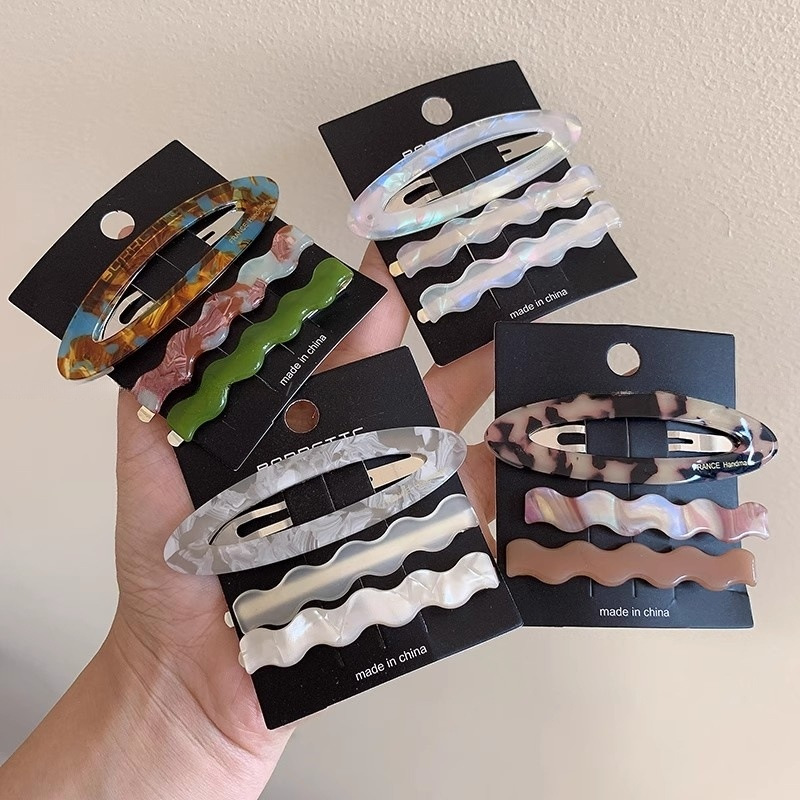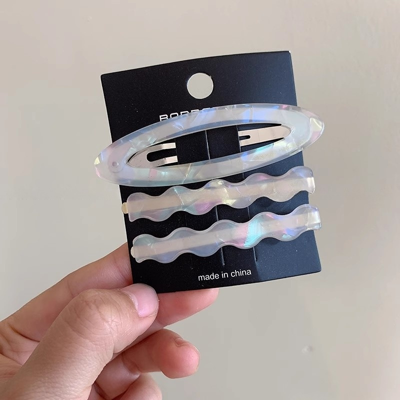 材质: 醋酸 货号: D514 品牌: 无 样式: 韩式 处理工艺: 手工 发夹分类: BB夹 产地: 义乌 主要下游平台: 快手,LINIO,SHEIN,速卖通,天 颜色: 蓝绿三件套,浅豹纹三件套,幻彩白三件套, 有可授权的自有品牌: 否 是否跨境出口专供货源: 是 流行元素: 一字 上市年份/季节: 2025年春季 风格: 高级感 风格分类: 时尚通勤 主要销售地区: 中东,其他 适用人群: 女式 流行元素分类: 形状/图案