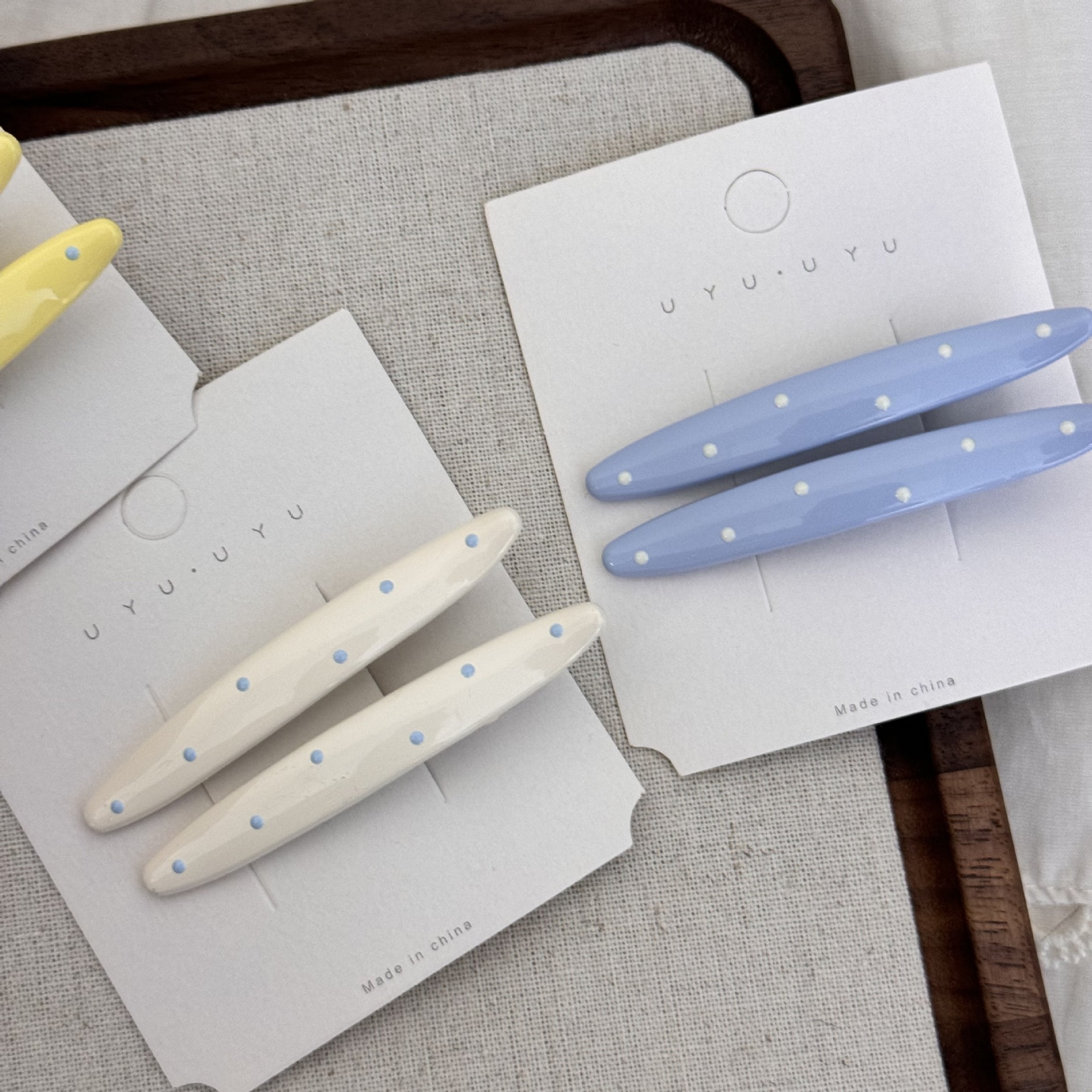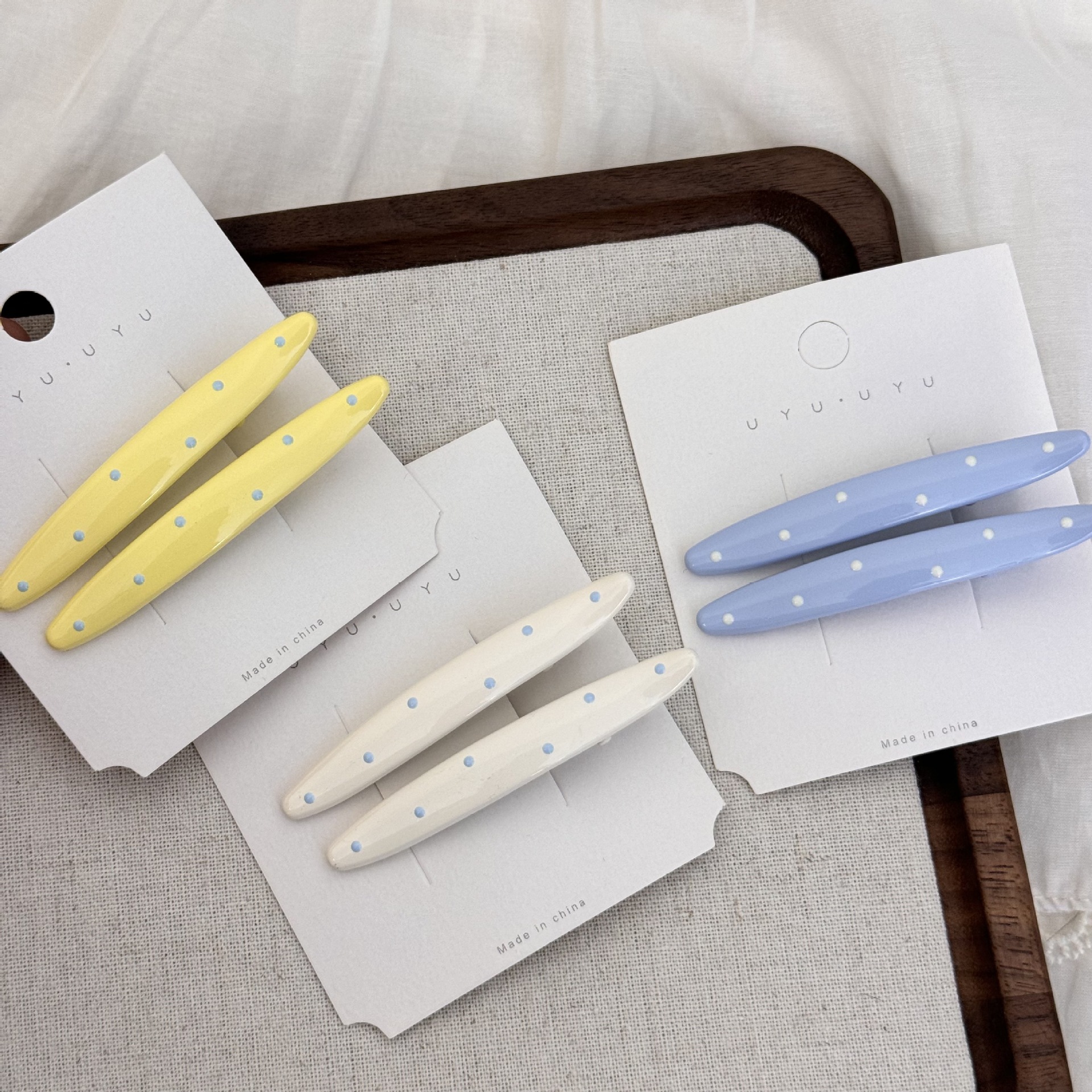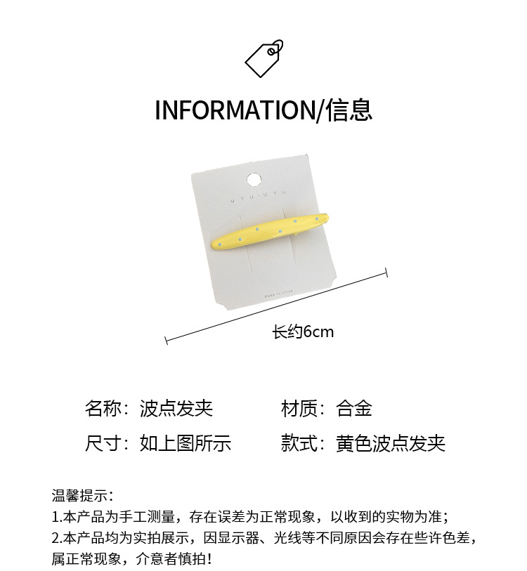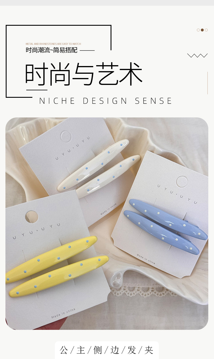 材质: 合金 货号: FJ83168 品牌: 苏纯(服饰配件) 样式: 女式 处理工艺: 手工 发夹分类: 鸭嘴夹 产地: 义乌 主要下游平台: 淘宝,京东,ebay,PDD,亚马逊,w 颜色: 黄色波点发夹,米色波点发夹,蓝色波点发夹 有可授权的自有品牌: 是 是否跨境出口专供货源: 是 流行元素: 线条 上市年份/季节: 2025夏季 风格: 韩版韩式 风格分类: 清新甜美 主要销售地区: 非洲,欧洲,南美,东南亚,北美,东北亚, 适用人群: 女式 流行元素分类: 几何