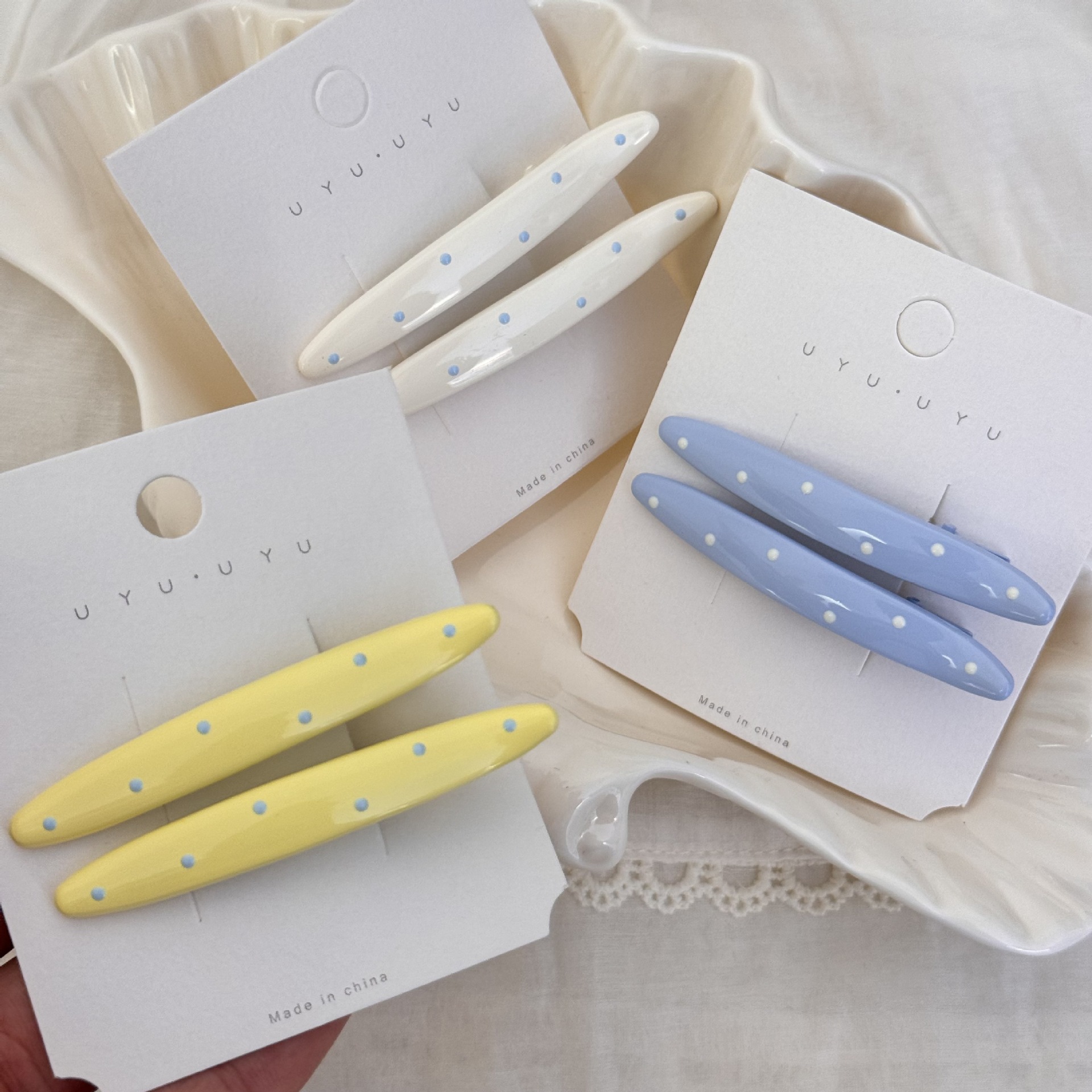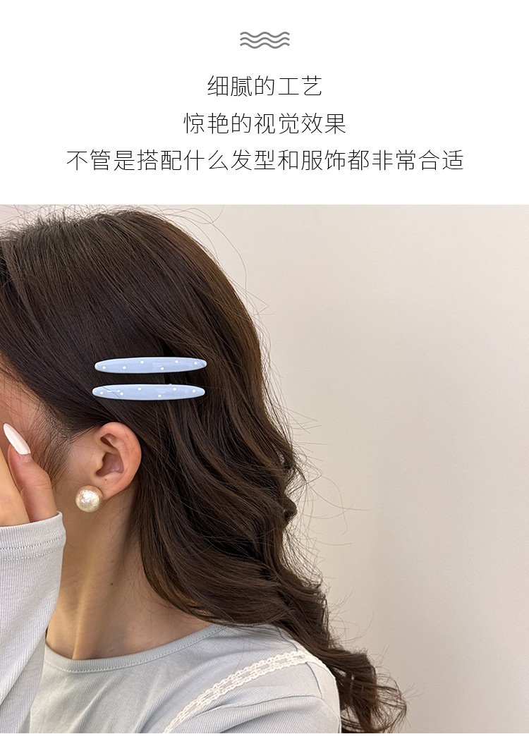 韩系蓝白波点奶油色发夹滴油鸭嘴夹韩版风时尚边夹发夹刘海夹发卡 English | 投诉