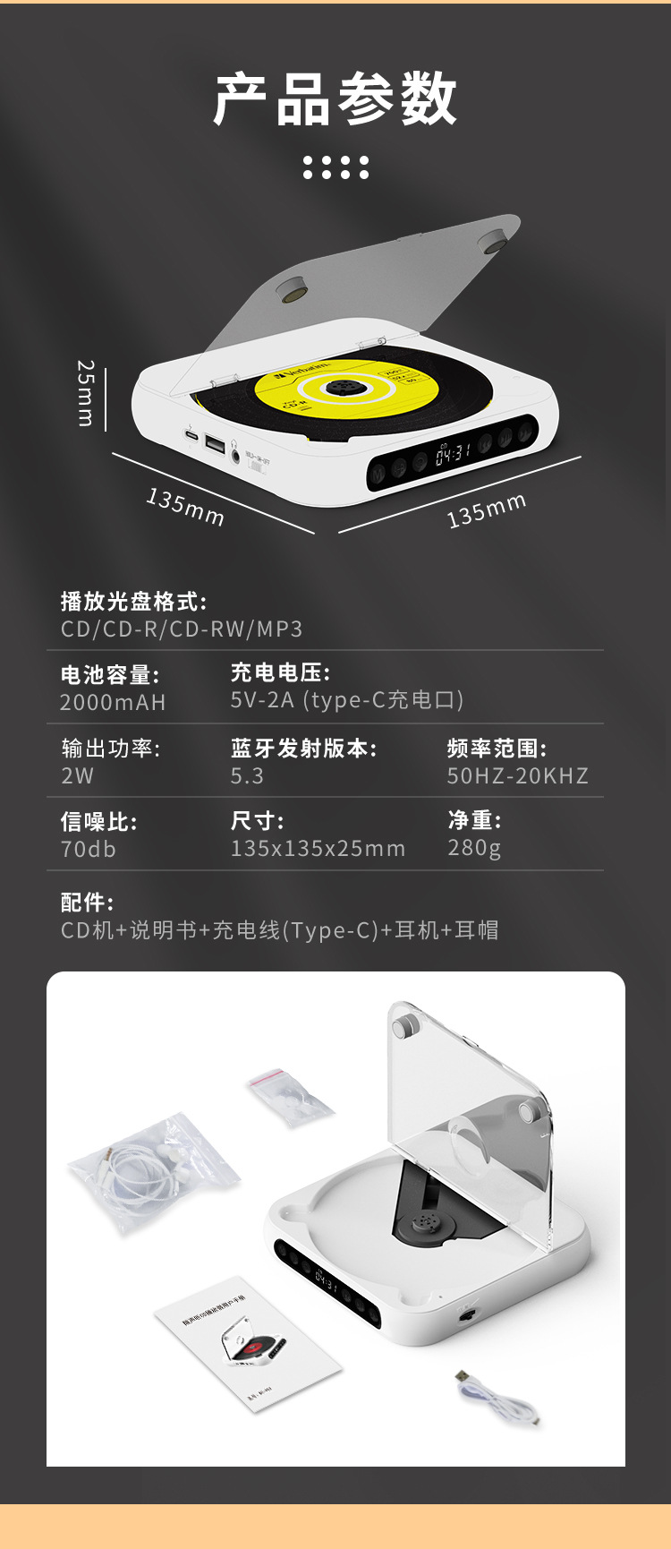品牌: 中性 播放格式: MP3 碟机种类: CD机 额定电压: 5V2A 额定功率: 2 额定频率: 50HZ−20KHZ 光盘放入方式: 托盘式 货号: KC-918 型号: EA-100(随身听) 音频线类别: 音频线 材质: ABS 包装清单: 主机*1说明书*1耳机*1充电线*1 是否支持逐行扫描: 不支持 3C证书编号: 2020970805000042 货源类别: 现货 物流服务: 送货上门 上市时间: 2023 最高功率: 10 颜色: 白色,黑色,粉色,抹茶绿 是否跨境出口专供货源: 否 重量: 0.4 kg/个