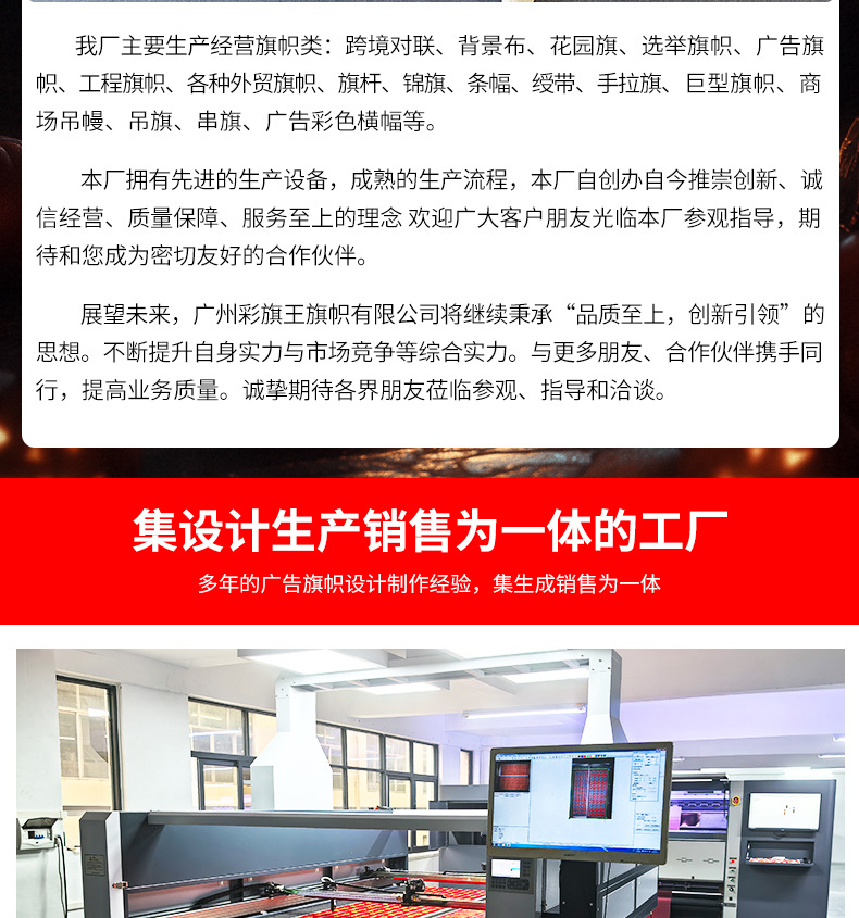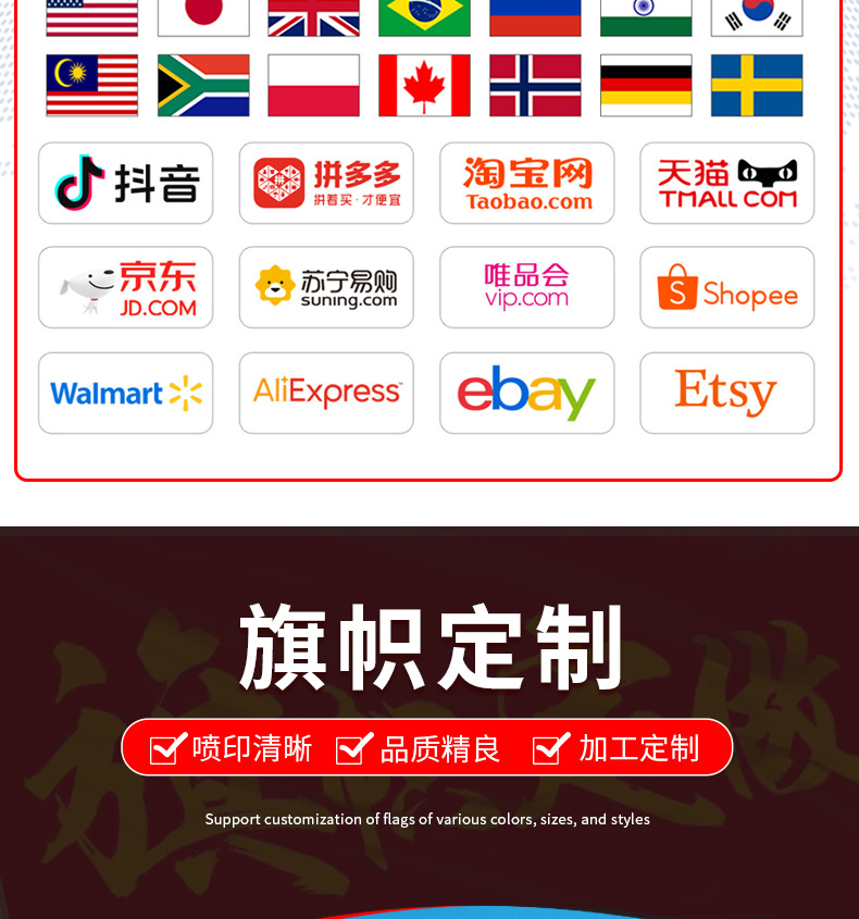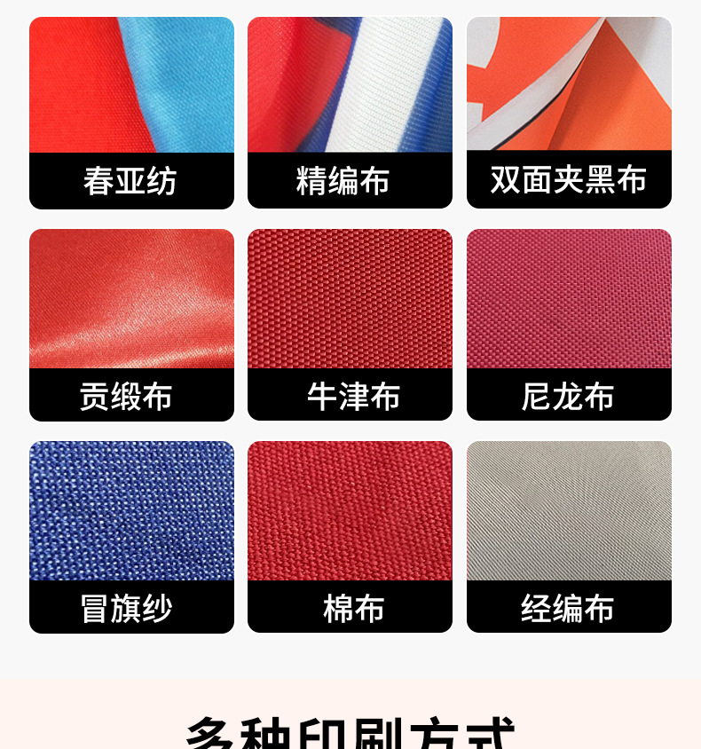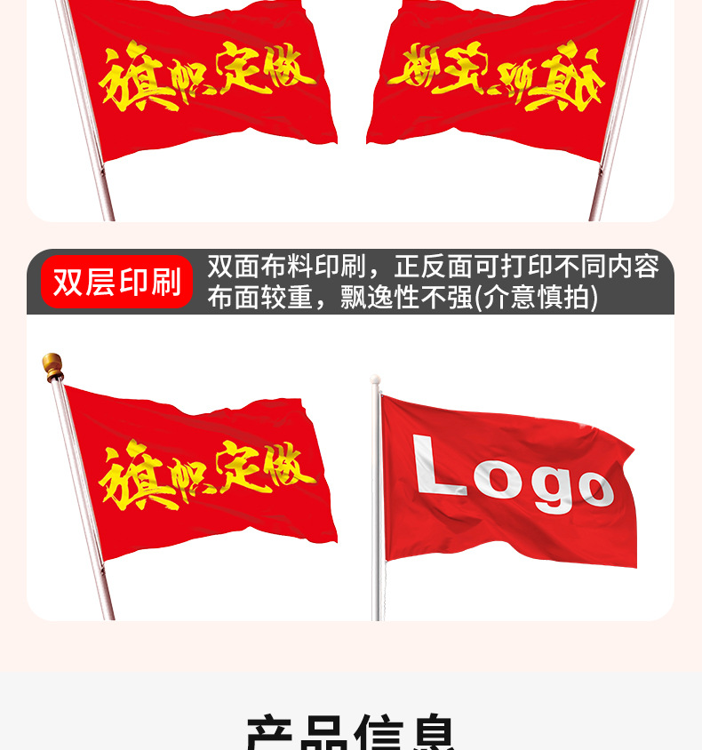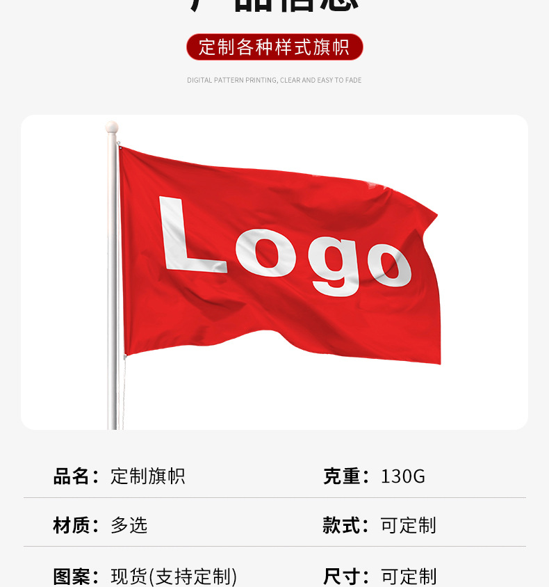 品牌: 彩旗王 货号: / 材质: 涤纶 工艺: 缝纫 加工定制: 是 产品编号: / 旗帜种类: 定制旗帜 旗面面料: 涤纶布 旗杆材料: 塑料 形状: 定制 尺寸: 来图来样定制 加印LOGO: 可以 是否专利货源: 否 规格: 定制 是否进口: 否 颜色: 150cm*90cm 有可授权的自有品牌: 否 是否跨境出口专供货源: 是 是否属于礼品: 否 产品颜色: 任意颜色 来图定制 重量: 0.5 kg/个