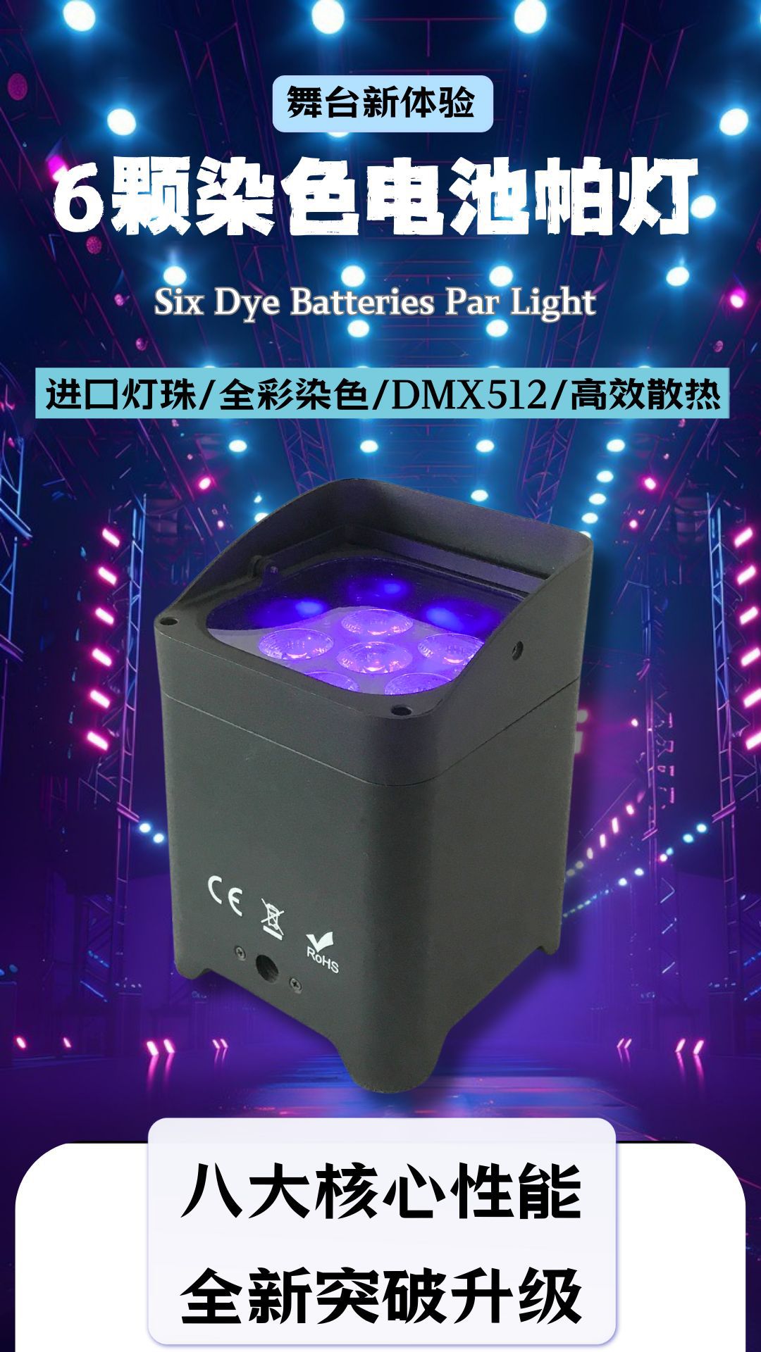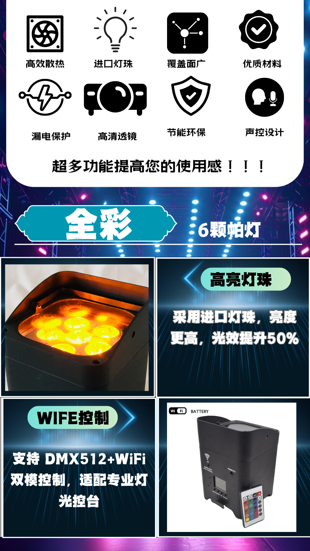 光源:6颗18W六合一超亮度leds,6-10万小时寿命