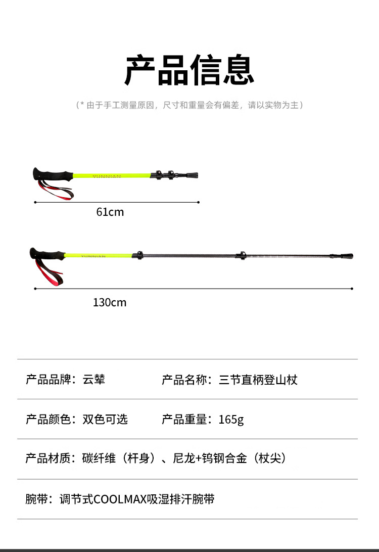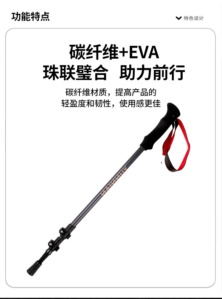 品牌: 登山杖 产品类别: 登山杖 材质: 碳素纤维 重量: 185G 货号: 551 产地: 中国 尺寸: 1.35 型号: 1 颜色: 黑色,黄色 主要下游平台: ebay,亚马逊,wish,速卖通,独立 主要销售地区: 非洲,欧洲,南美,东南亚,北美,东北亚, 是否跨境出口专供货源: 是 儿童专用: 否