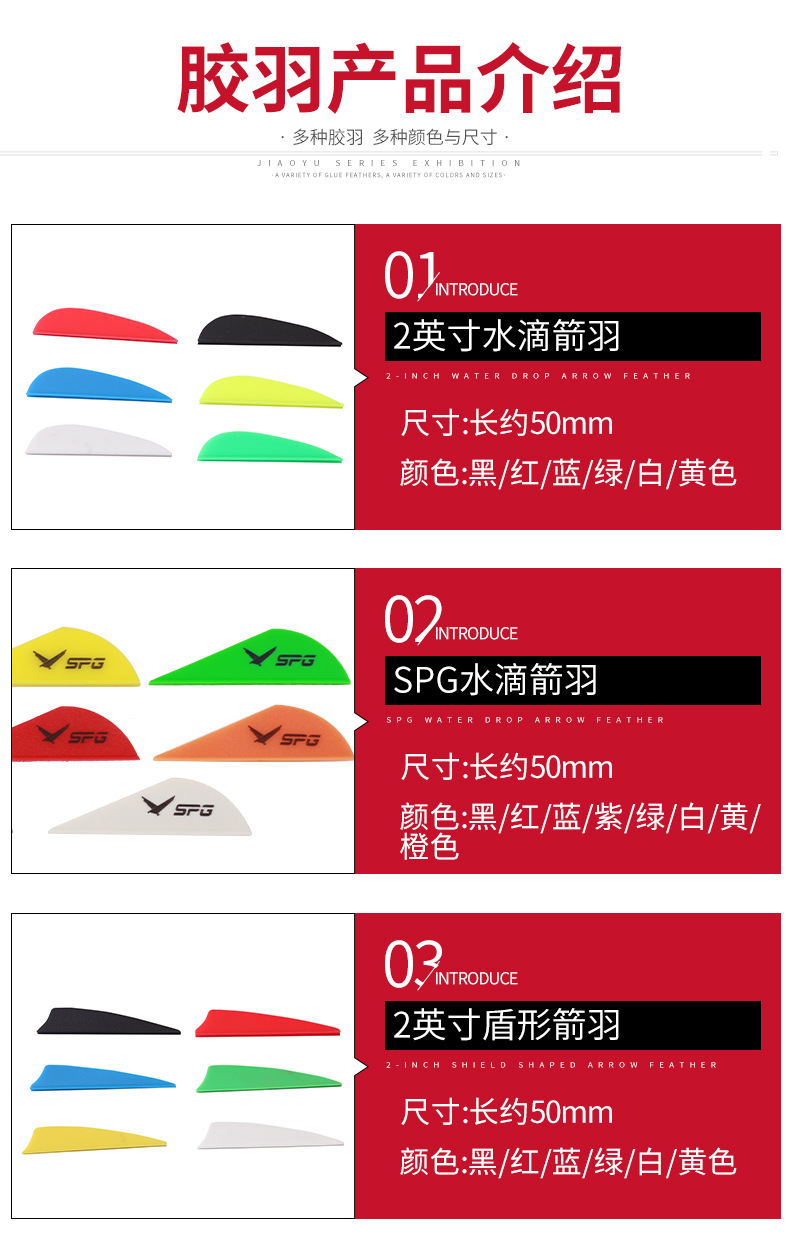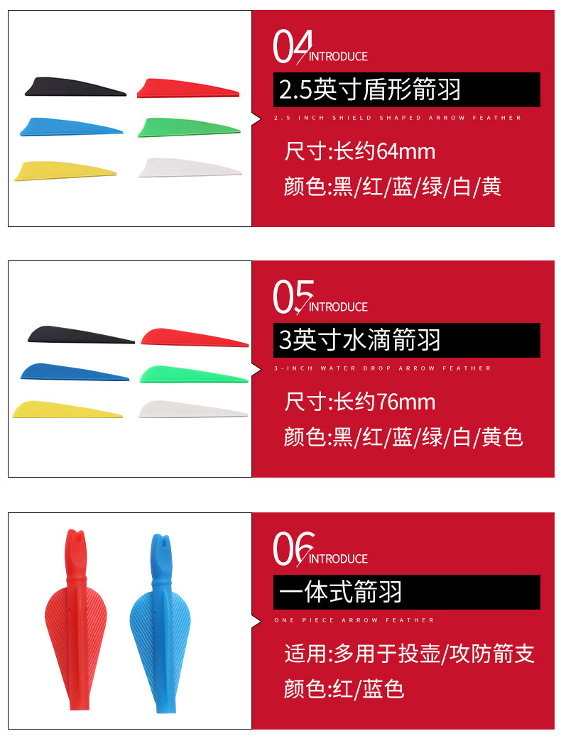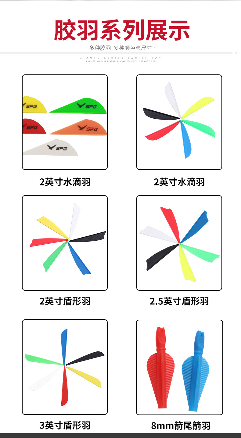 产品类别: 箭 材质: 橡胶/ 塑料 规格: 2英寸水滴羽,3英寸水滴羽,2英寸盾型羽 箱装数量: 1000 主要下游平台: ebay,亚马逊,wish,速卖通,独立 主要销售地区: 非洲,欧洲,南美,东南亚,北美,东北亚, 有可授权的自有品牌: 是 是否跨境出口专供货源: 是 专利类型: 无 颜色: 多色可选 重量: 0.005 kg/个