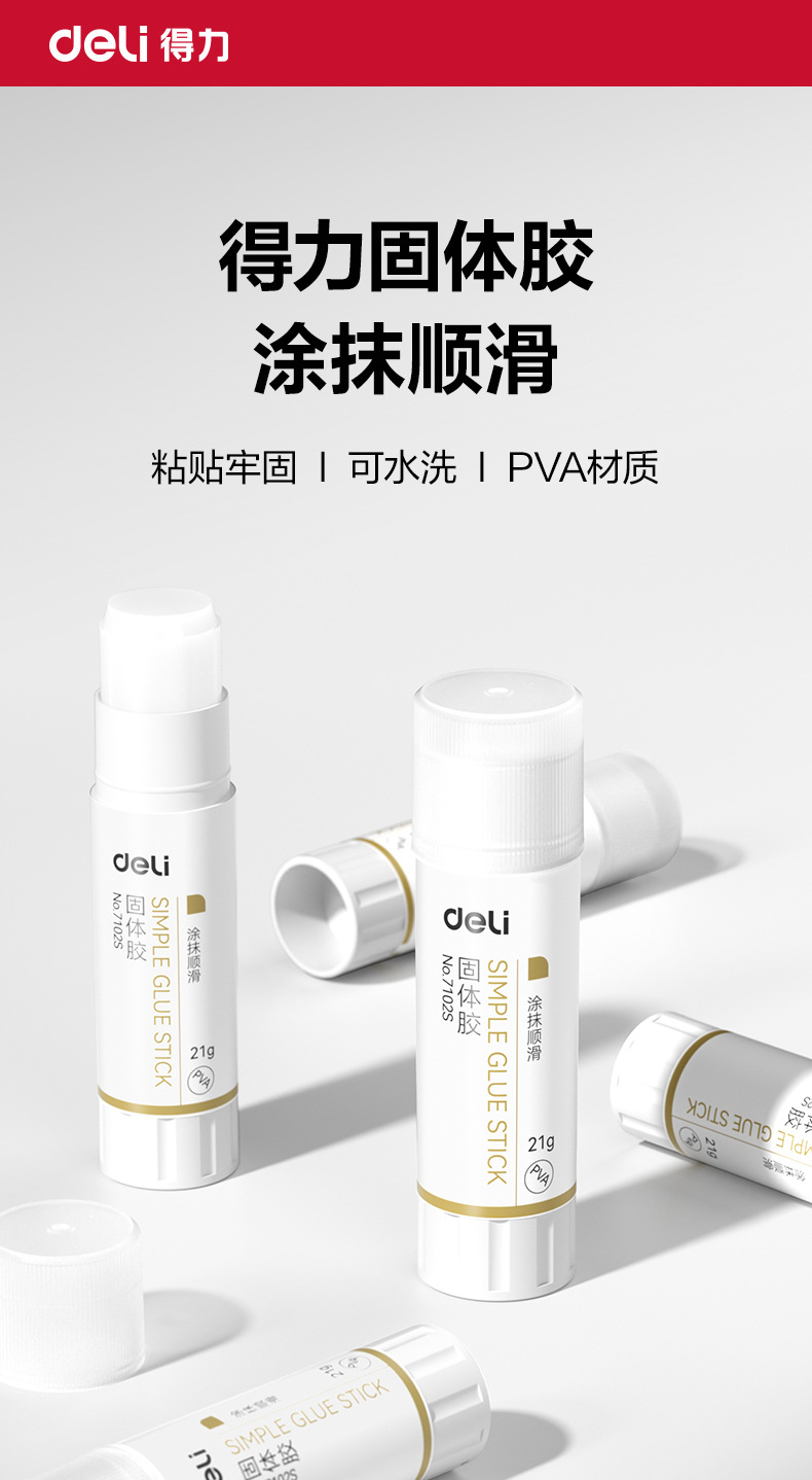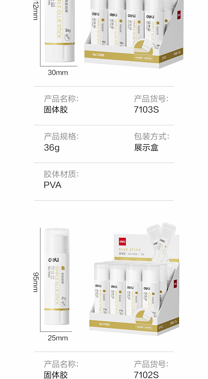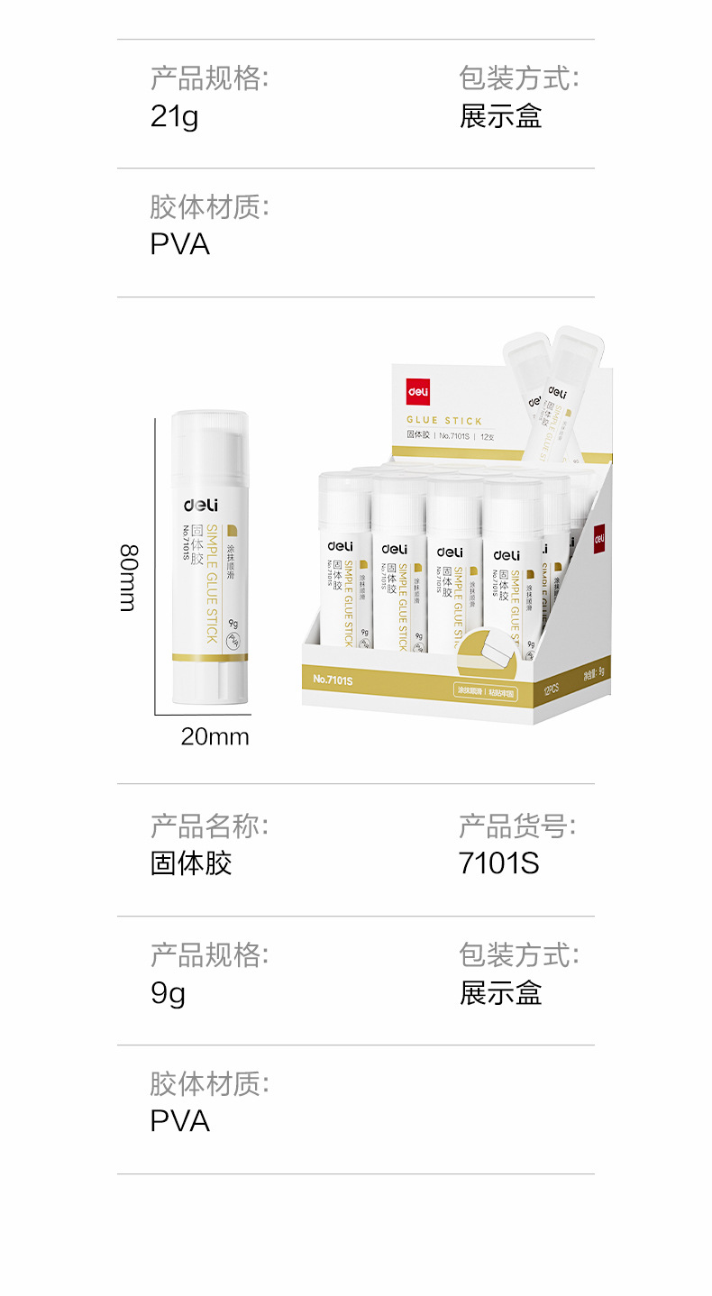 品牌: Deli/得力 型号: 7101S 7102S 货号: 7101S 7102S 规格: 小号9克/支,中号21克/支,大号36克 材质: PVA 产地: 宁波 产品尺寸: 80*20mm 净重: 9G 是否进口: 否 是否跨境出口专供货源: 否