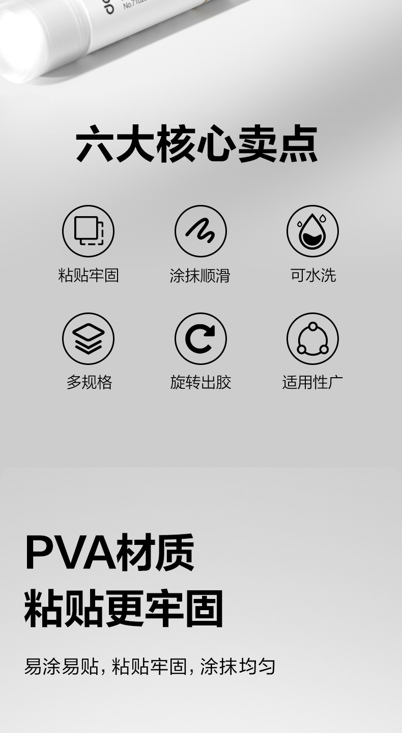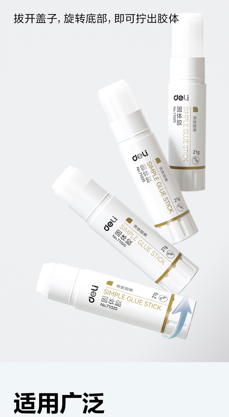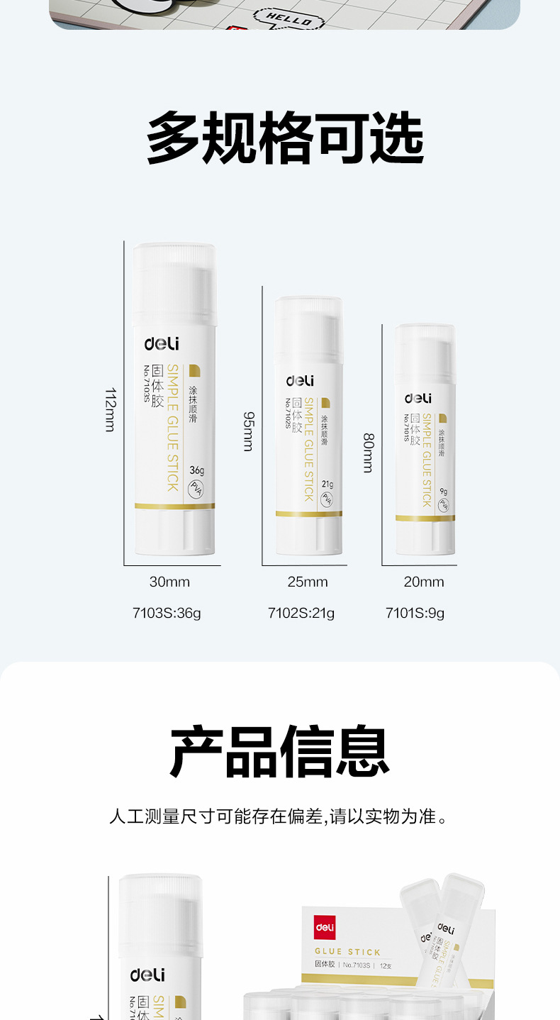 品牌: Deli/得力 型号: 7101S 7102S 货号: 7101S 7102S 规格: 小号9克/支,中号21克/支,大号36克 材质: PVA 产地: 宁波 产品尺寸: 80*20mm 净重: 9G 是否进口: 否 是否跨境出口专供货源: 否