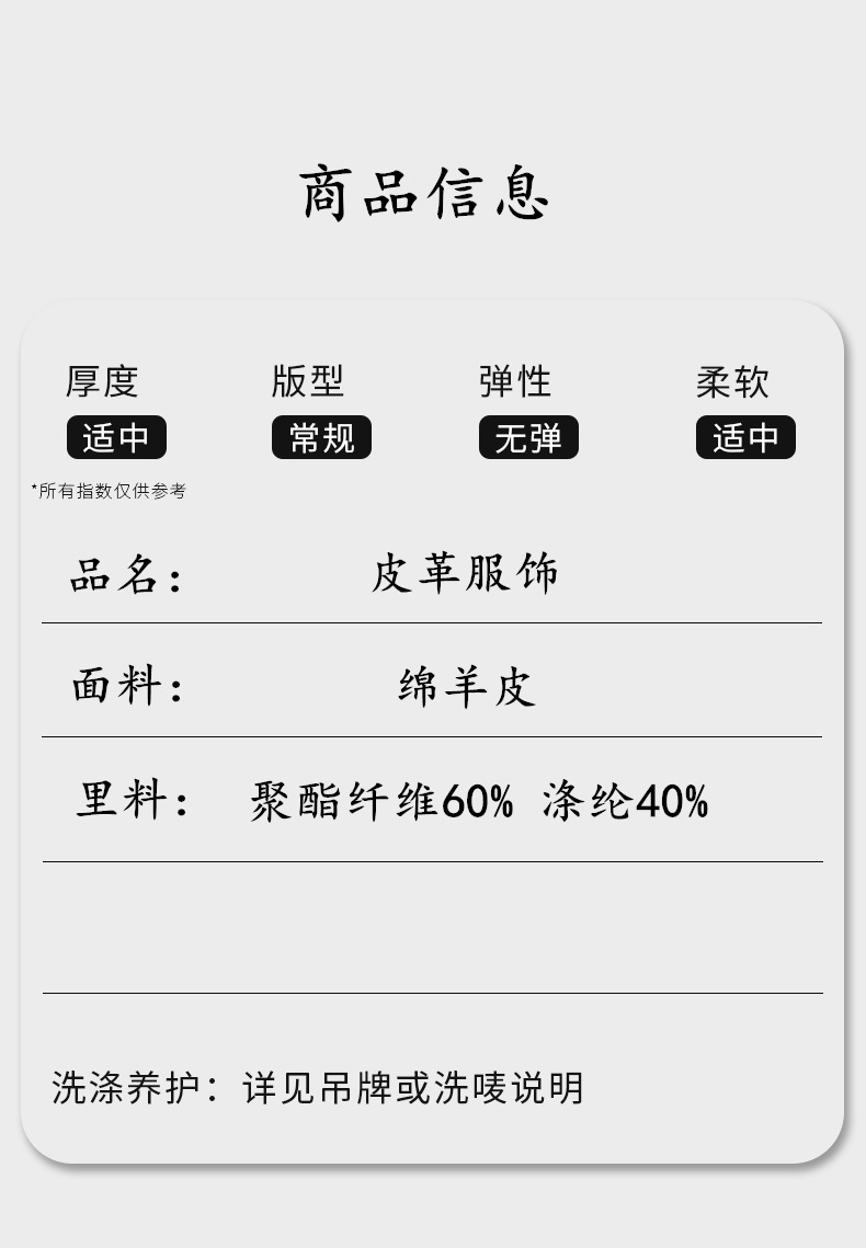 货源类别: 现货 品牌: 其他 货号: BG8113 风格: 韩版 淘货类别: 商务绅士(35岁以上) 衣长: 普通款(50cm<衣长≤65cm) 版型: 合体型 领型: 西装领 门襟: 拉链 是否连帽: 不连帽 误差范围: 1/3 是否库存: 是 库存类型: 整单 皮质分类: 绵羊皮 上市年份/季节: 2025年秋季 里料成分: 聚酯纤维(涤纶) 里料成分含量: 100 适用场景: 休闲 适合季节: 四季 适用人群: 中年 重量: 0.5 kg/件