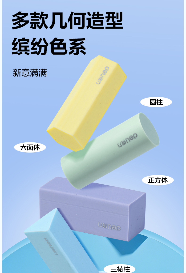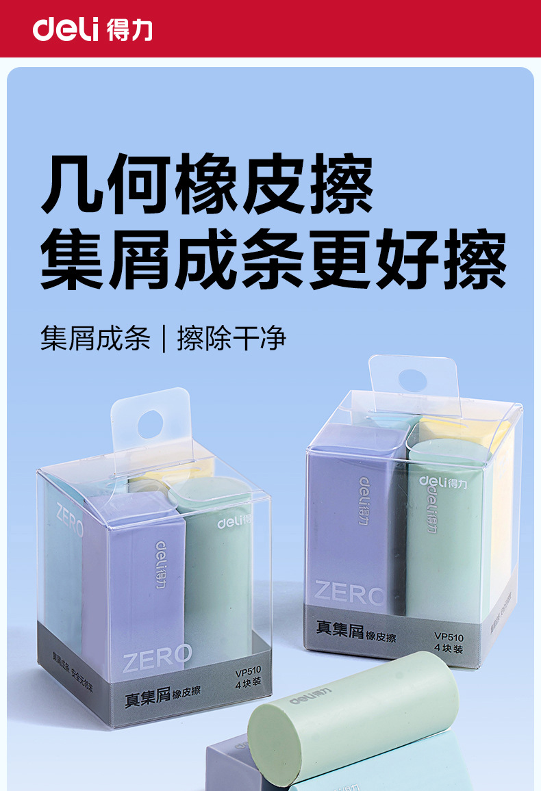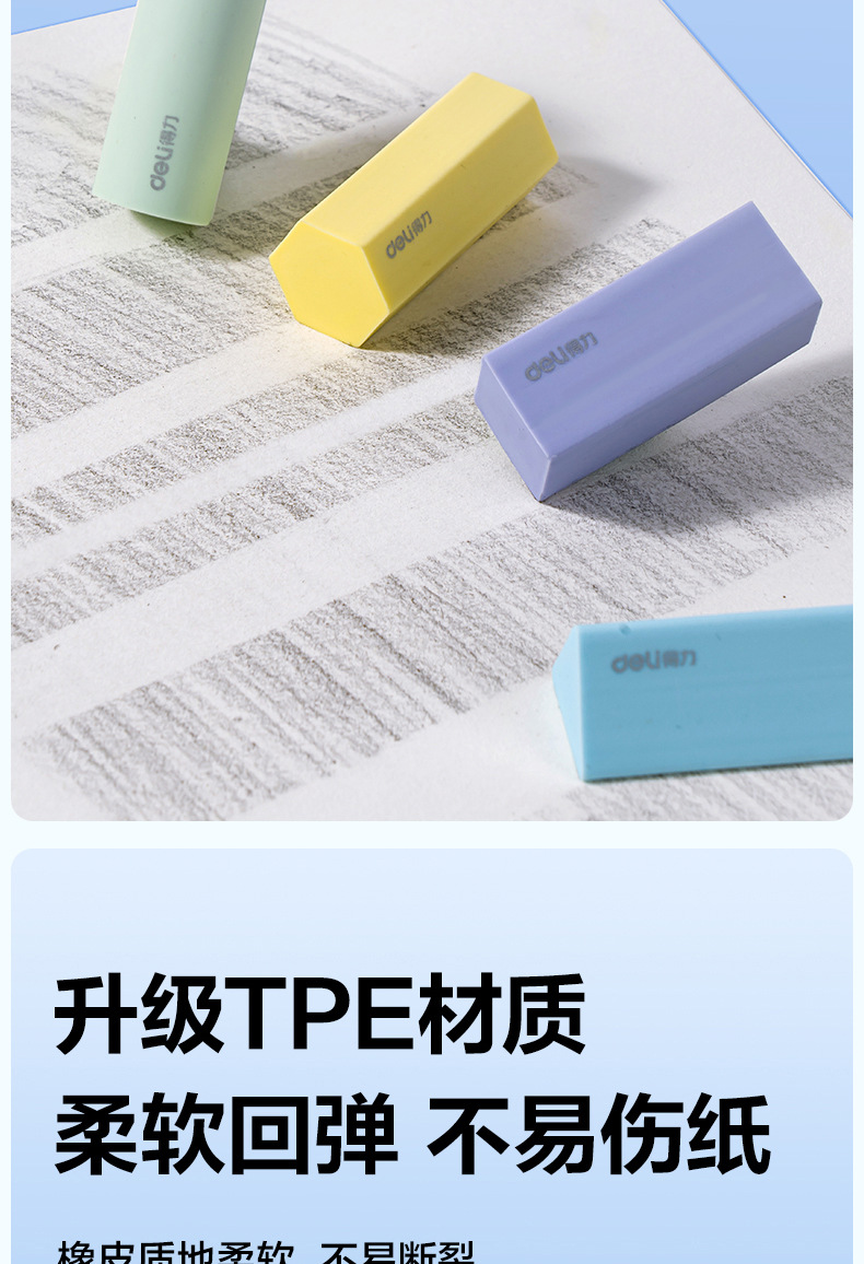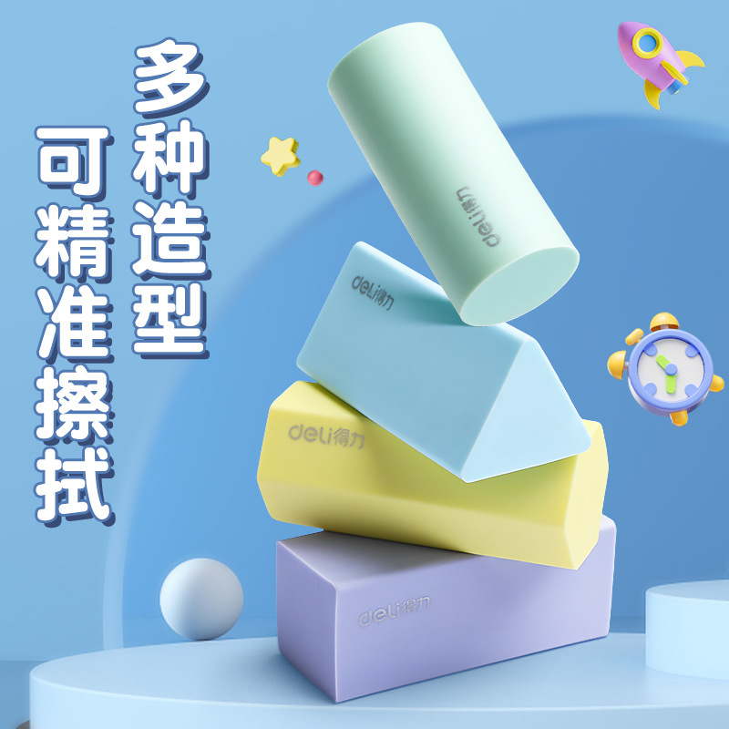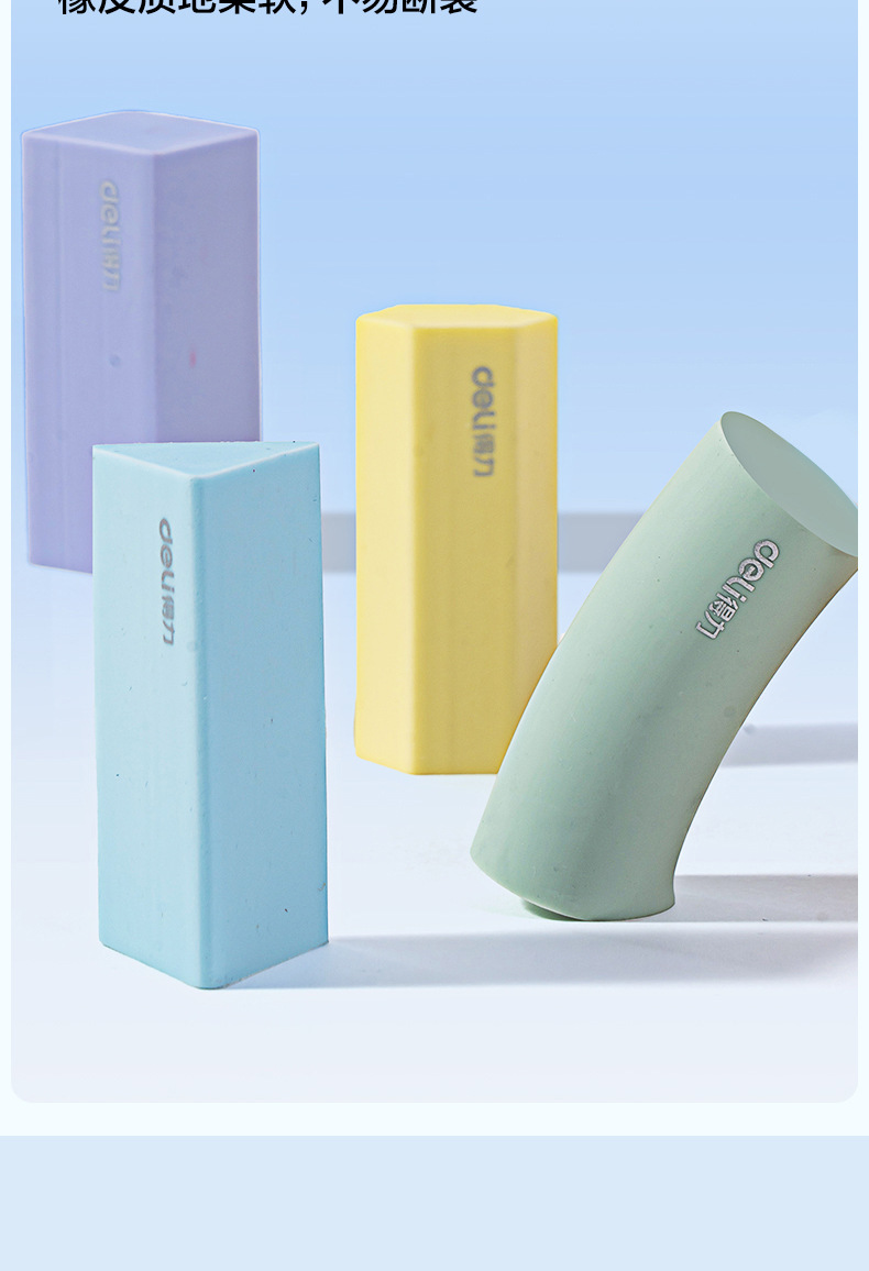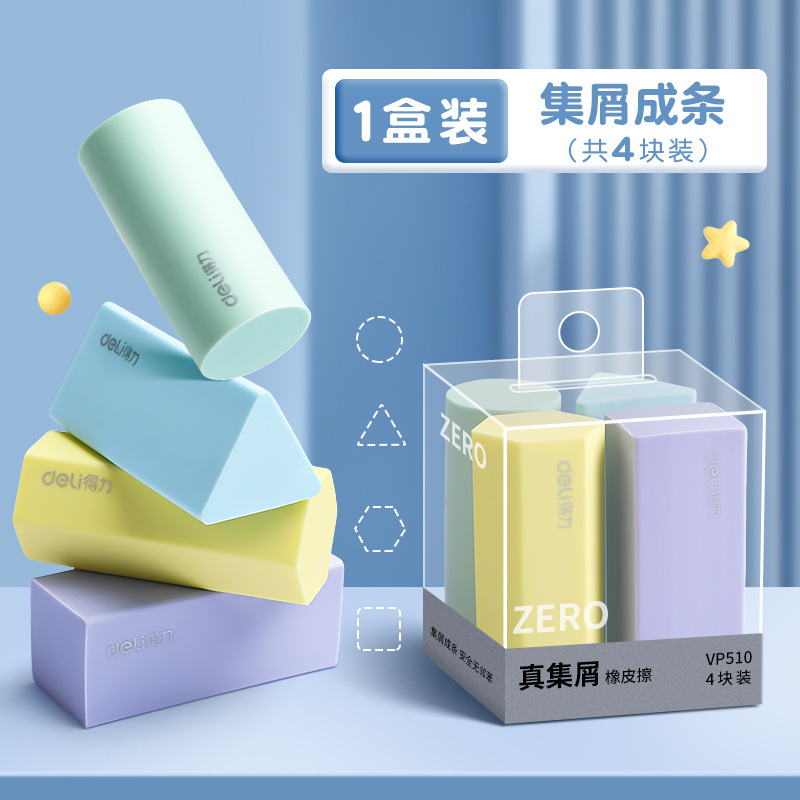 品牌: Deli/得力 货号: VP510 型号: VP510 材质: PVC 规格: 【1盒4个装】粗细可擦 造型: 几何 用途: 擦拭错字 加印LOGO: 不可以 加工定制: 否 净重: 64g/84g(g)