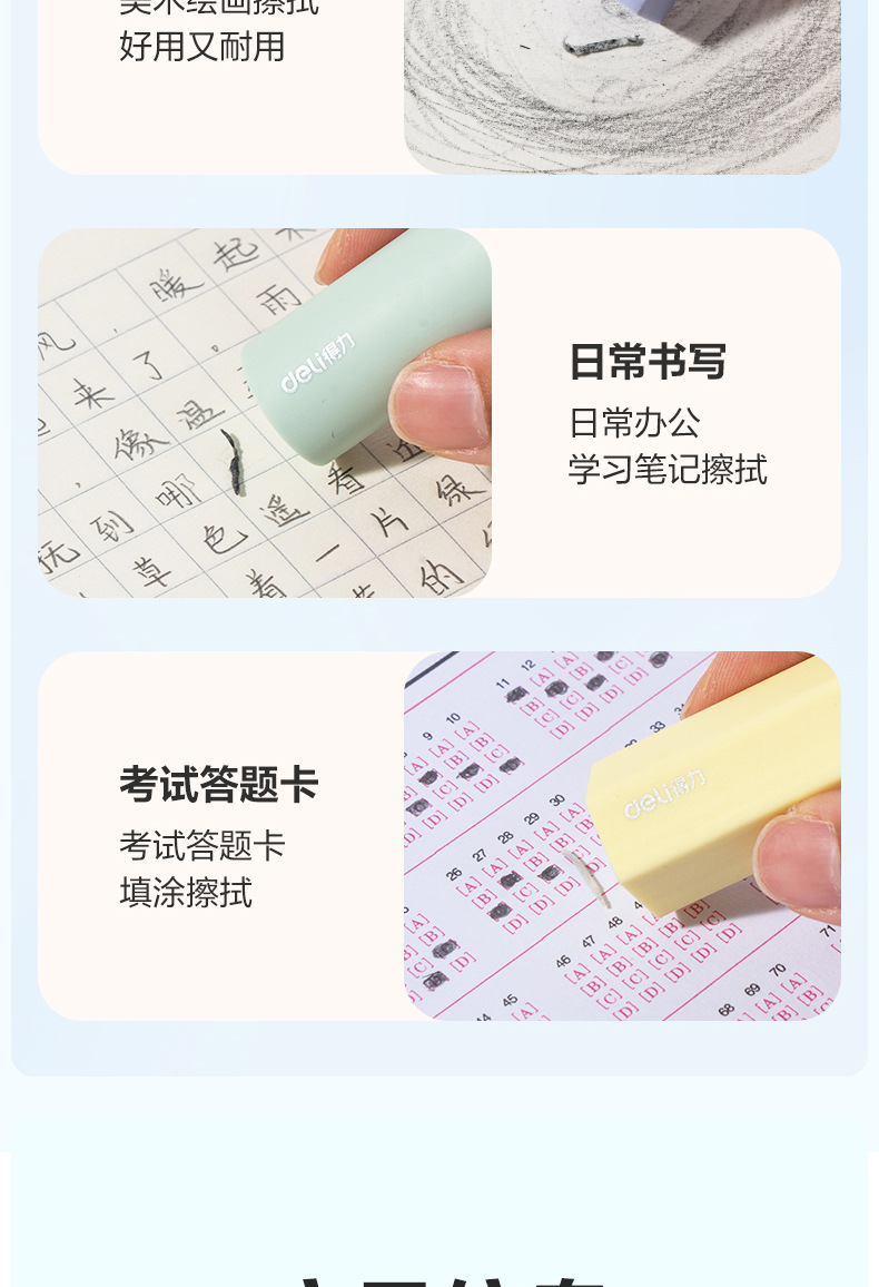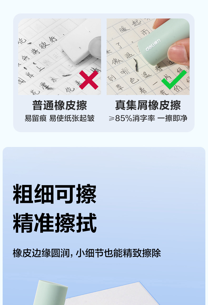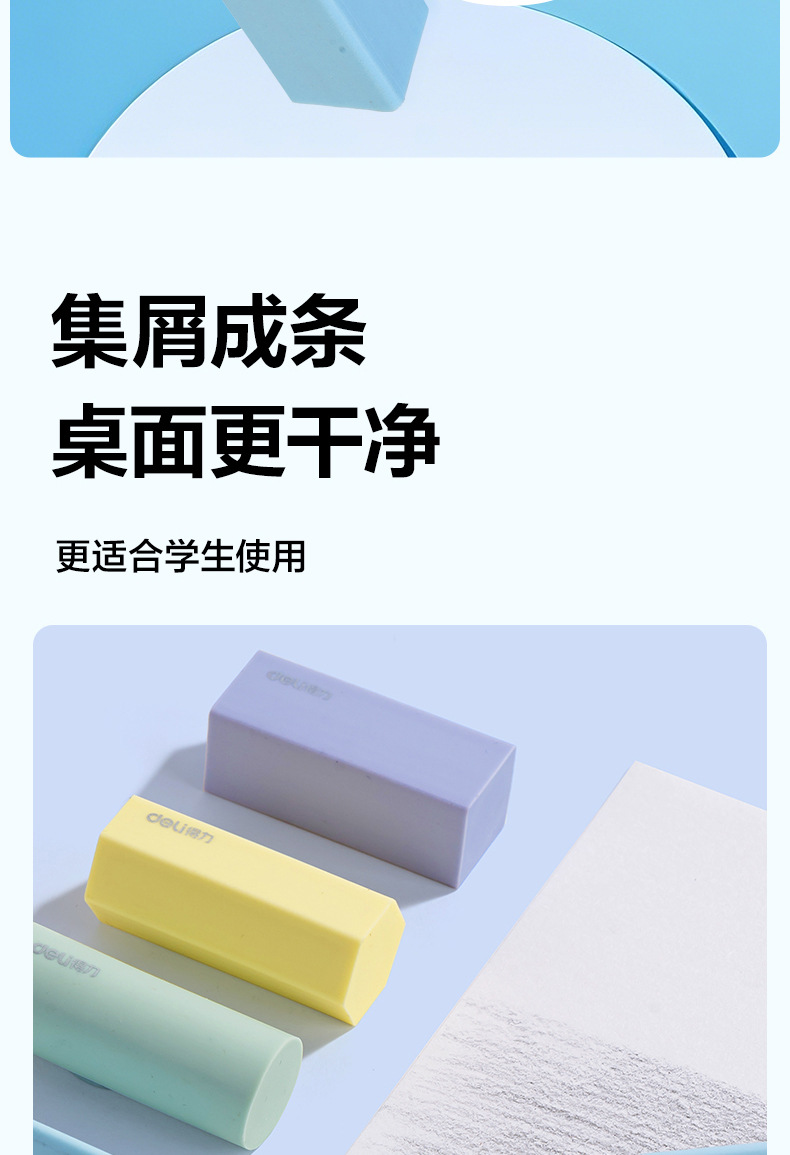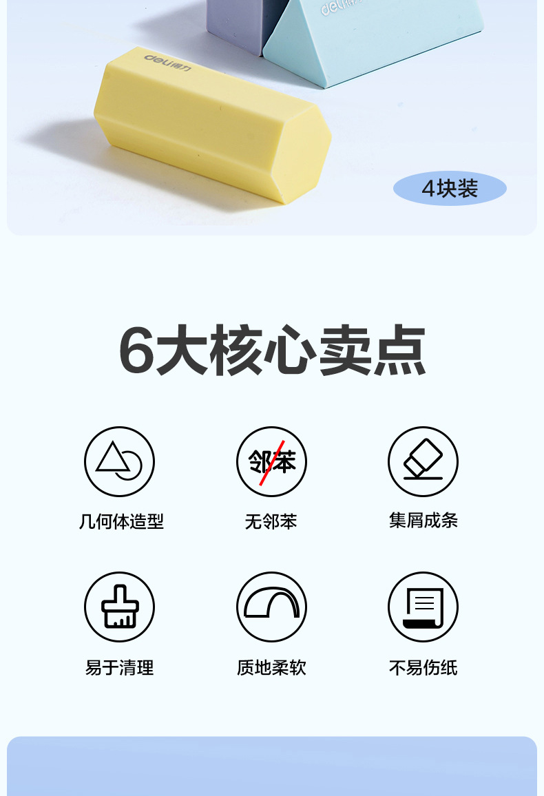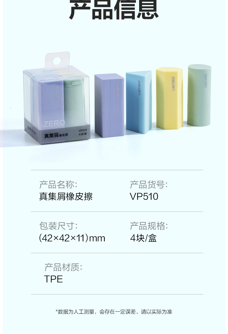 品牌: Deli/得力 货号: VP510 型号: VP510 材质: PVC 规格: 【1盒4个装】粗细可擦 造型: 几何 用途: 擦拭错字 加印LOGO: 不可以 加工定制: 否 净重: 64g/84g(g)