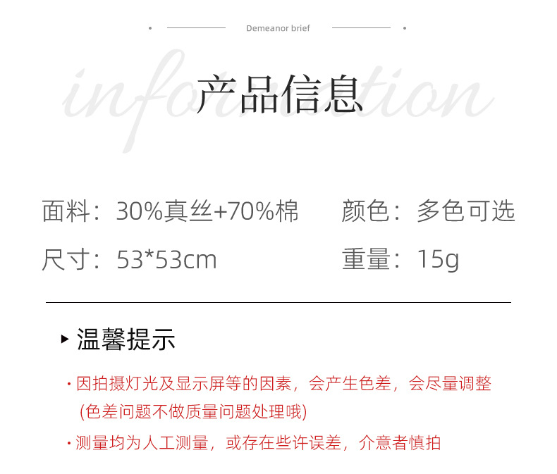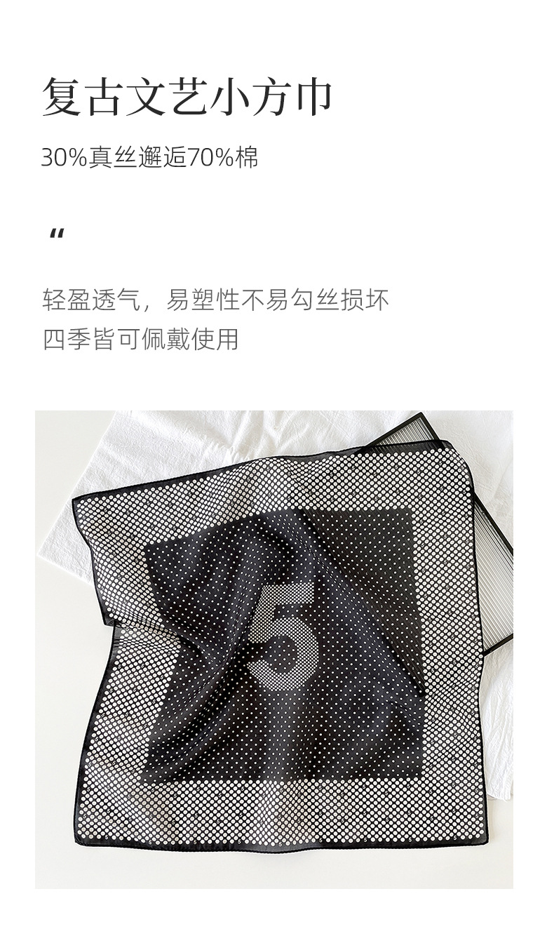 适合季节: 秋季 品牌: 苏之绸 颜色: MZS5518-黑色,MZS5518-米 长度(CM): 53*53cm 产地: 义乌 货号: MZS5518 编织方法: 经编 款式: 方巾 是否跨境出口专供货源: 是 主要下游平台: 淘宝,ebay,亚马逊,wish,速卖通 主要销售地区: 非洲,欧洲,南美,东南亚,北美,东北亚, 上市年份/季节: 2025年冬季 风格: 百搭,优雅,时尚OL,简约,欧美,轻奢风 面料名称: 棉真丝 风格分类: 时尚通勤 处理工艺: 印花,其他 尺寸: 53*53cm 流行元素分类: 无 重量: 0.015 kg/条