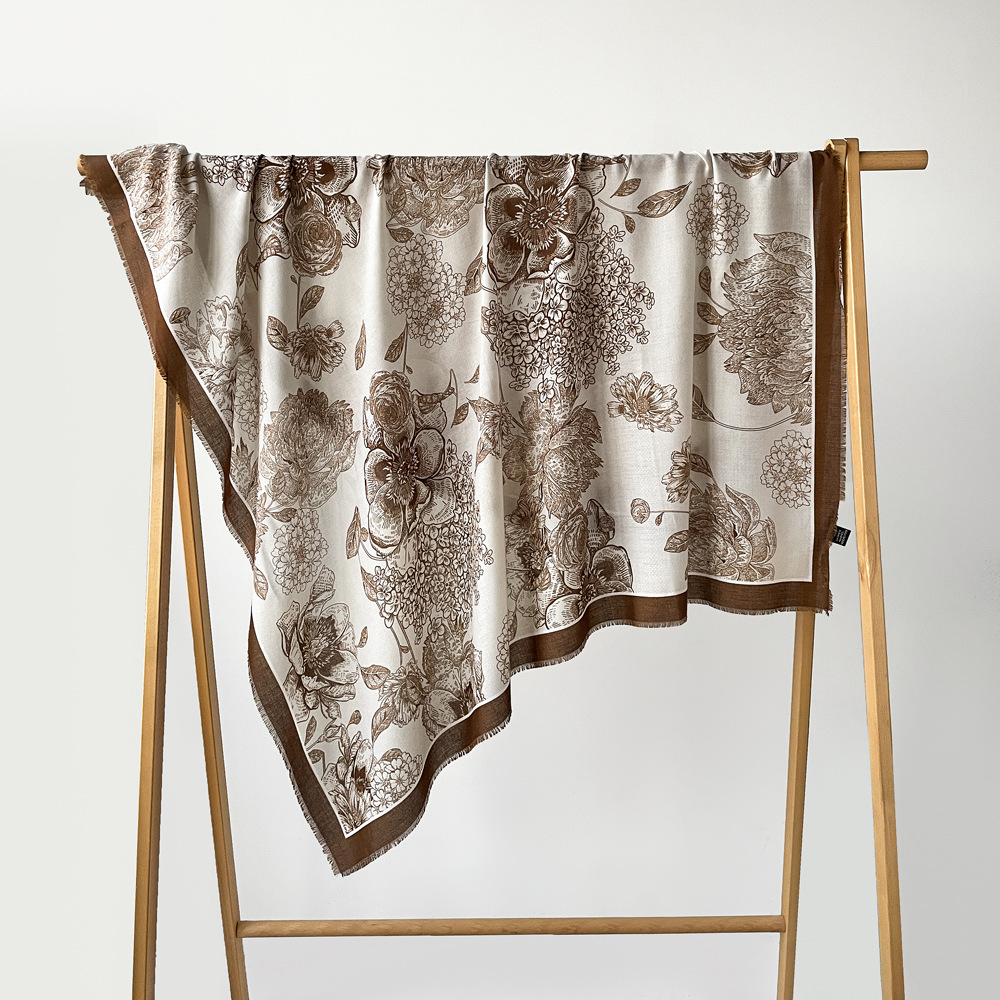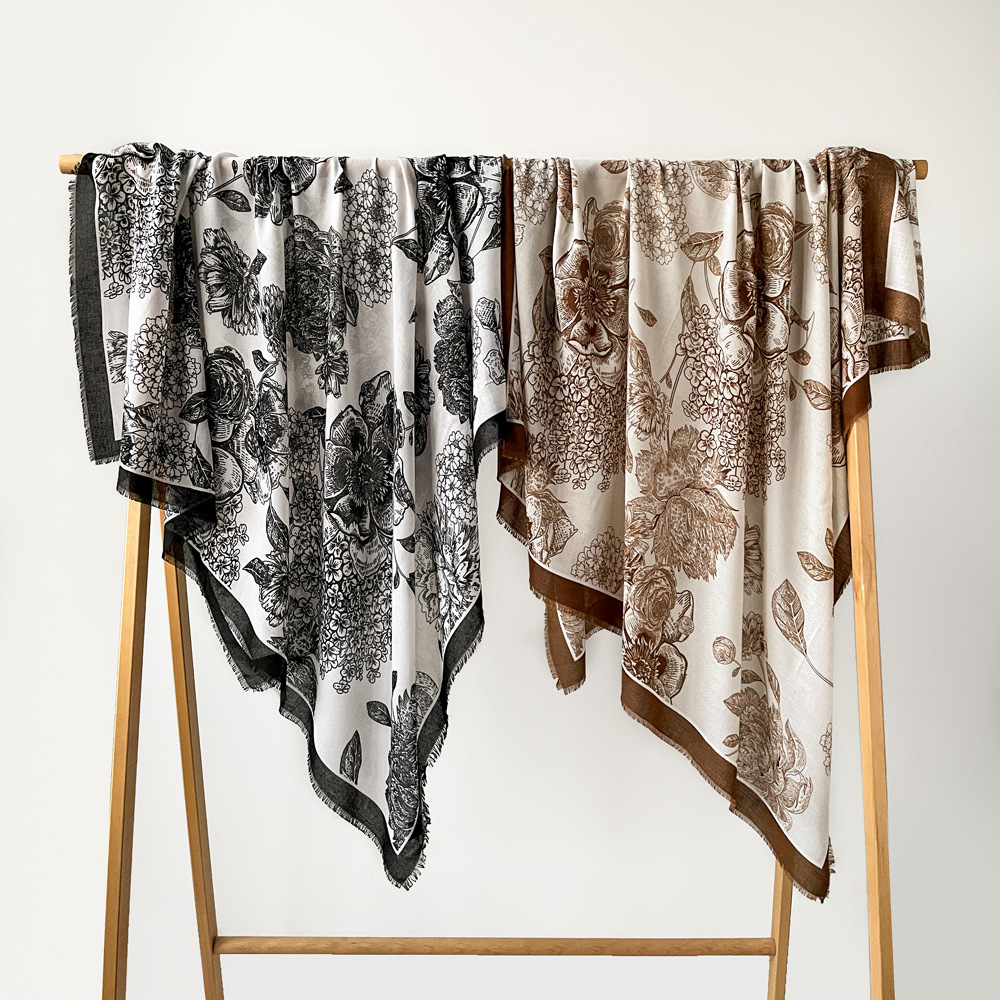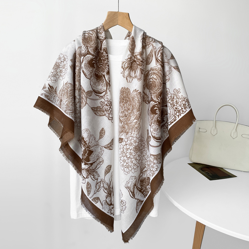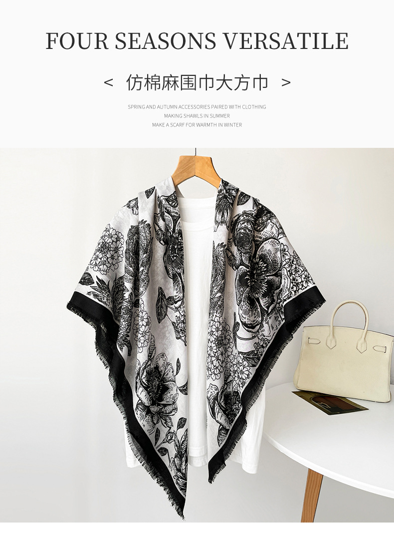 秋冬棉麻手感围巾新款散须方巾时尚气质时尚简约花卉印花披肩批发
