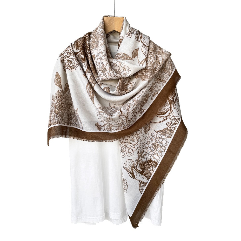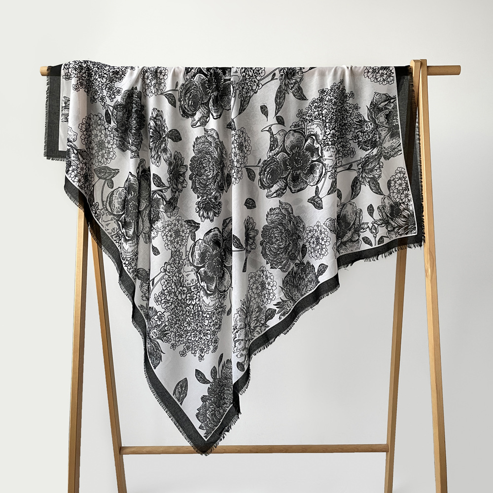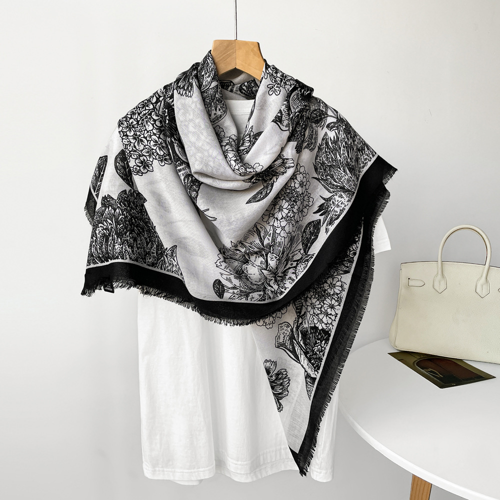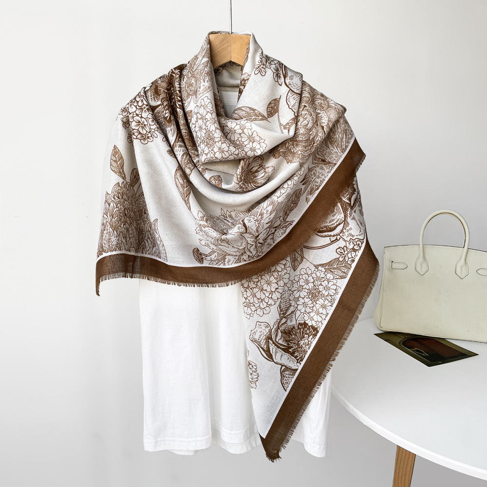 秋冬棉麻手感围巾新款散须方巾时尚气质时尚简约花卉印花披肩批发