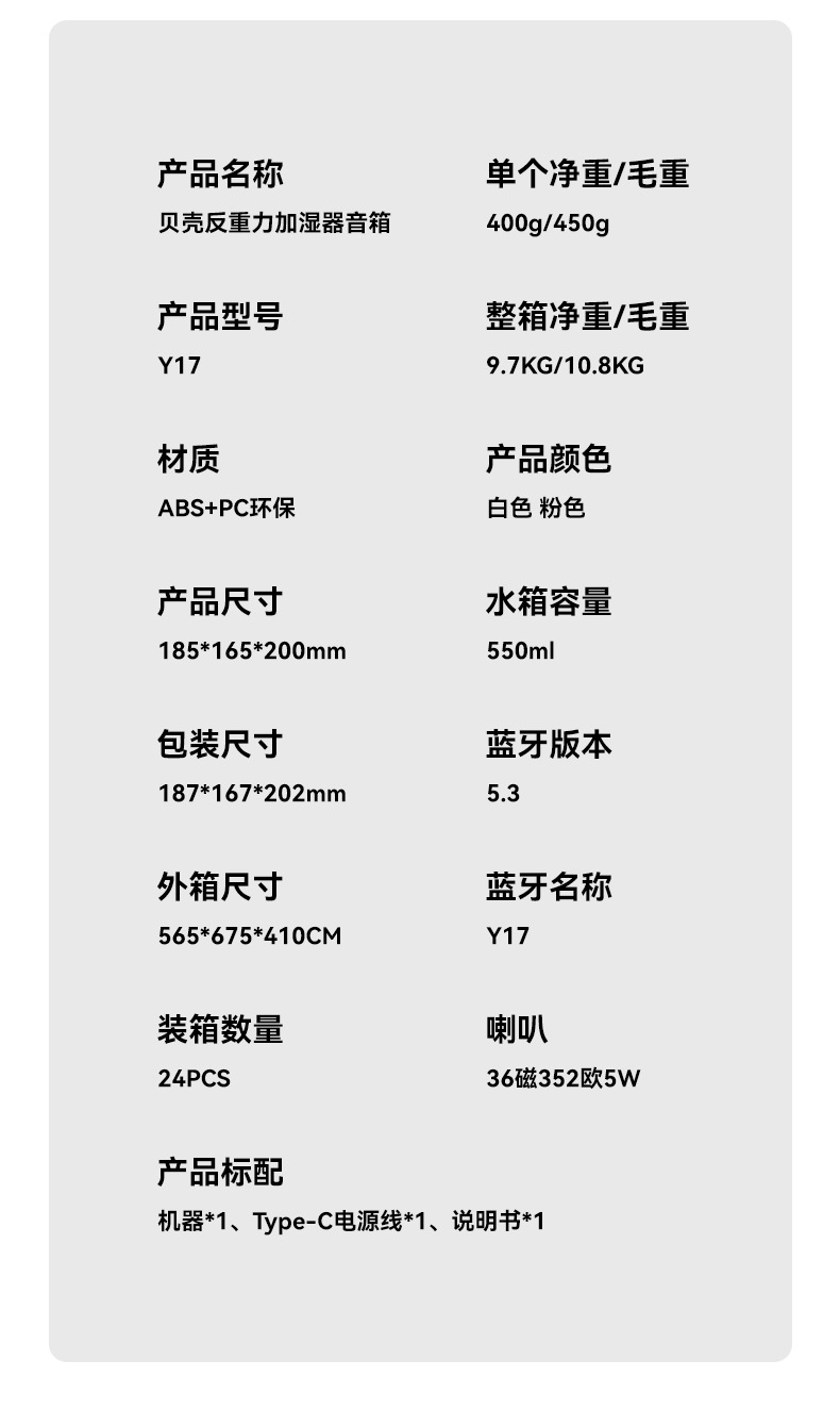 | Y17 贝壳音箱加湿器 | ¥0 | 3000台可售 |