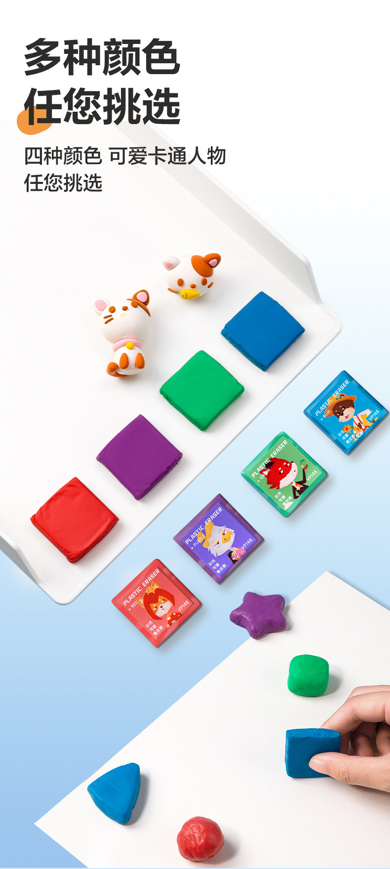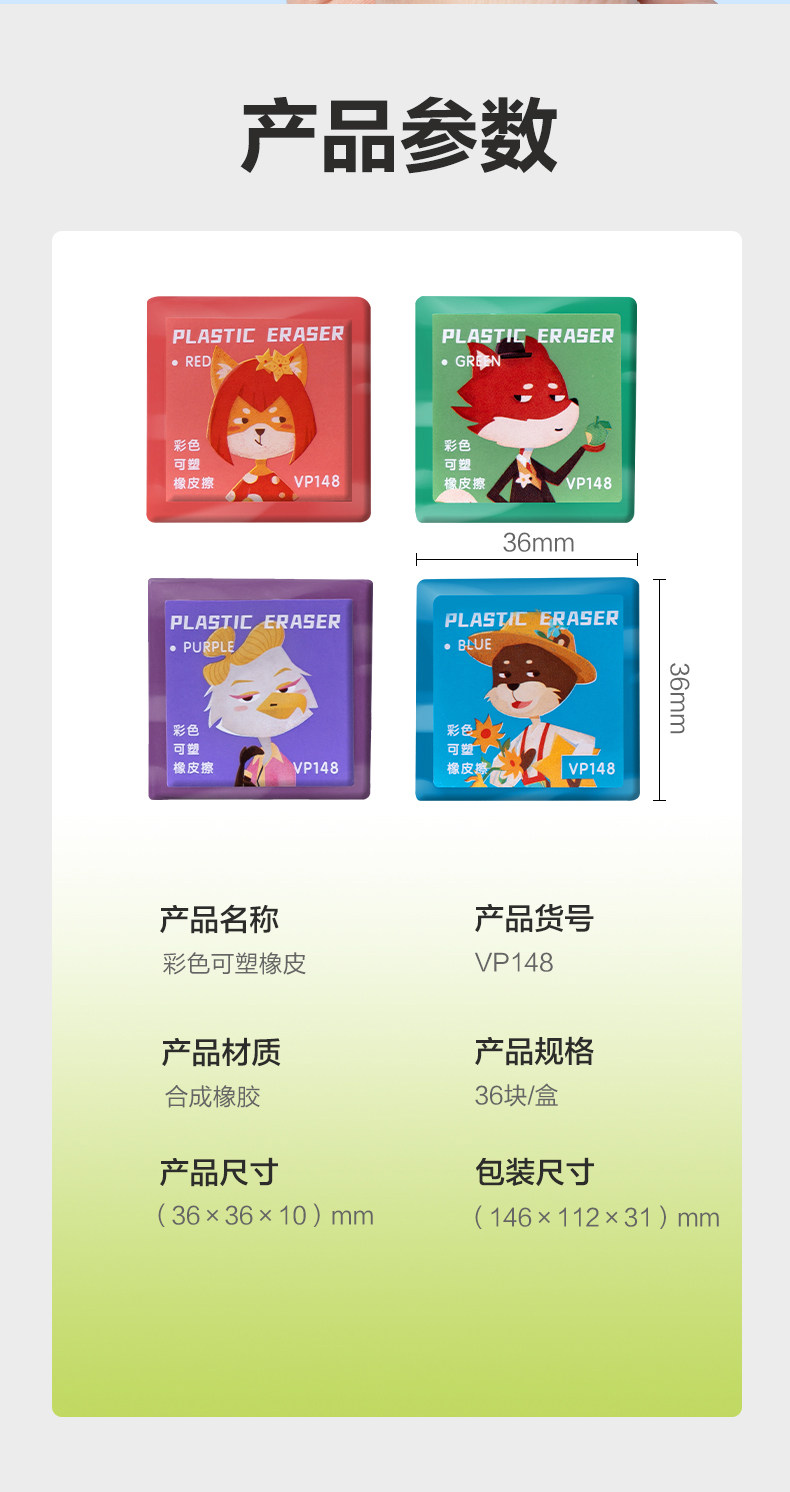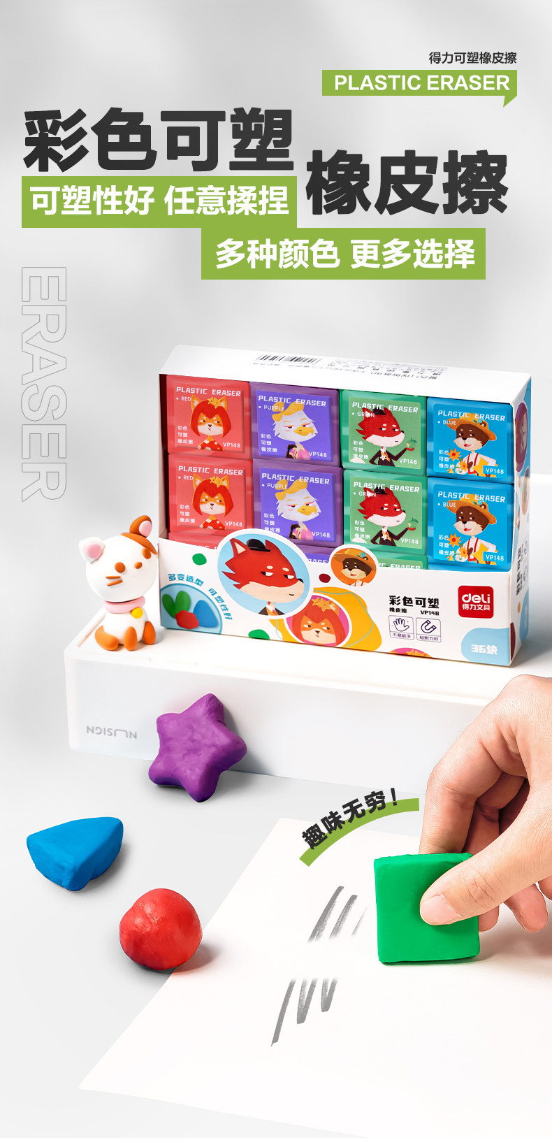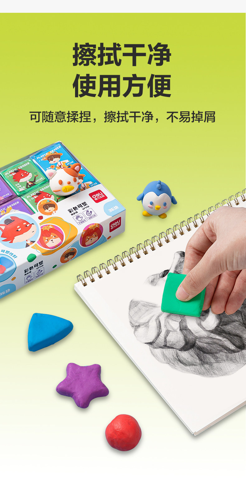 品牌: Deli/得力 货号: VP148 型号: VP148 材质: 合成橡胶 规格: 彩色1块装★可塑性强 造型: 卡通 用途: 素描绘画 加印LOGO: 不可以 加工定制: 否 净重: 0.0220