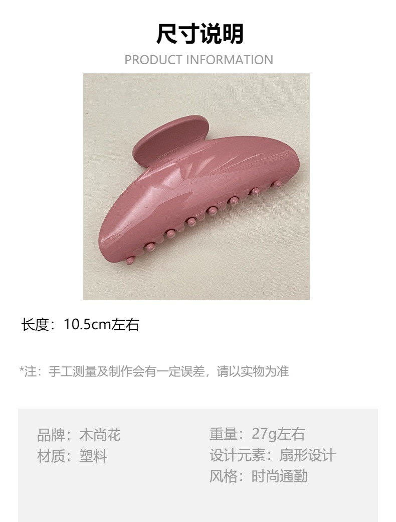 材质: 33815501 货号: 0661J 品牌: 木尚花 处理工艺: 手工 发夹分类: 抓夹 产地: 义乌 主要下游平台: 淘宝,京东,ebay,PDD,亚马逊,w 颜色: 奶白色,奶粉色,果冻白,玫粉色 有可授权的自有品牌: 是 是否跨境出口专供货源: 是 流行元素: 线条 上市年份/季节: 2023年夏季 风格: 简约 风格分类: 时尚通勤 主要销售地区: 非洲,欧洲,南美,东南亚,北美,东北亚, 适用人群: 女式 流行元素分类: 几何