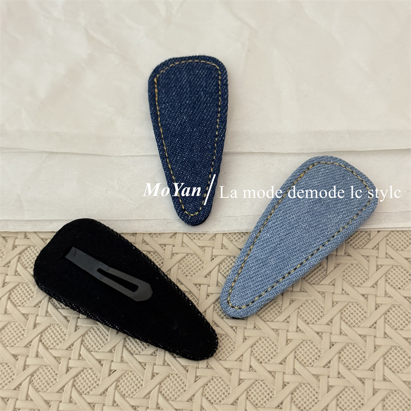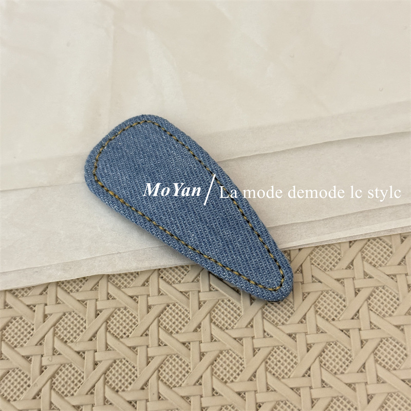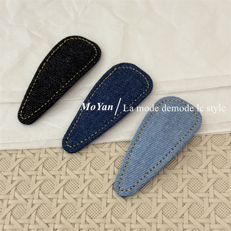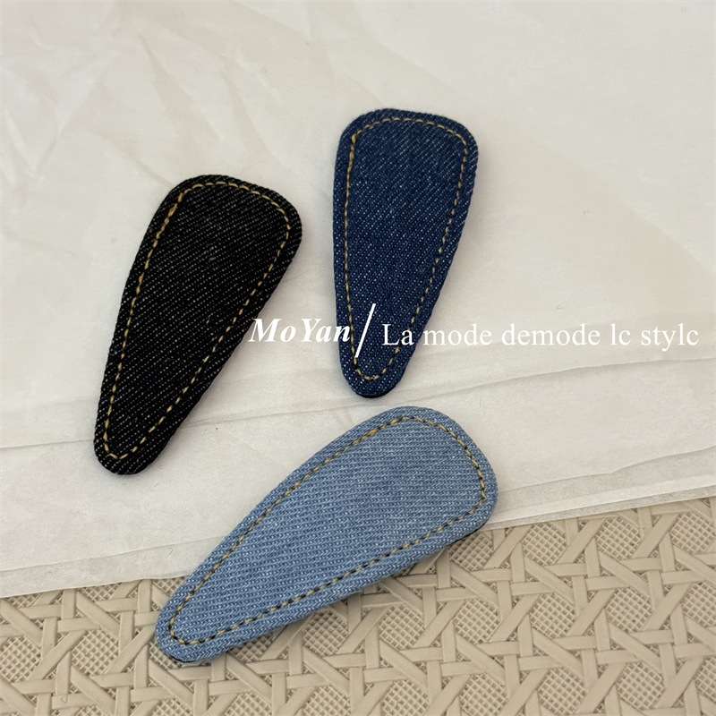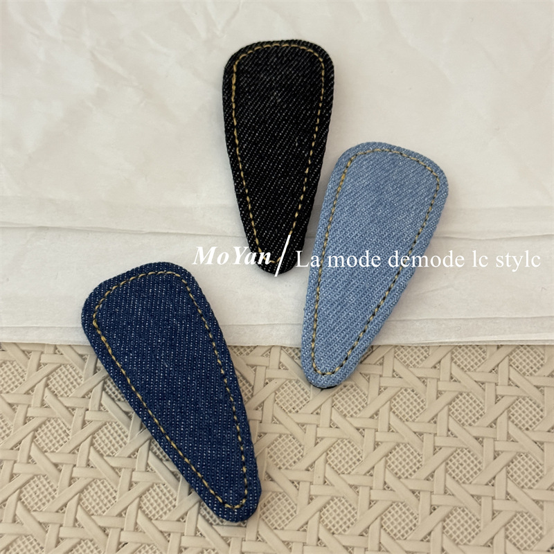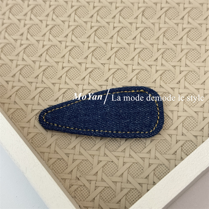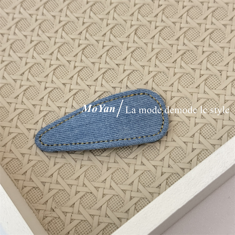 材质: 12200515 货号: 0459J 品牌: 沫妍 样式: 牛仔发夹 处理工艺: 手工 发夹分类: BB夹 产地: 义乌 主要下游平台: 淘宝,京东,ebay,PDD,亚马逊,w 颜色: 牛仔浅蓝,牛仔深蓝,牛仔黑色 有可授权的自有品牌: 是 是否跨境出口专供货源: 是 流行元素: 三角形 上市年份/季节: 2025年春季 风格: 复古 风格分类: 文艺复古 主要销售地区: 非洲,欧洲,南美,东南亚,北美,东北亚, 适用人群: 女式 流行元素分类: 几何