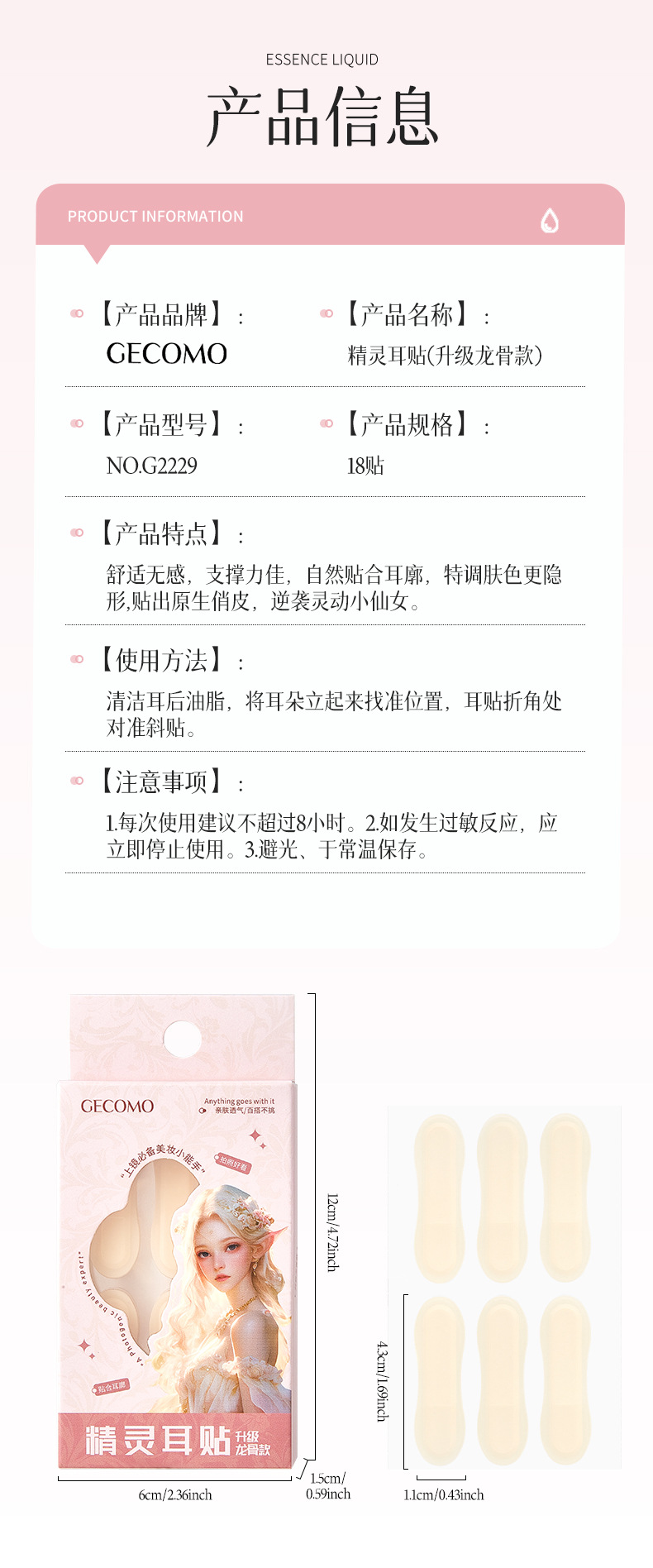 美妆工具分类: 其它化妆/美容工具 品牌: GECOMO/格蒙 是否进口: 否 货号: G2229 净含量: 见详情 产地: 广州 颜色分类: 精灵耳贴(升级龙骨款) 是否跨境出口专供货源: 否 适用人群: 普通人群 尺寸: 见详情 重量: 0.291 kg/个