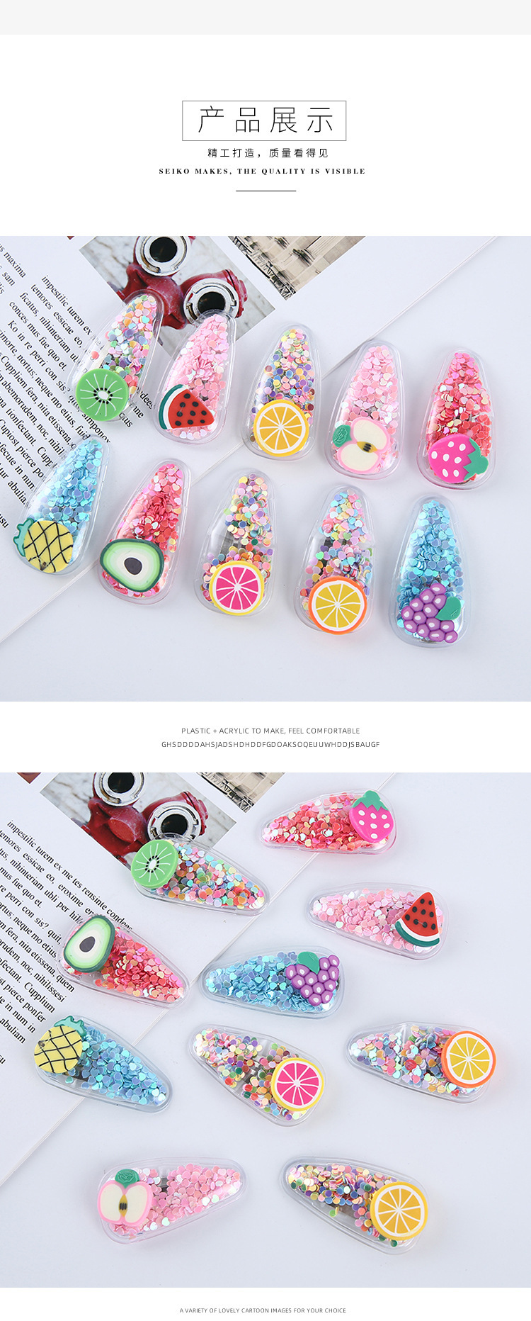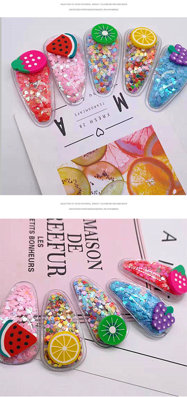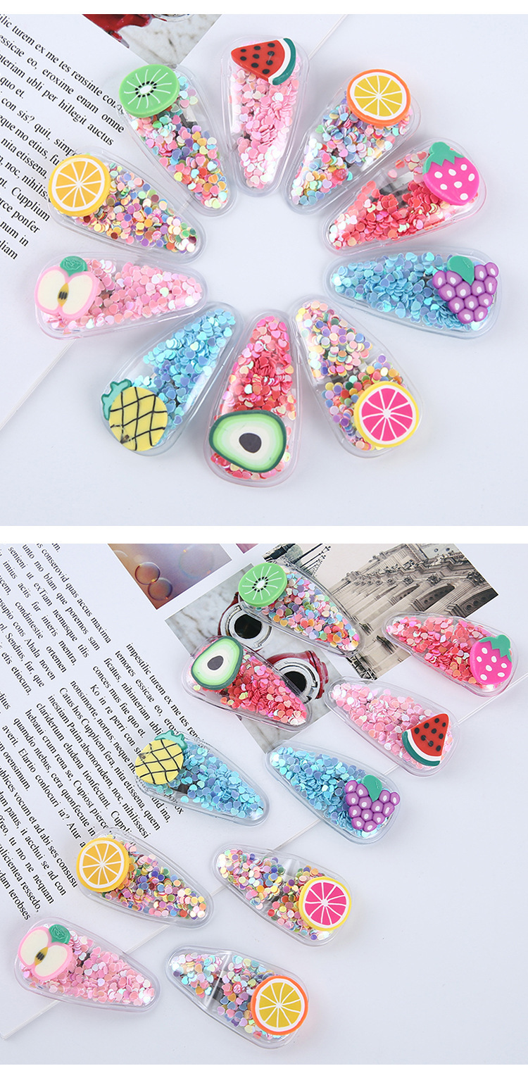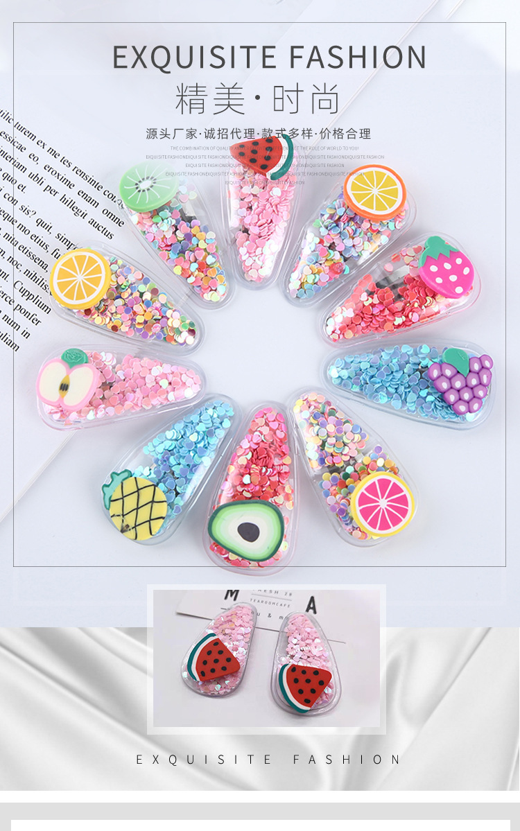 网红新款彩色流沙透明儿童水果发夹PVC边夹宝宝BB侧边夹头饰品 English | 投诉