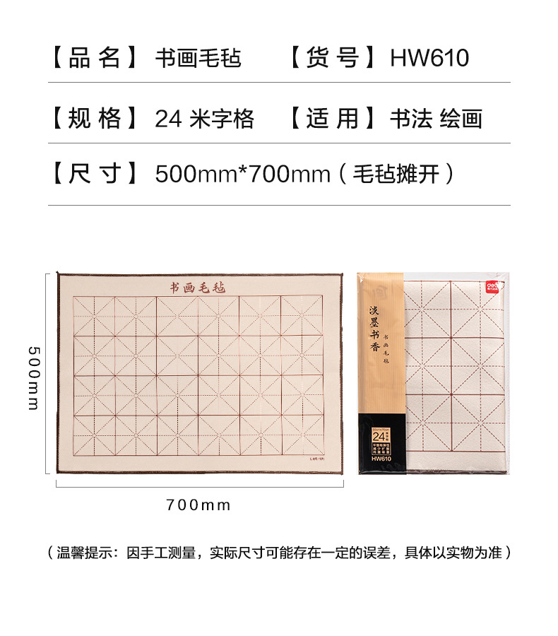 品牌: Deli/得力 货号: HW610 材质: 毛毡 颜色: HW610书画毛毡50*70cm(白) 用途: 基础用品 适合墨水: 颜料 长度: 70cm 宽幅: 50cm 是否进口: 否 开本: 其他