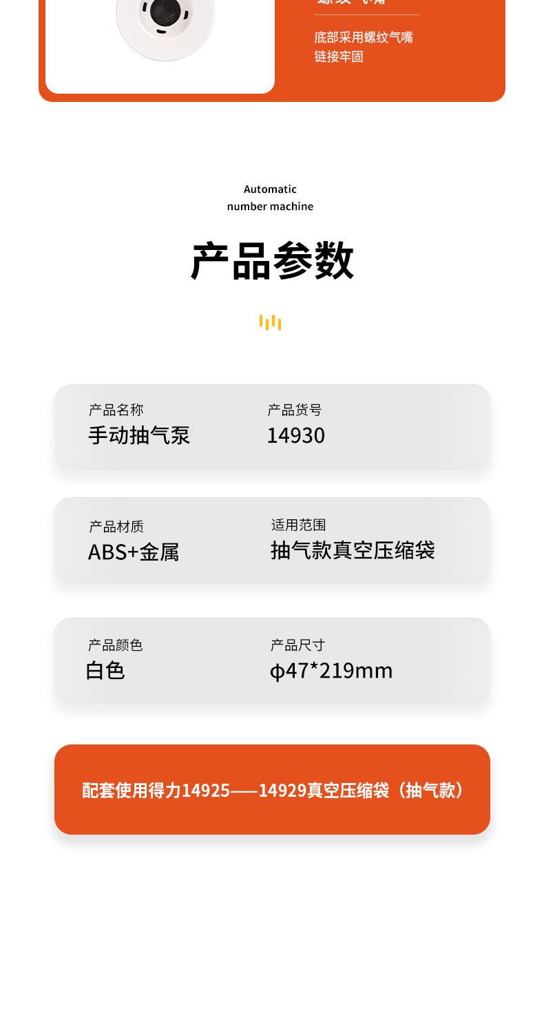 品牌: Deli/得力 材质: ABS 货号: 14930/LM111 规格: 手动抽气泵-14930,电动抽气泵-LM 适用送礼场合: 其他 加印LOGO: 不可以 加工定制: 否 是否跨境出口专供货源: 否 是否专利货源: 否 是否IP授权: 否