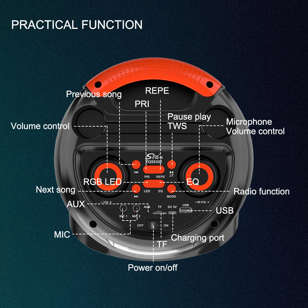 带蓝牙/带收音/+带显示屏/AUX/USB/TF卡/MIC、DC-5V充电(Type-C充电座+USB带5V升压/带锂电保护/功放升压/电位器音量、带无线麦功能+8691双功放+高音/带七彩灯/七彩灯受MODE控制、对箱功能