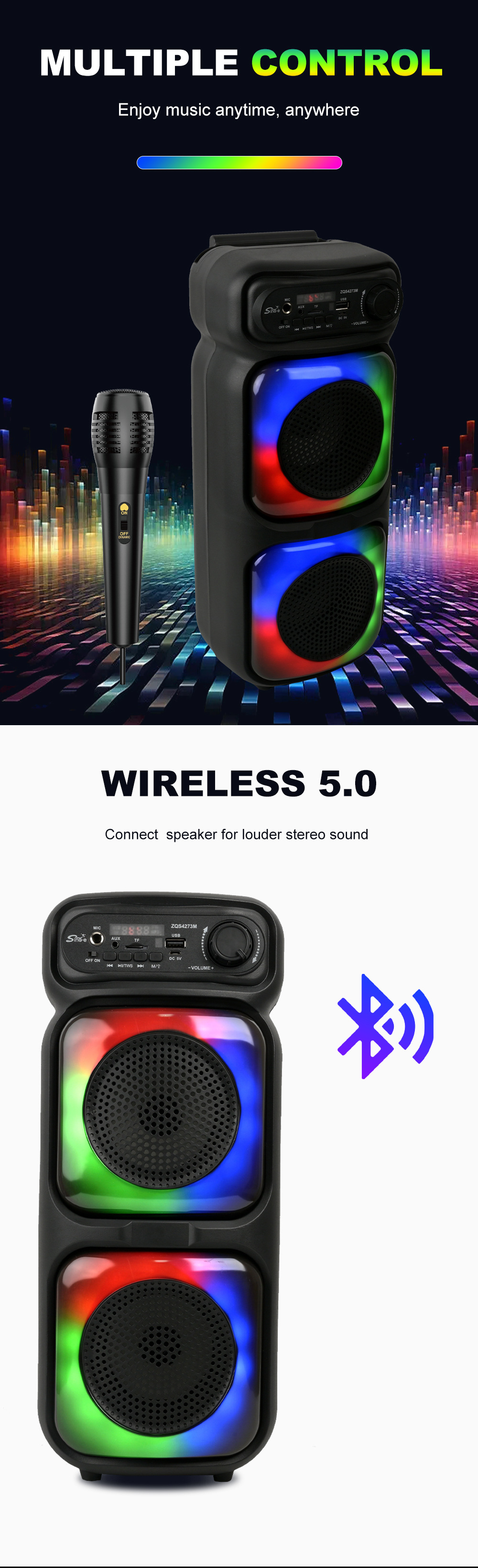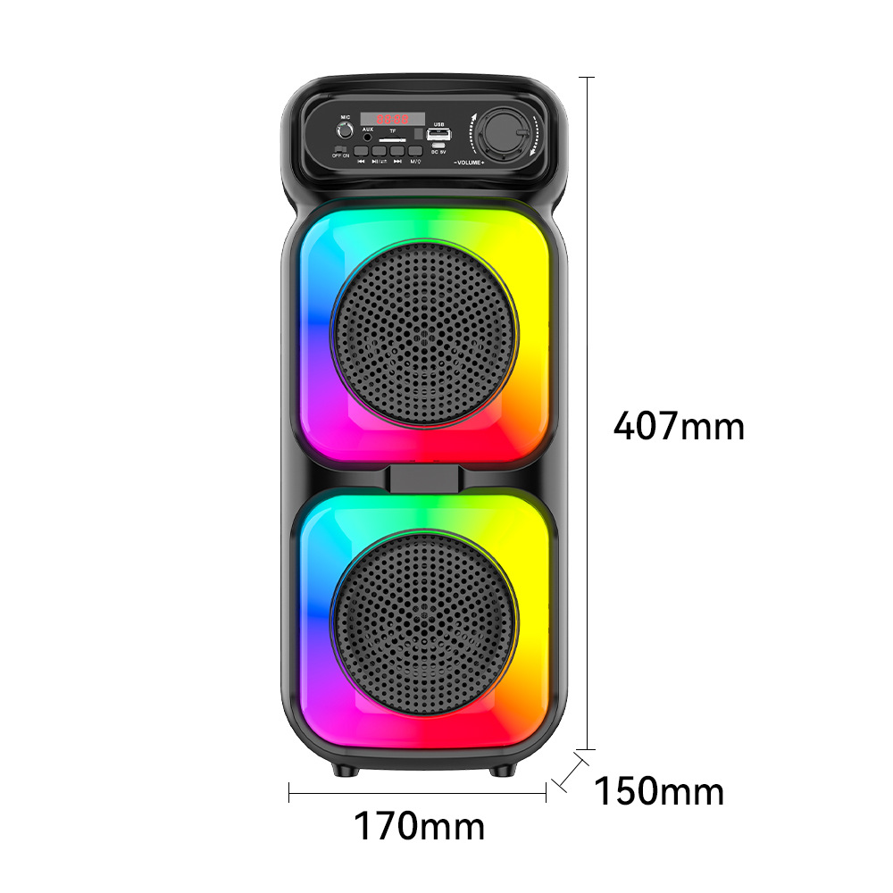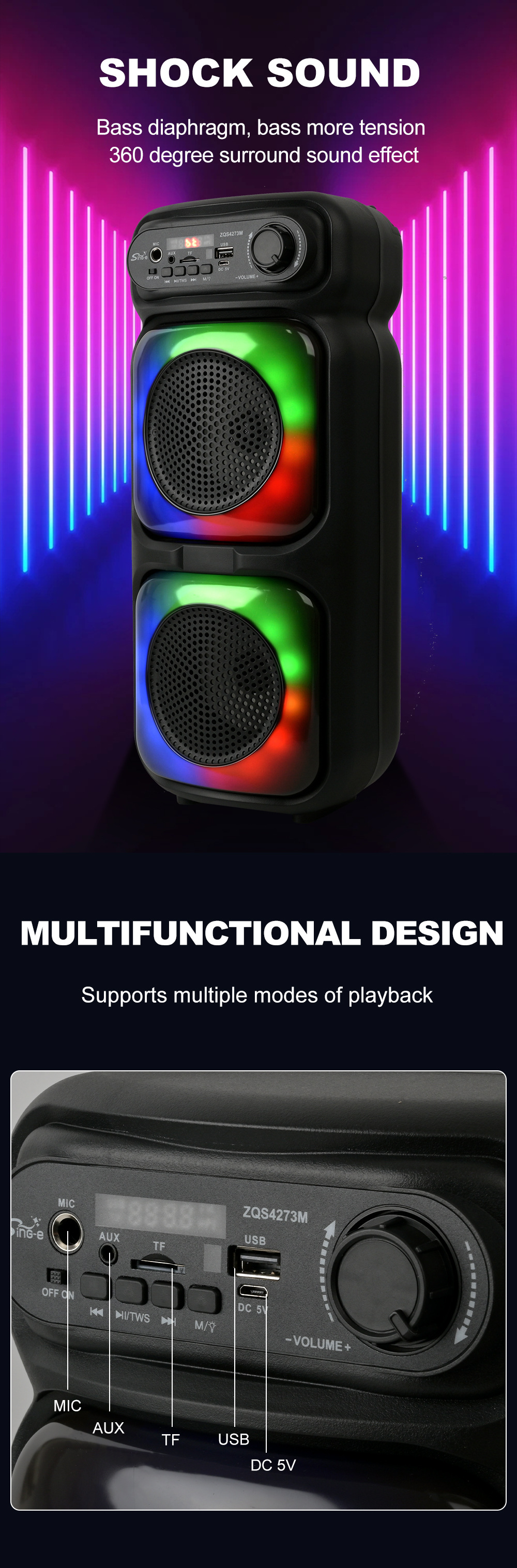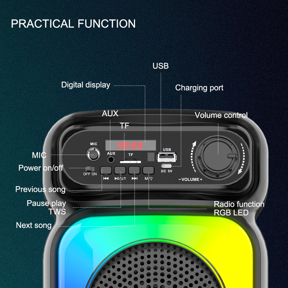 带蓝牙/带收音/带遥控(接收头装主板)/电位器音量,带USB/TF卡/MIC、DC-5V充电/带AUX(带3.5音频座)双功放,假双声道/带锂电保护,带显示屏/USB不升压、对箱功能,带幻彩灯+七彩灯、幻彩灯+七彩灯都受MOD控制