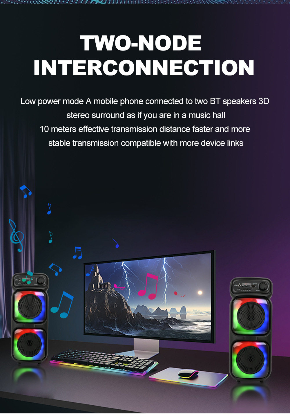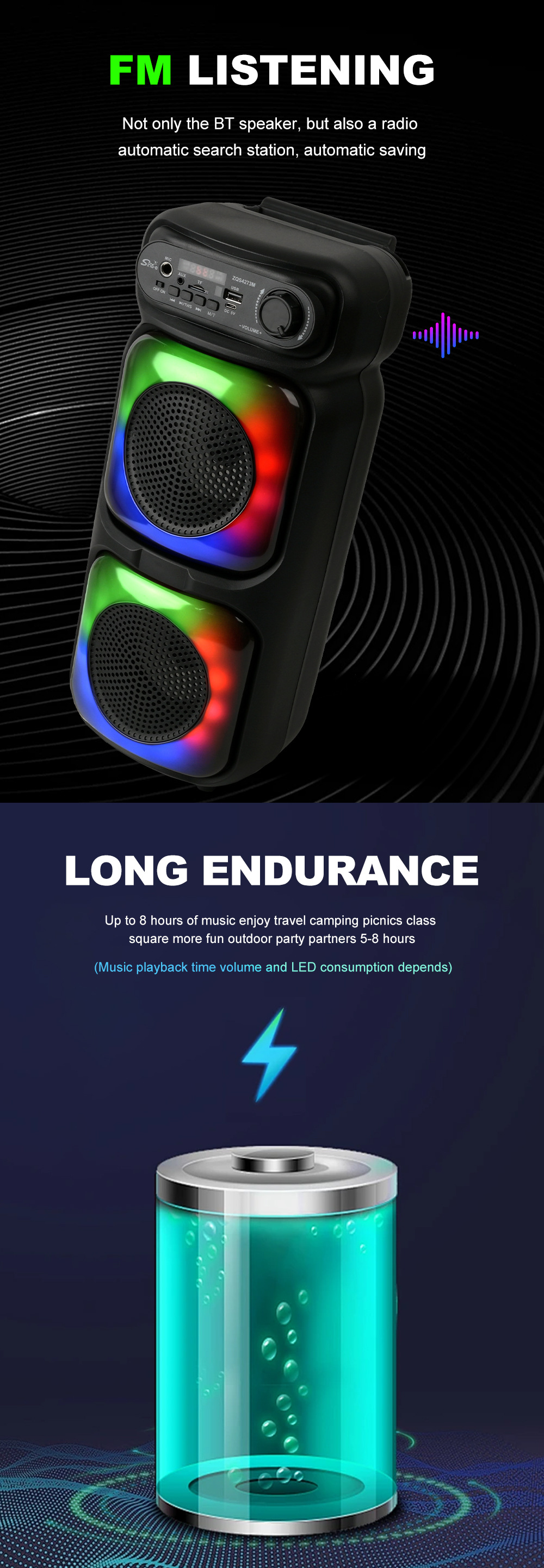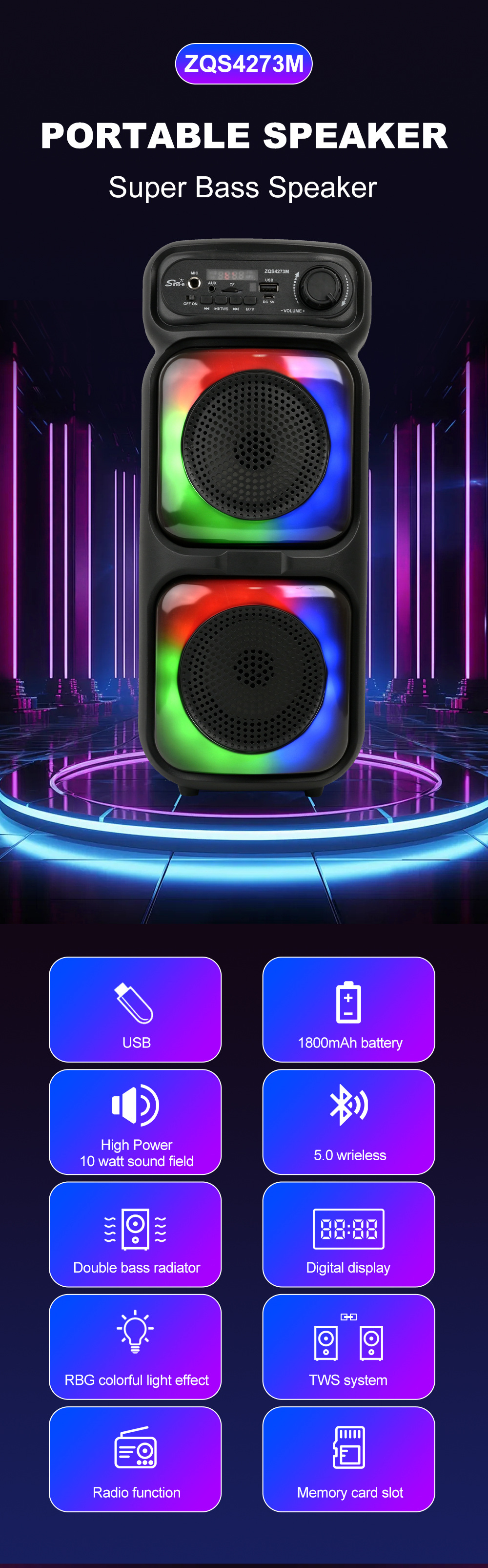 带蓝牙/带收音/带遥控(接收头装主板)/电位器音量,带USB/TF卡/MIC、DC-5V充电/带AUX(带3.5音频座)双功放,假双声道/带锂电保护,带显示屏/USB不升压、对箱功能,带幻彩灯+七彩灯、幻彩灯+七彩灯都受MOD控制