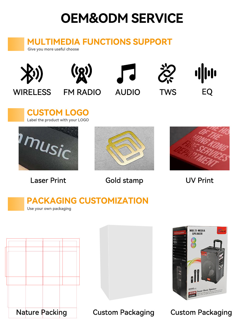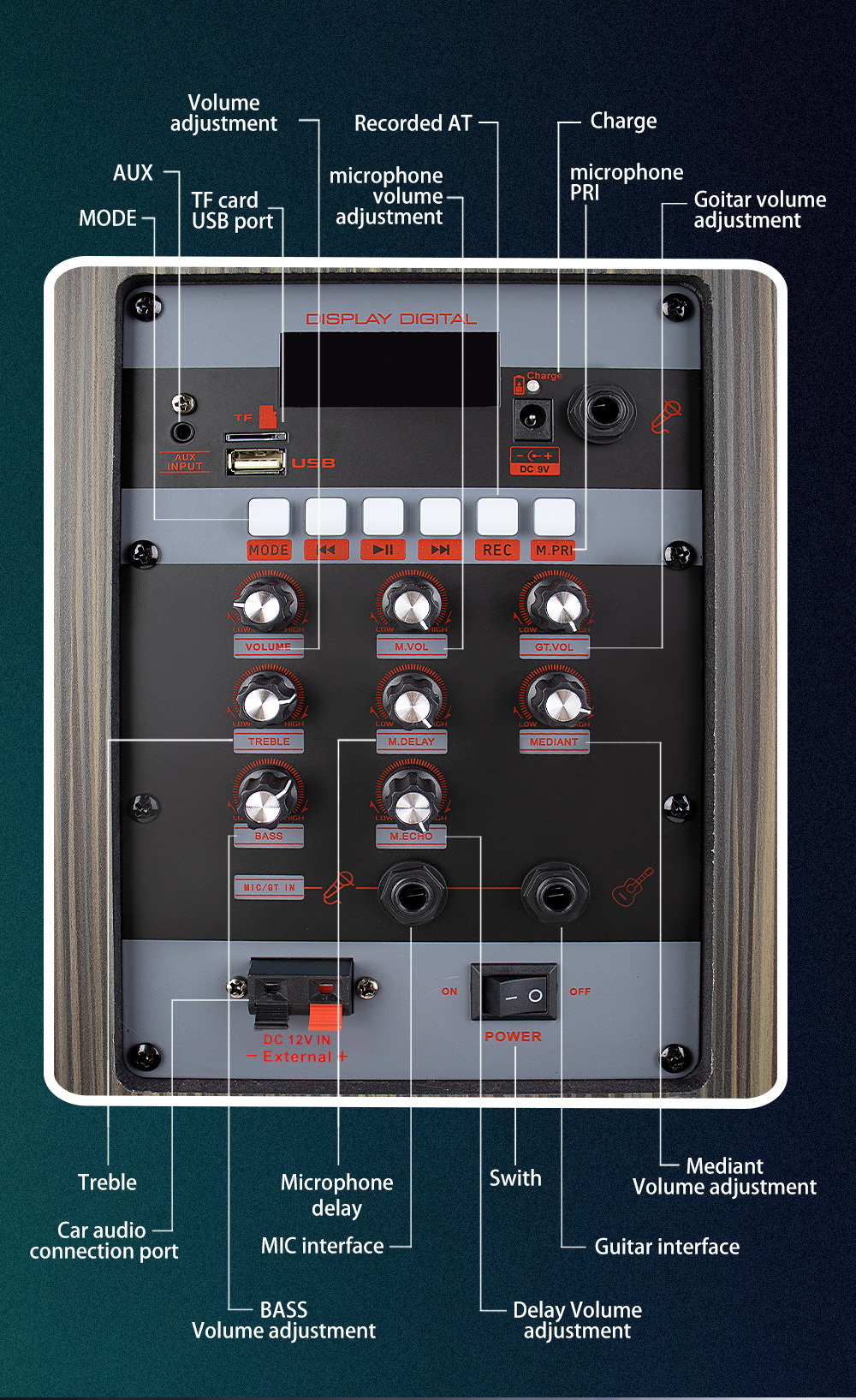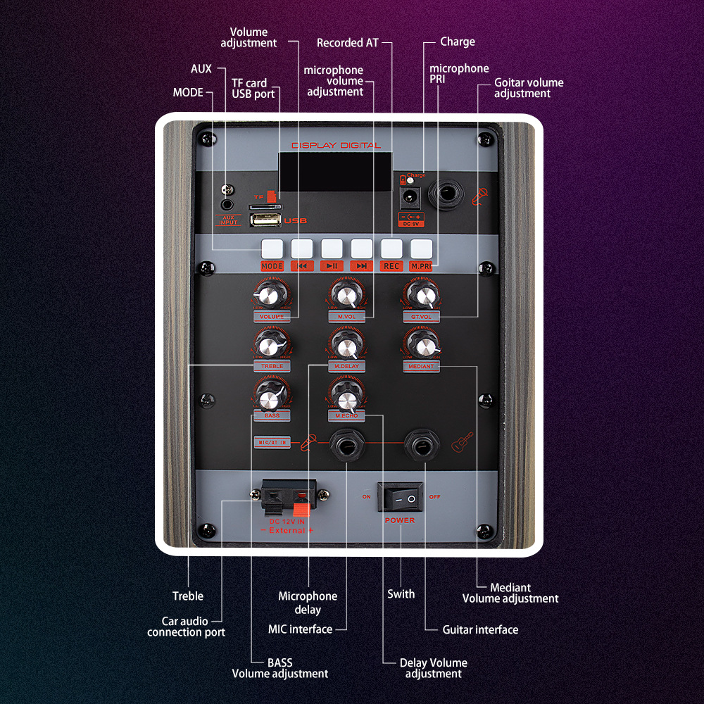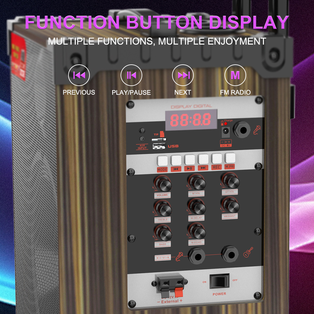 带BT/USB/TF卡/AUX/FM/MICx2/GT,REC/M.PRI/TWS+VOL+TRE+BASS/M.VOL+M.DELAY+MEDIANT+M.ECHO/GT.VOL+带显示屏/DC-5.5-9V充电/12V供电输入+POWER船形开关