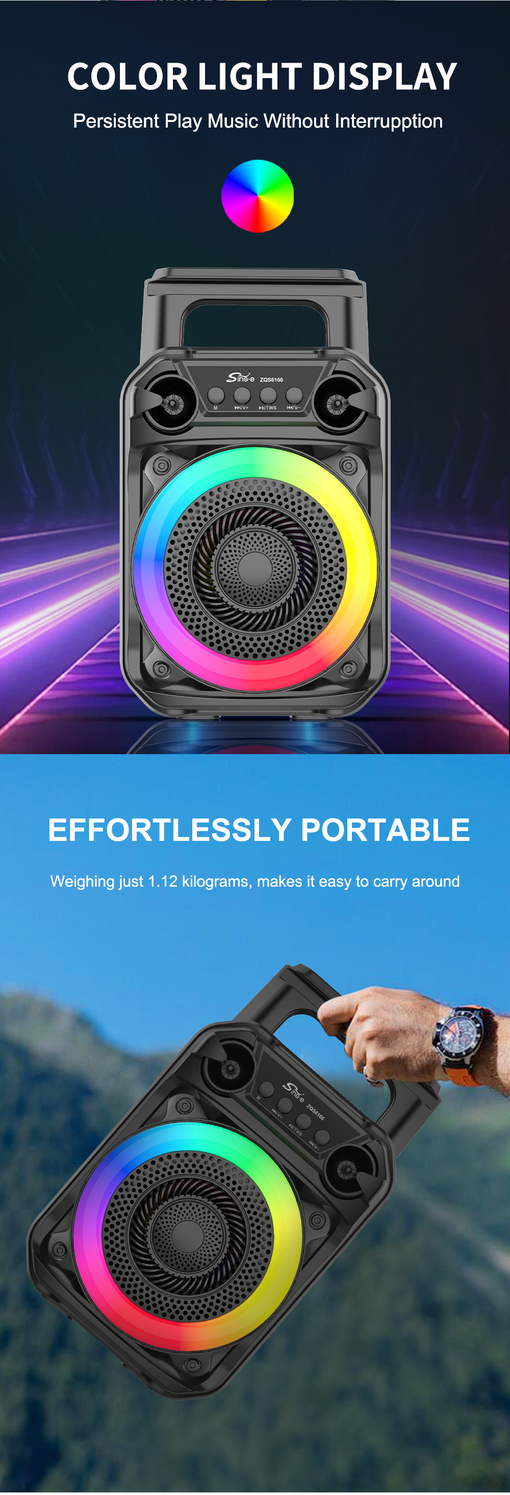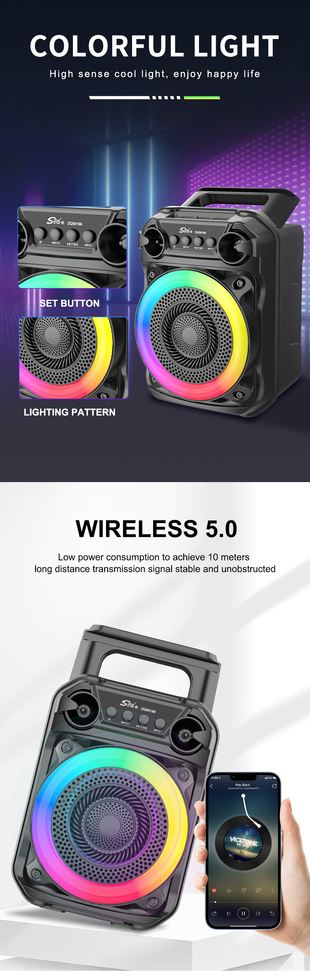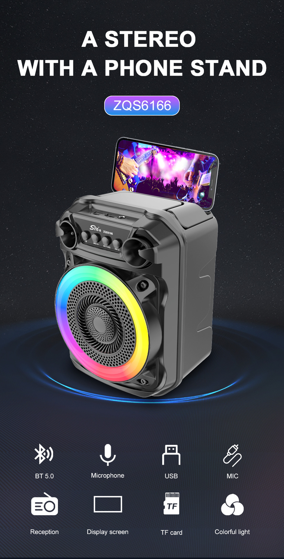带蓝牙/带收音/带麦克风/无遥控+无屏/USB/TF卡/MIC/DC-5V充电/+USB不升压/带充电管理IC/按键音量+七彩灯不受MODE控制、对箱功能 电池规格:18650/3.7V/1200MAH