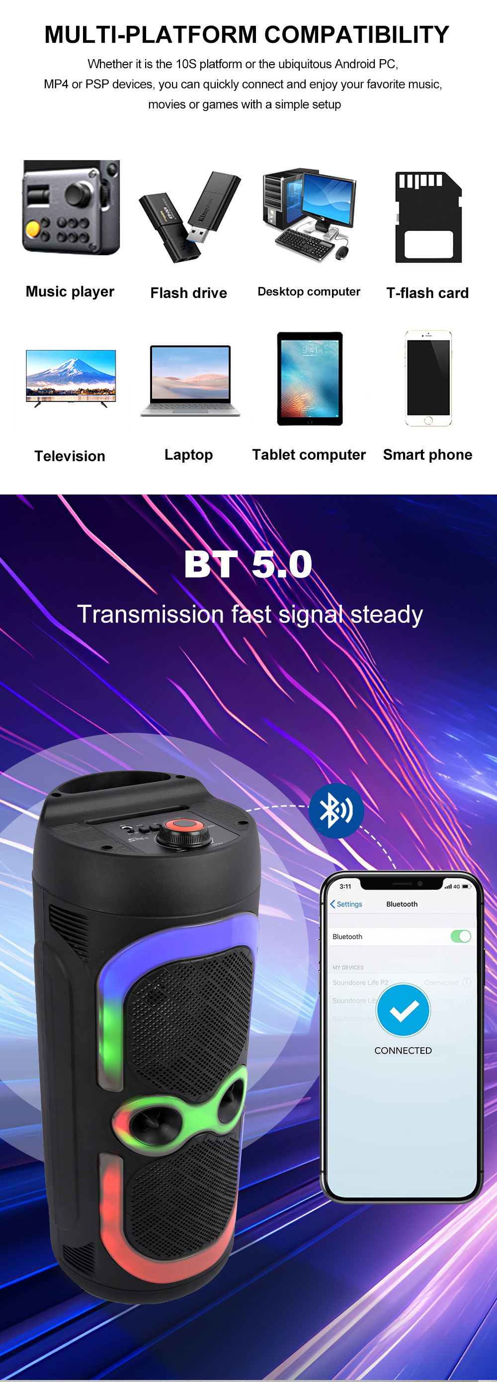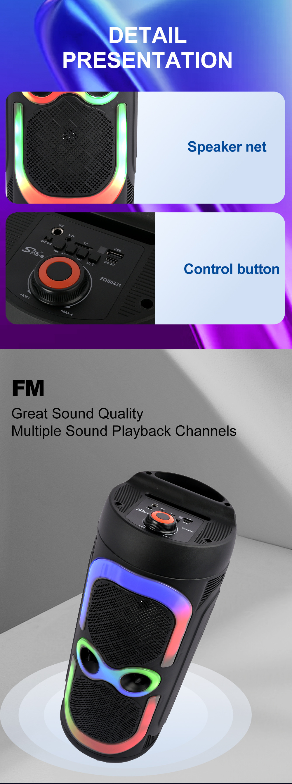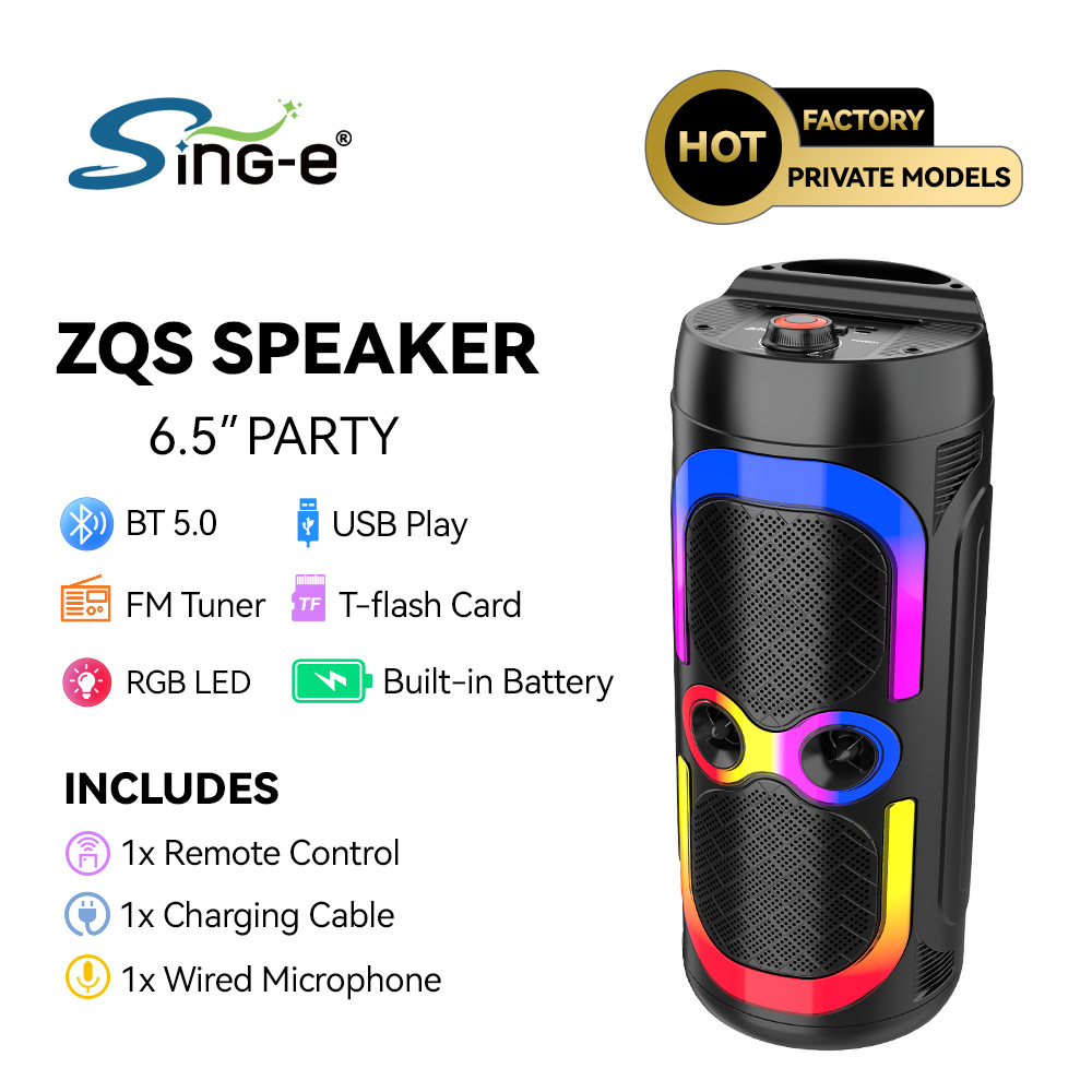 带BT/USB/TF卡/FM/MIC/AUX、DC-5V充电(Type-c座)+5W双功放、无屏、带遥控