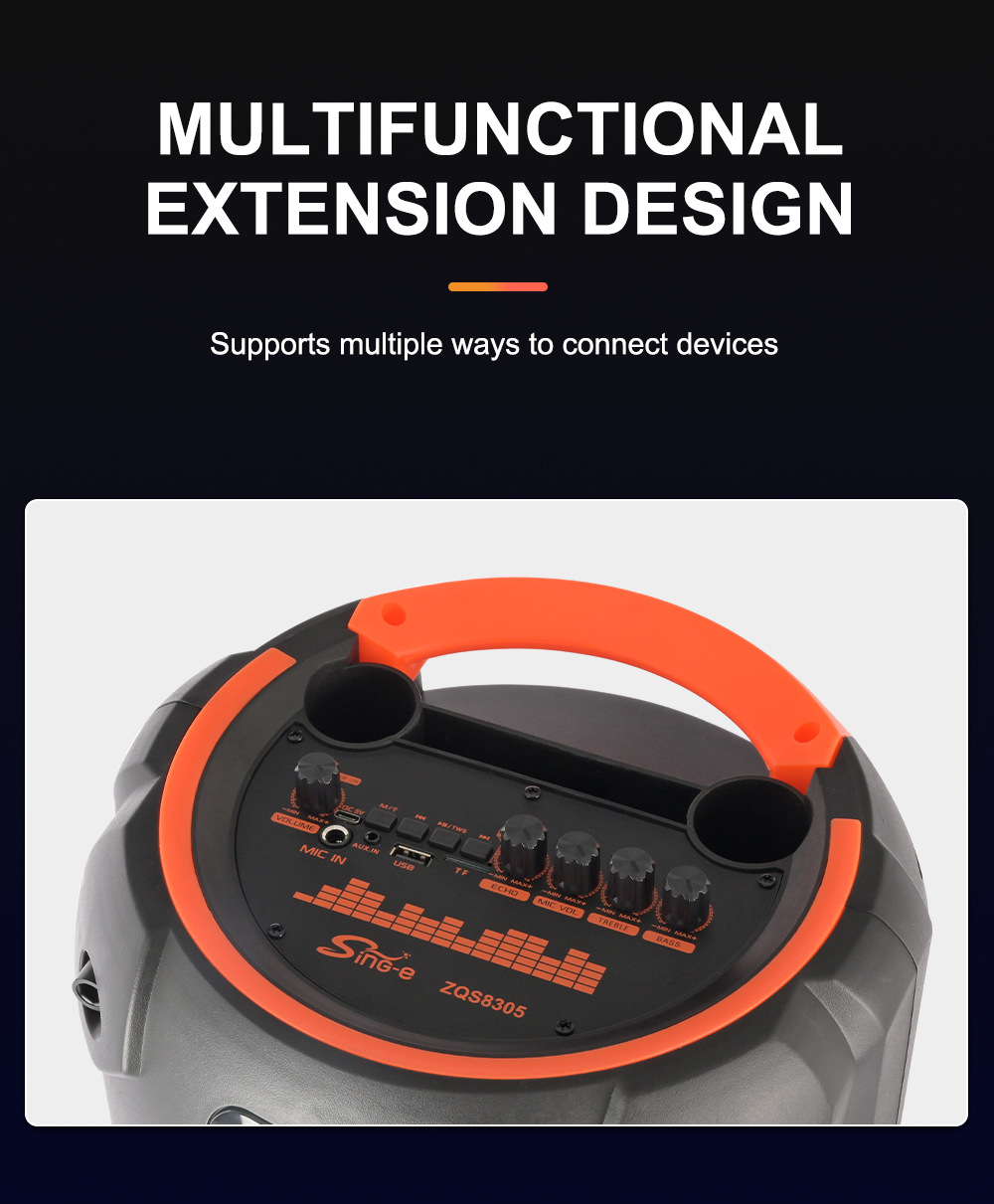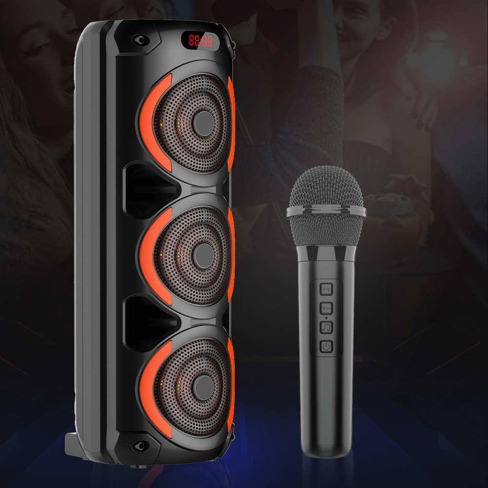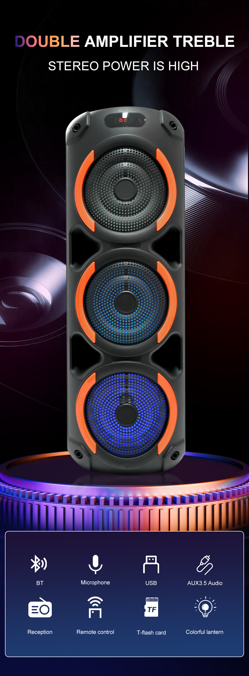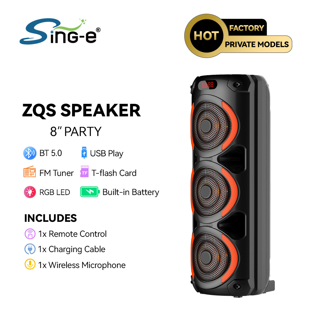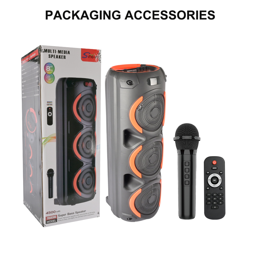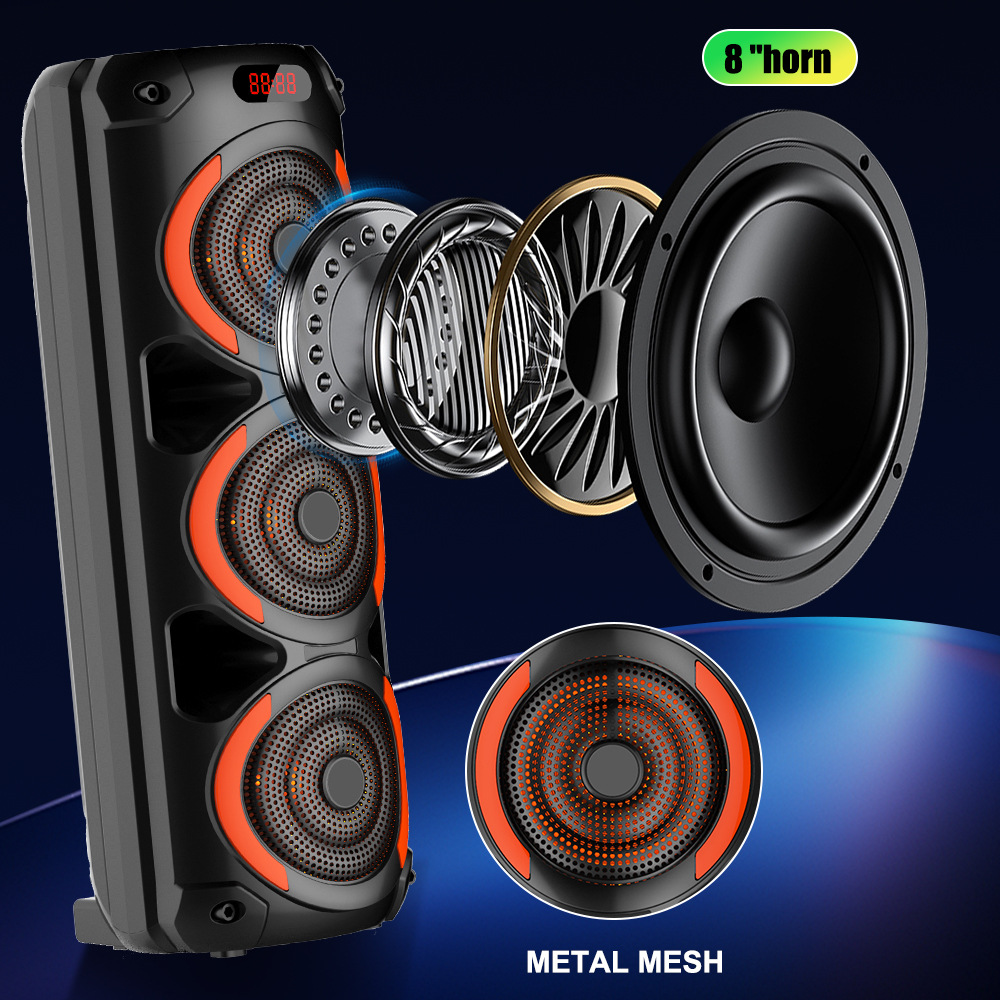 带蓝牙/带收音/带MIC/带遥控,带显示屏/带AUX/USB/TF卡/MIC、DC-5V充电(Type-C充电座+USB带5V升压/带锂电保护/功放升压/电位器音量、带无线麦功能,双功放+高音/带七彩灯/七彩灯受MODE控制、对箱功能