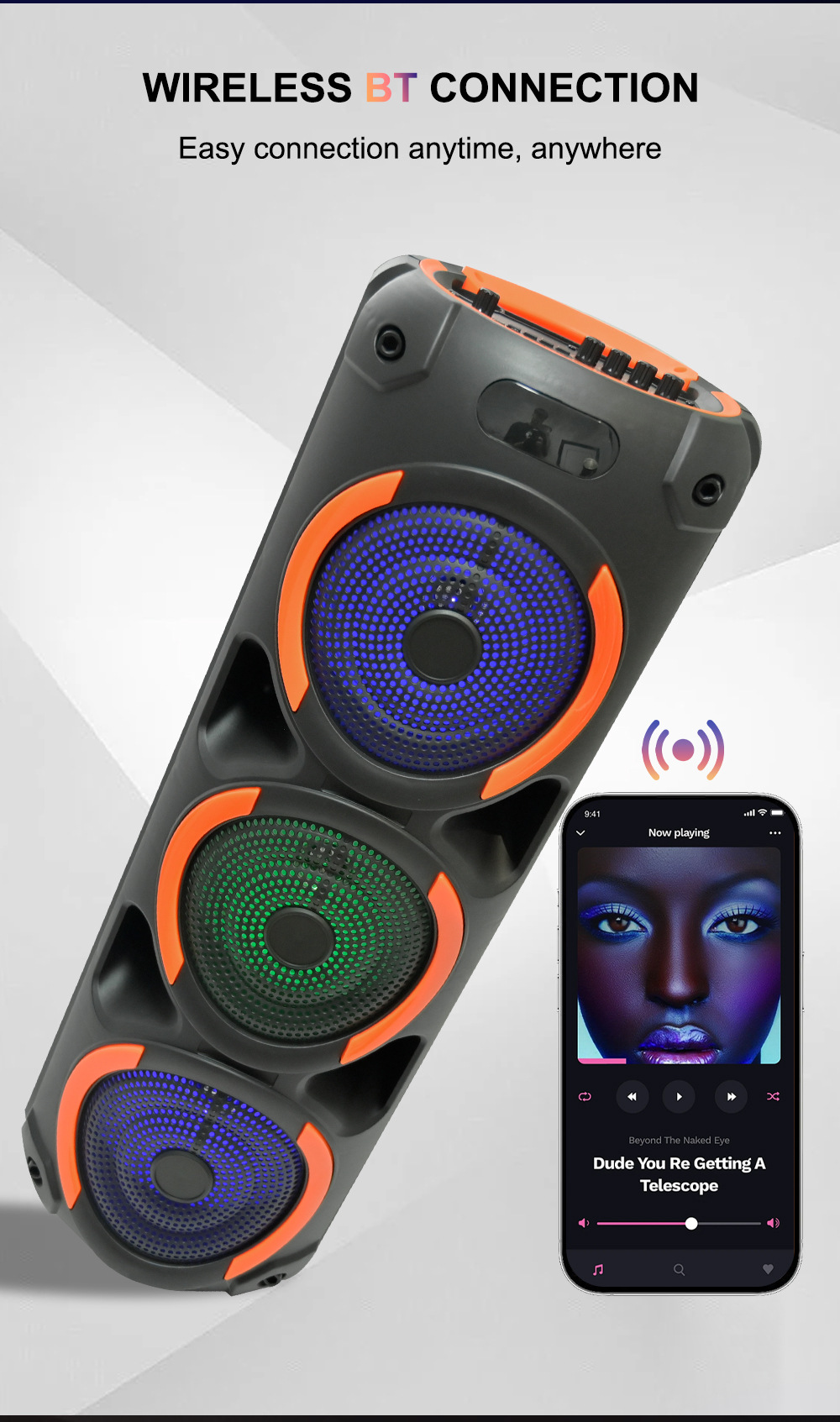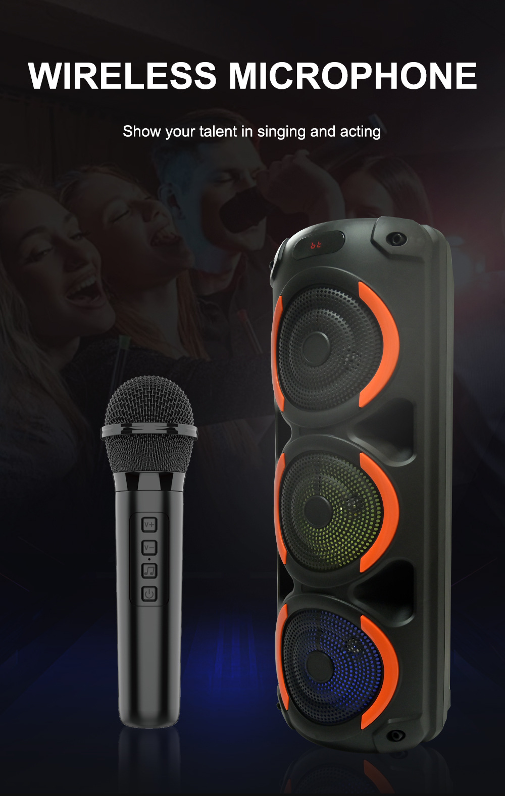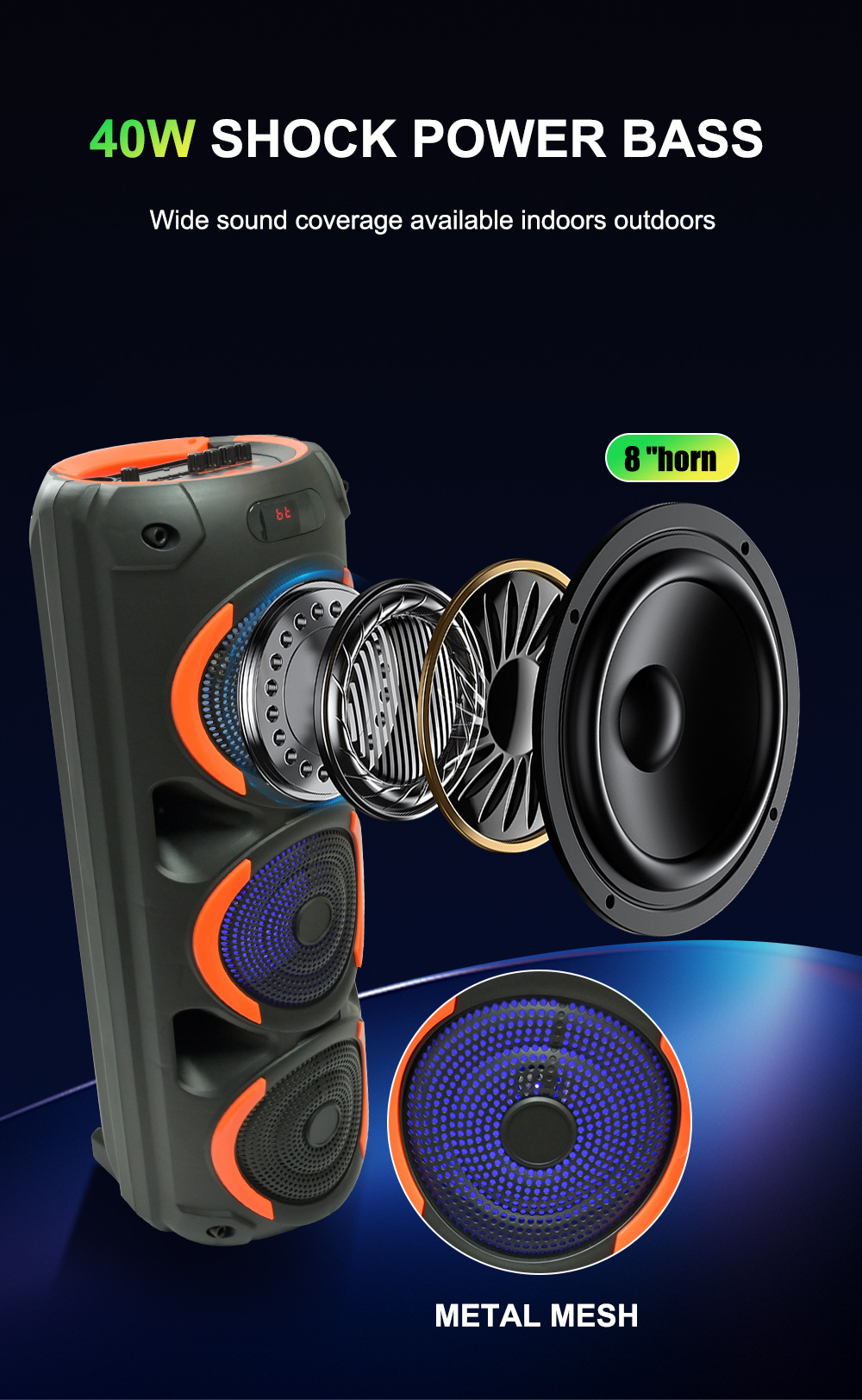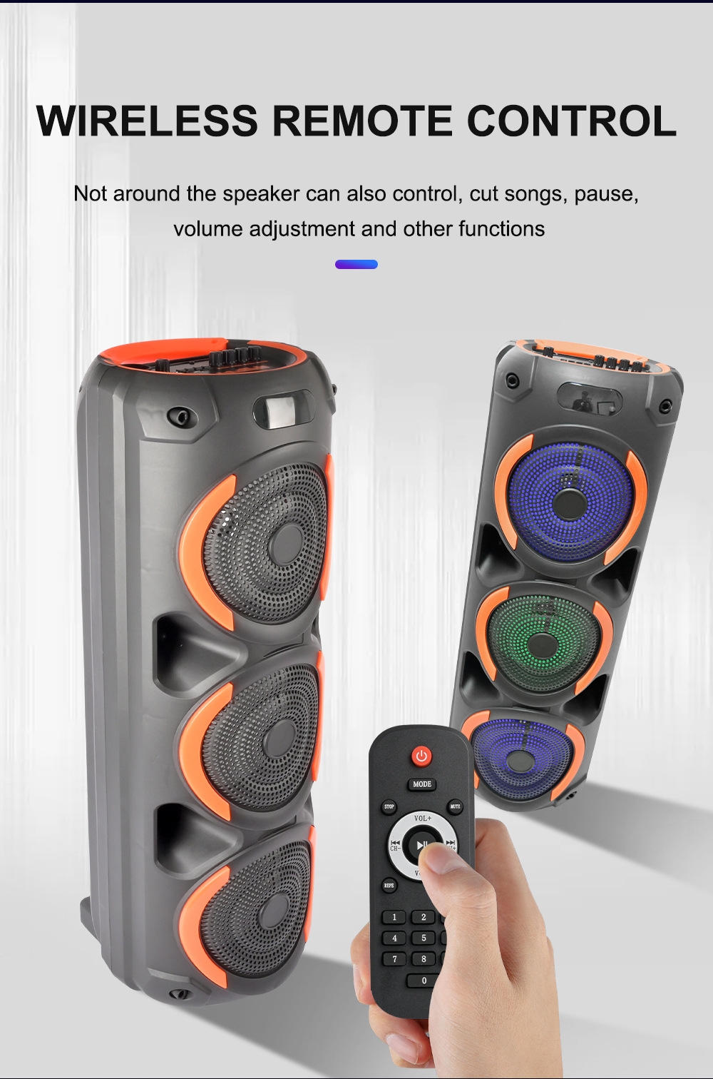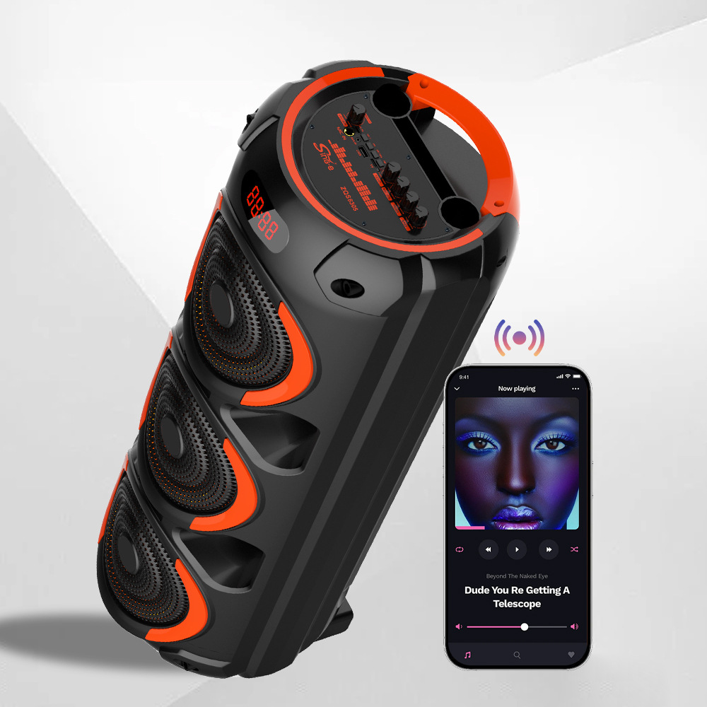 带蓝牙/带收音/带MIC/带遥控,带显示屏/带AUX/USB/TF卡/MIC、DC-5V充电(Type-C充电座+USB带5V升压/带锂电保护/功放升压/电位器音量、带无线麦功能,双功放+高音/带七彩灯/七彩灯受MODE控制、对箱功能