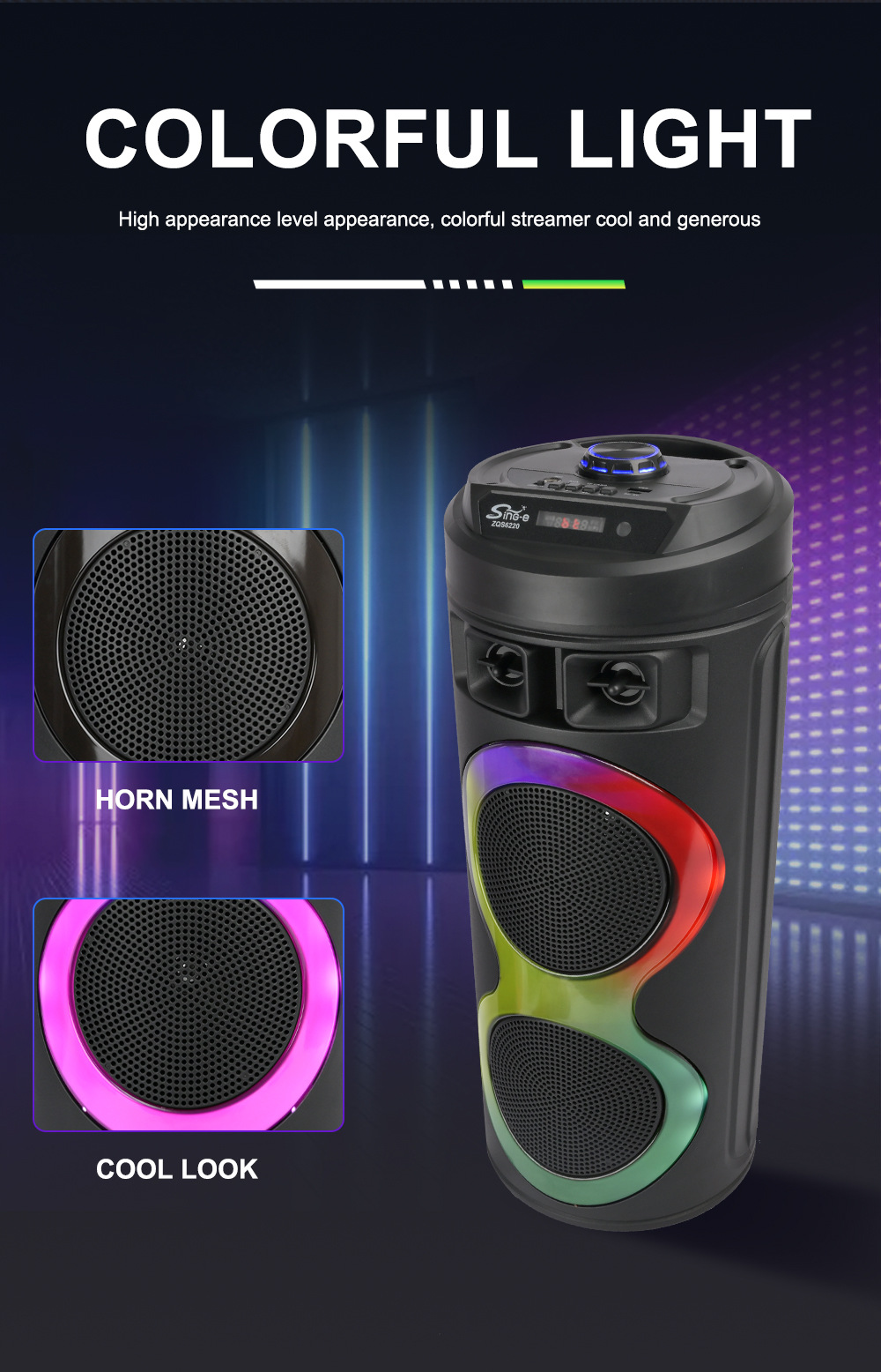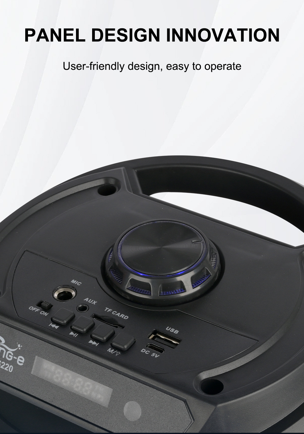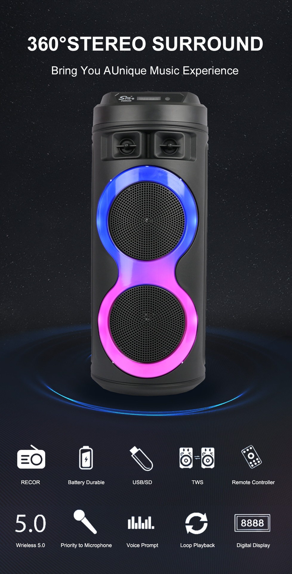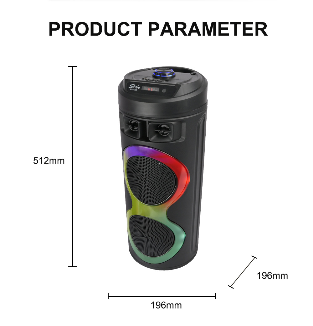 牙,带麦克风功能。带遥控功能。旋钮主音量调控,旋钮混响调节,带蓝牙/带收音/带遥控/电位器音量+带显示屏/+USB带5V升压、带七彩灯、彩灯受MOD控制、对箱功能