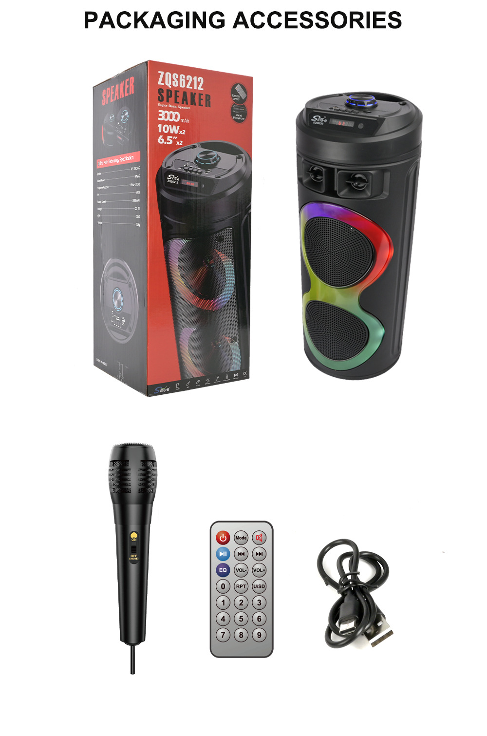 配件:充电线.有线话筒.遥控器.说明书