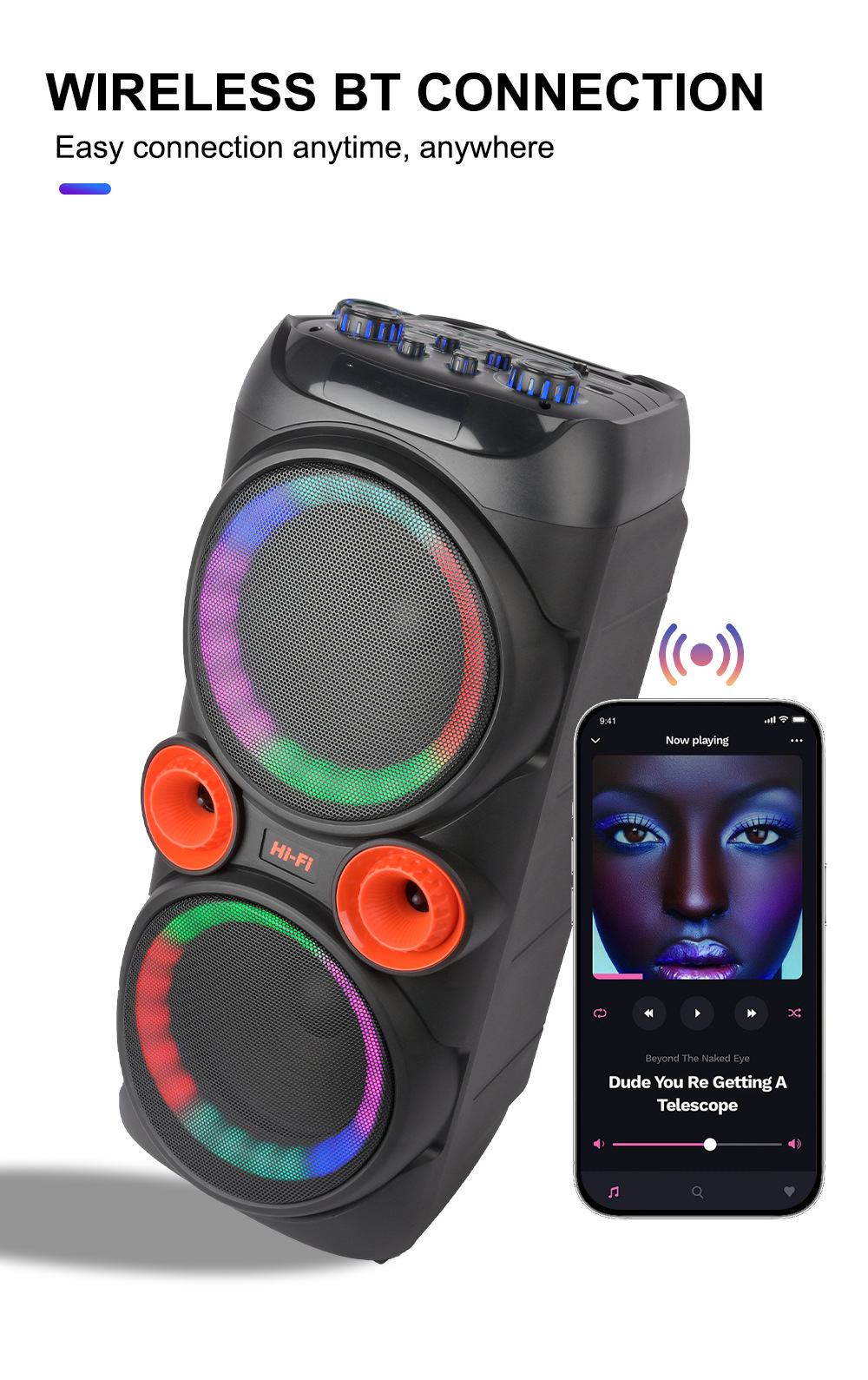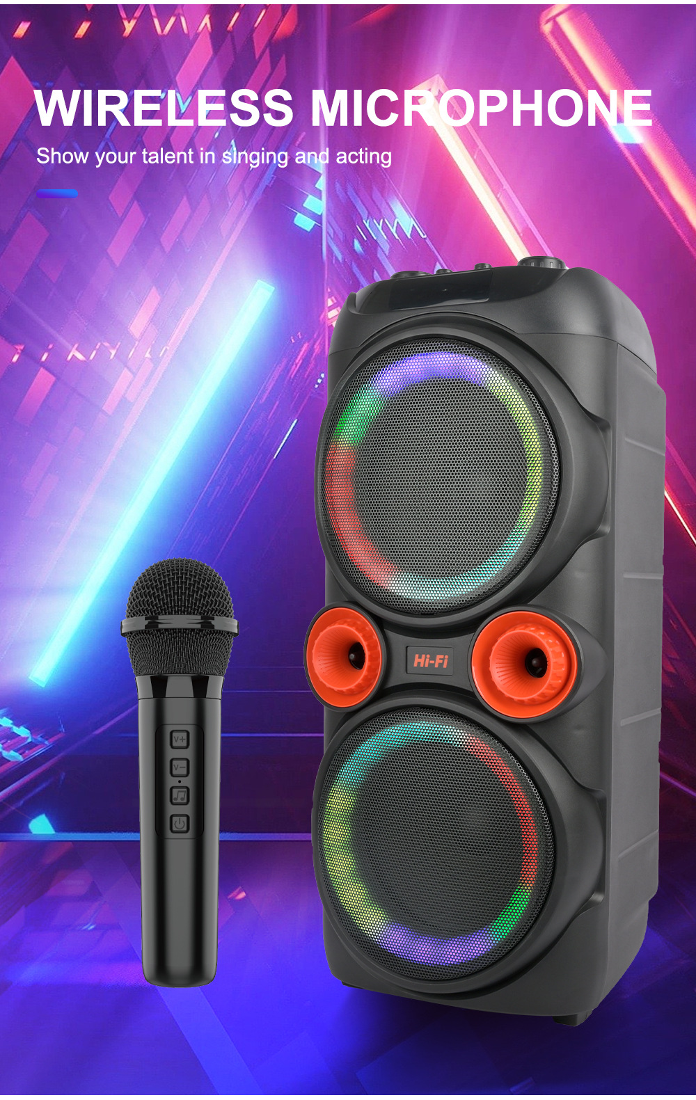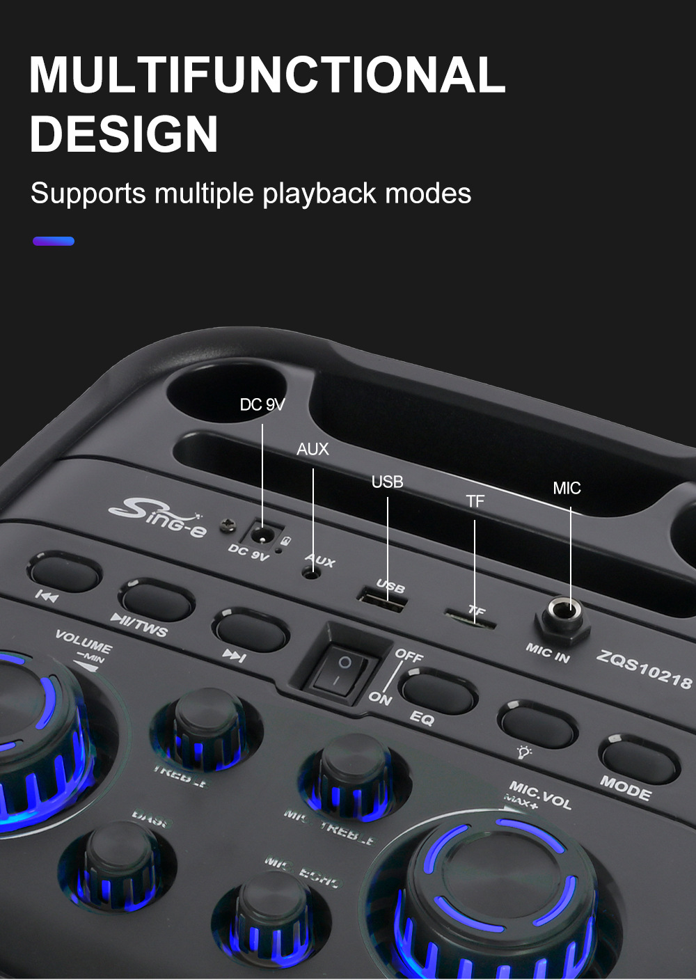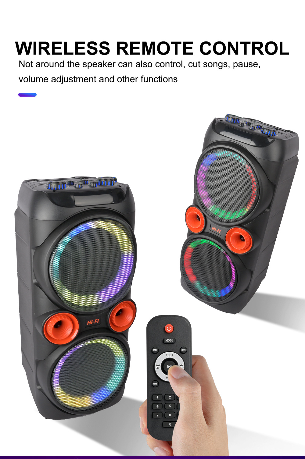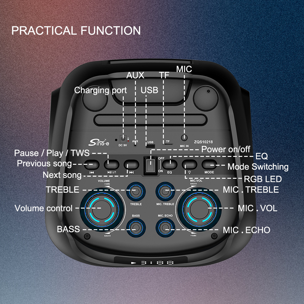 带BT/USB/TF卡/MIC/FM/AUX/带遥控,带显示屏,USB带5V稳压/无锂电保护/电位器音量、带无线麦功能,CS8679E功放+高音/带幻彩灯/幻彩灯受LED按键控制、对箱功能