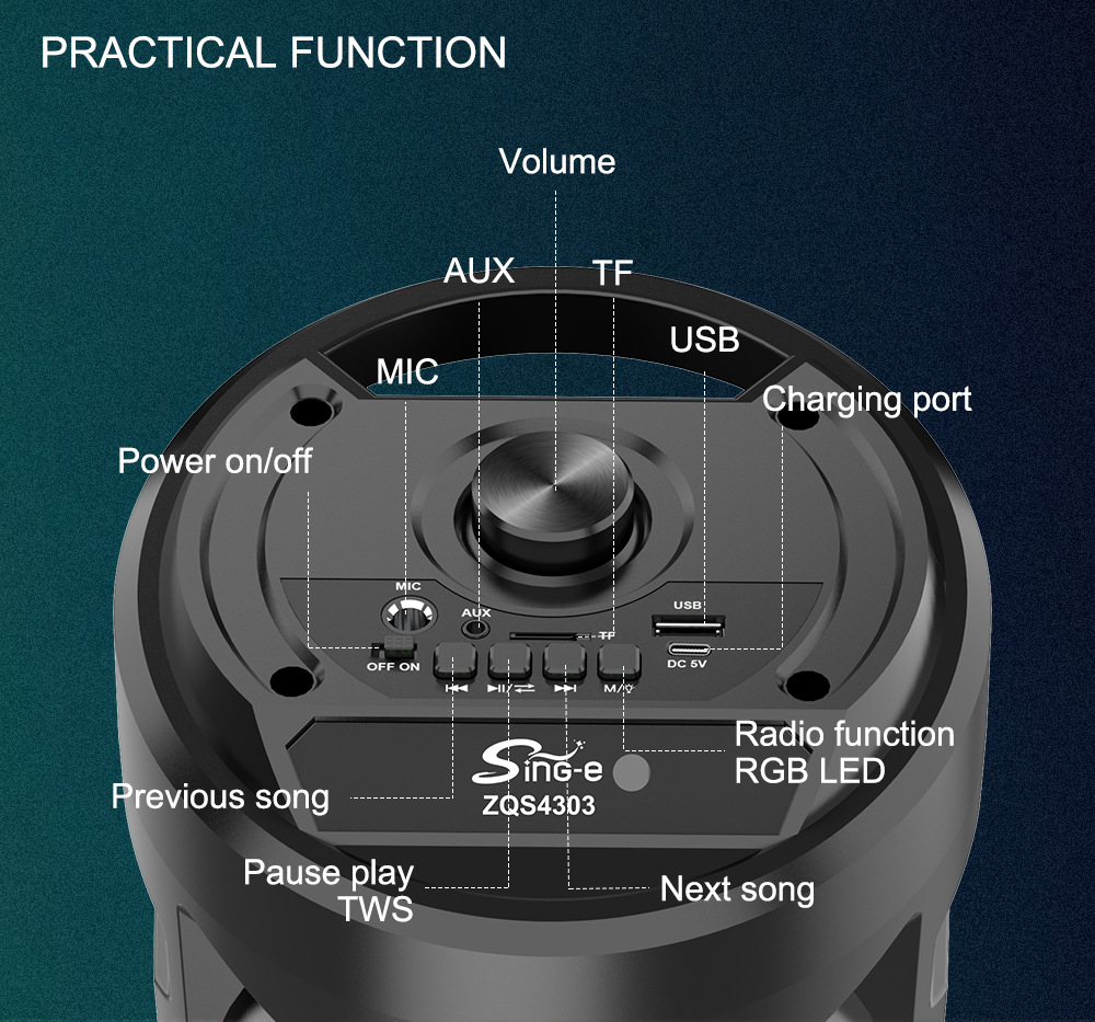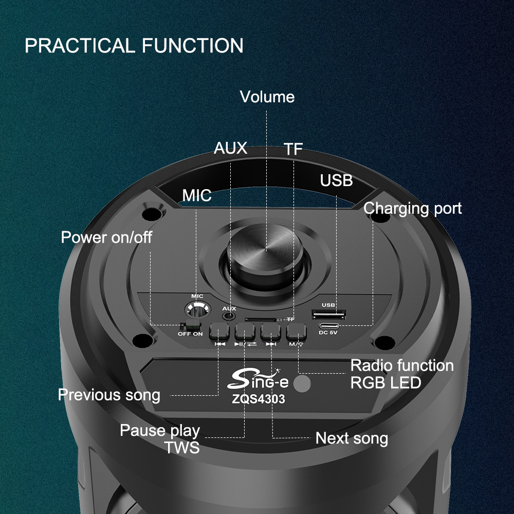 带BT/USB/TF卡/FM/MIC/AUX、DC-5V充电(Type-c座)+5W双功放、、带遥控+USB不升压/对箱功能、电位器音量+带充电管理-4054
