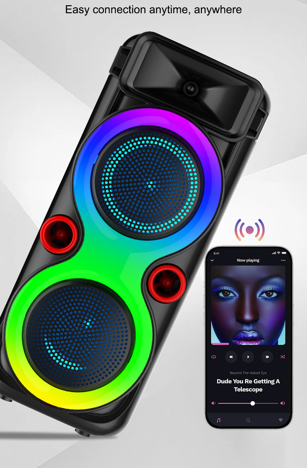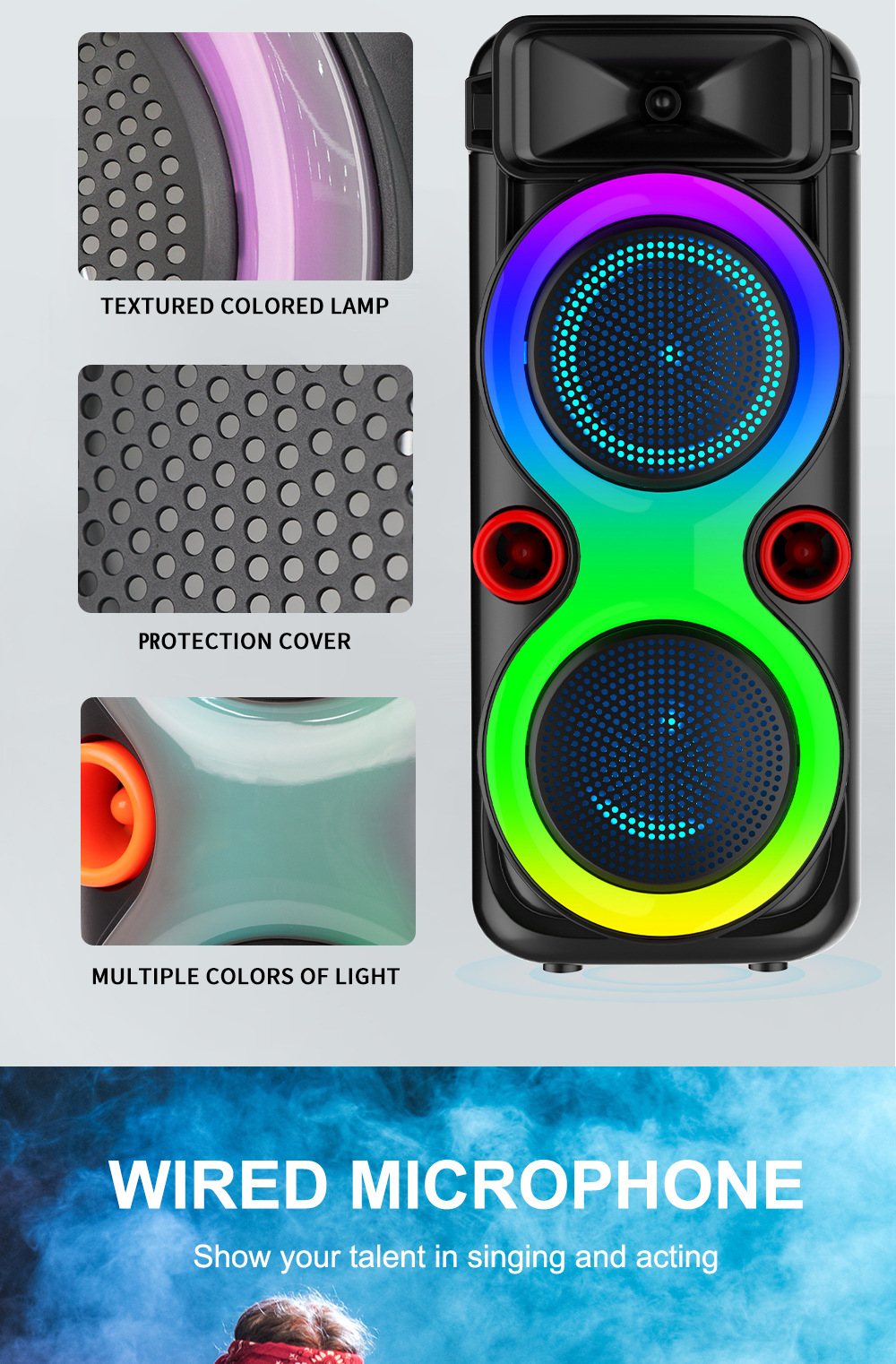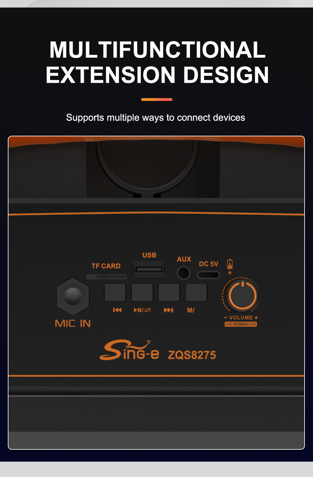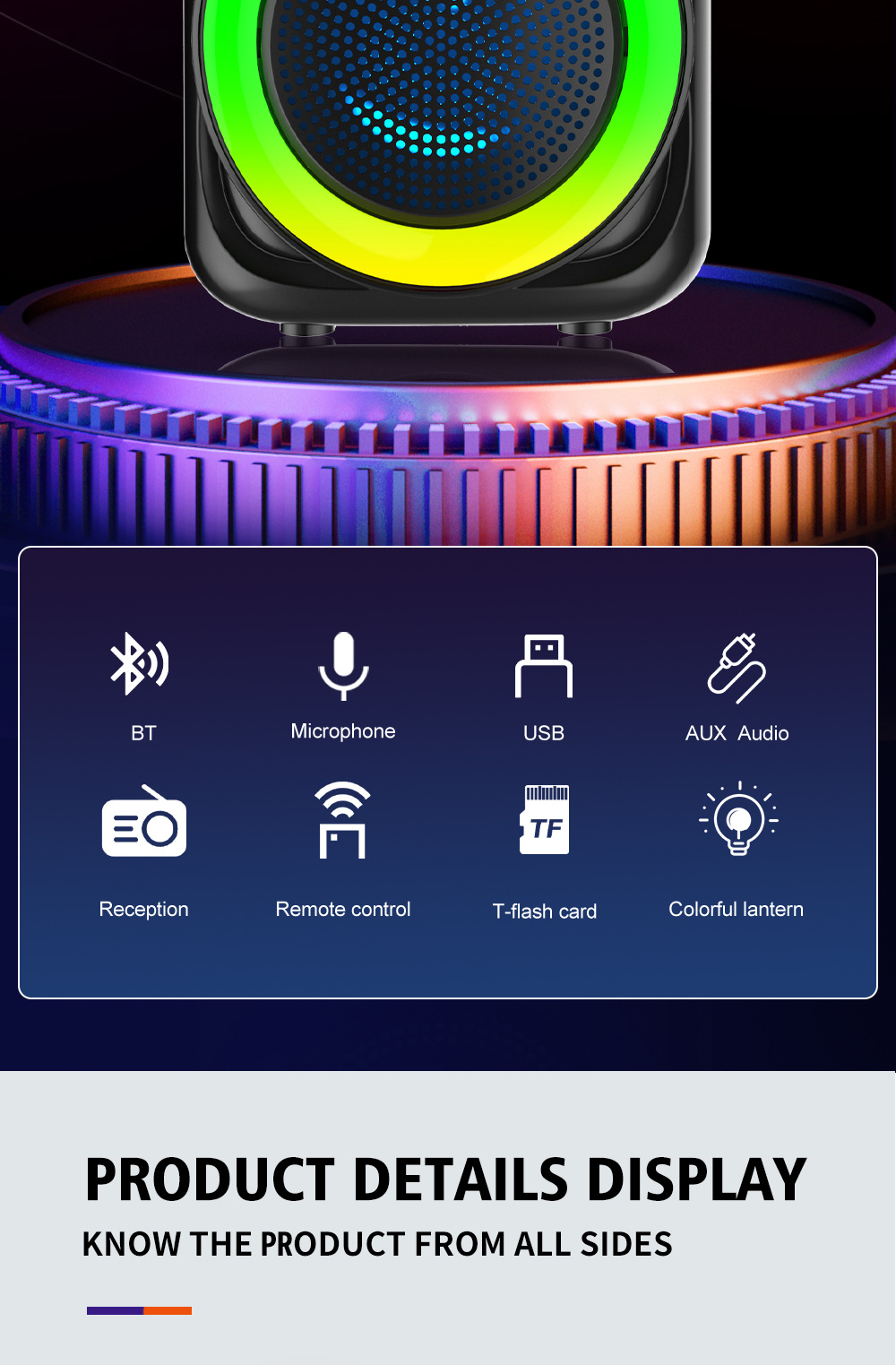 带蓝牙/带收音//USB/TF卡、TWS.带BT/FM/USB/TF卡/MIC/TWS、DC-5V充电USB带5V升压、、电位器音量、带锂电保护、+带幻彩、幻彩受M键控制注:FM状态(插充电线后才可以收台