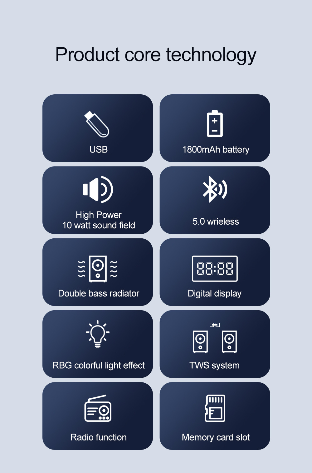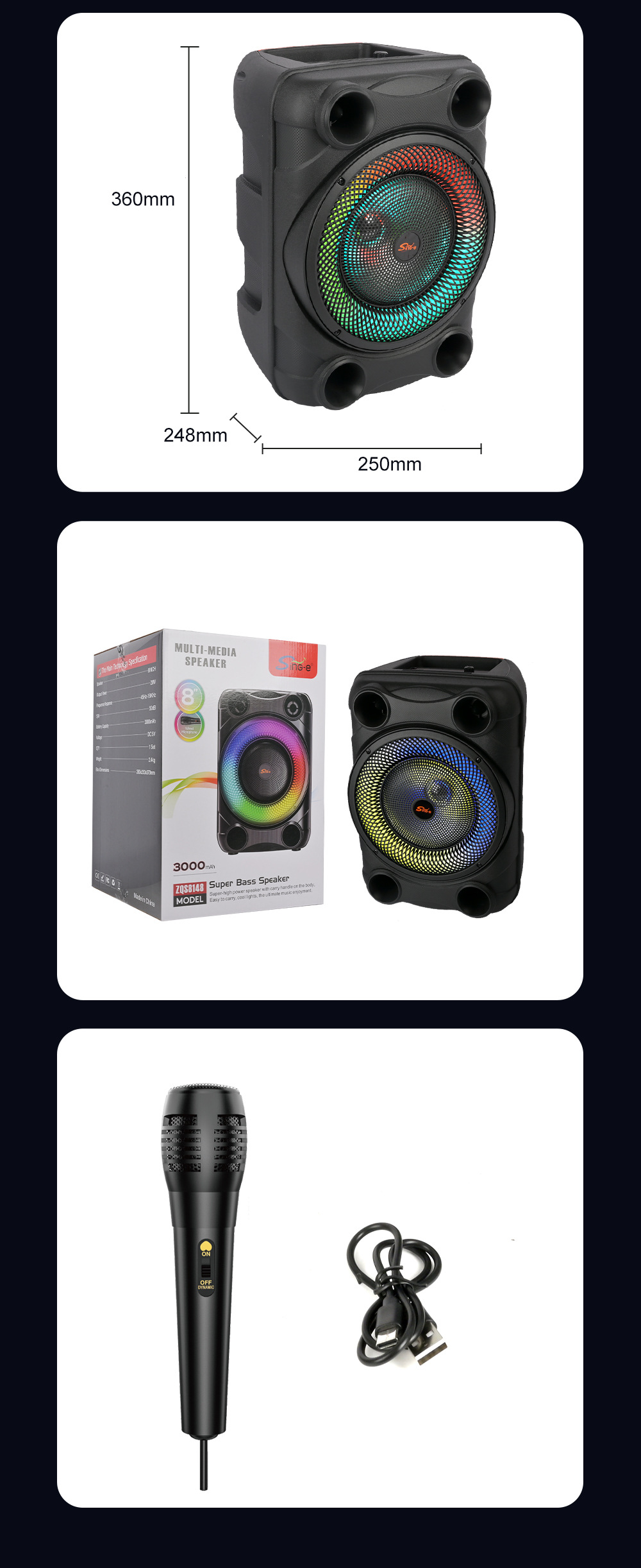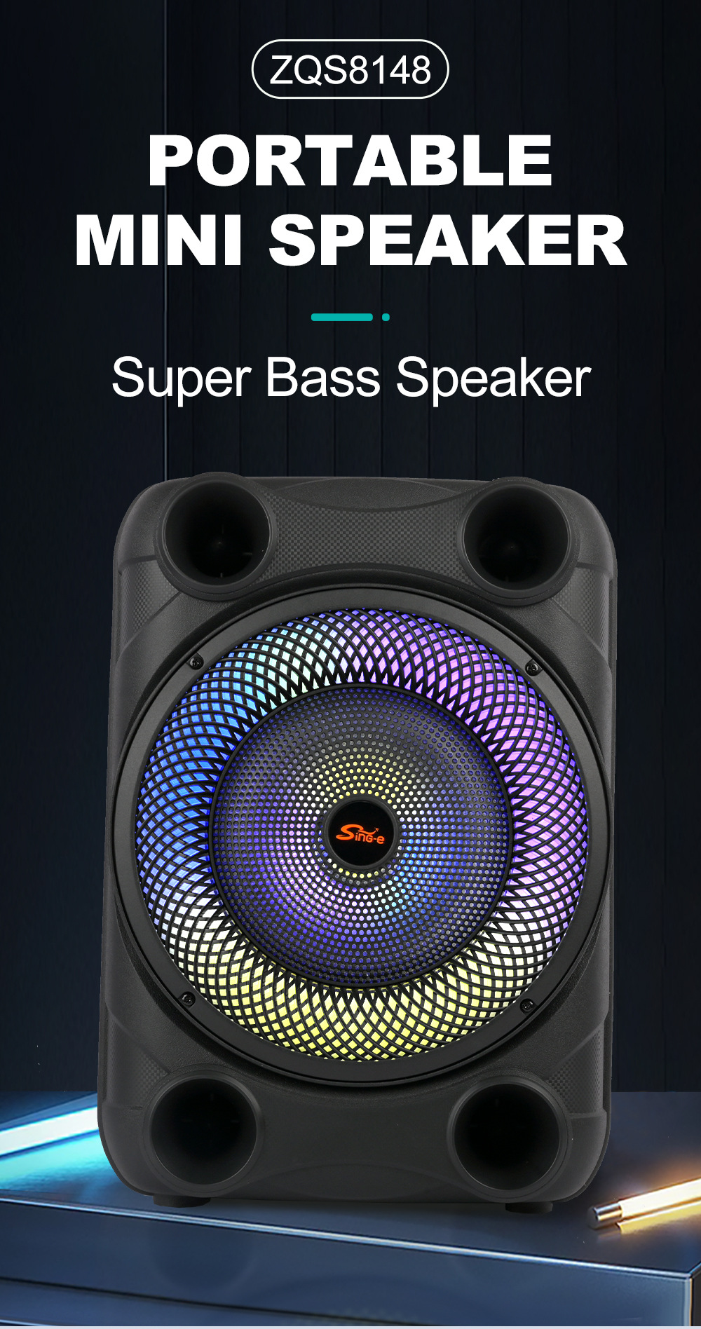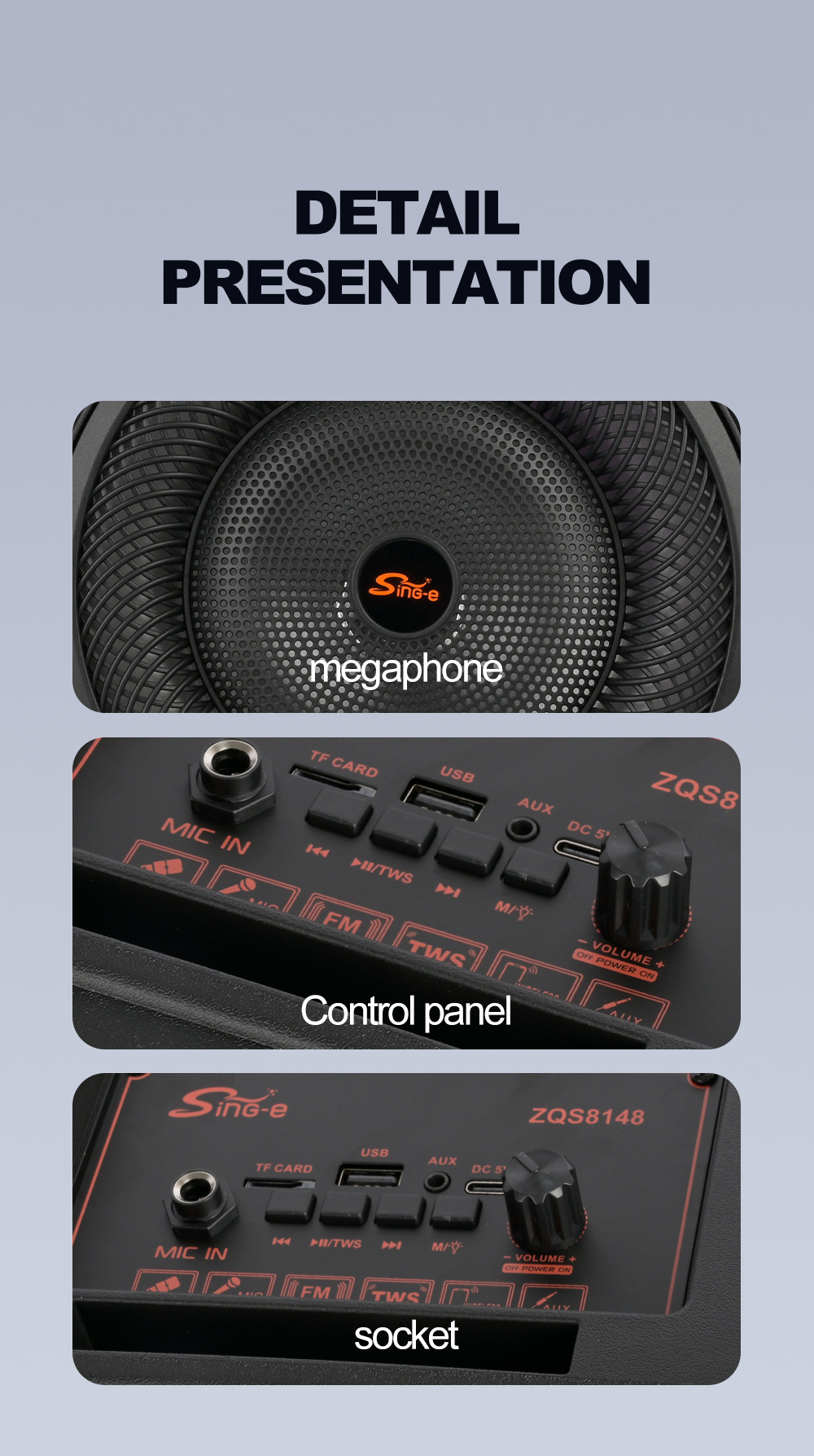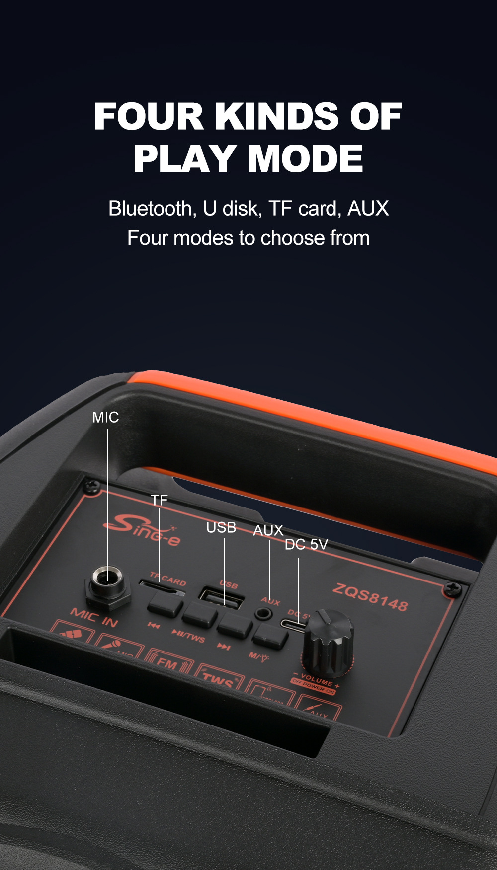 带BT/FM/USB/TF卡/MIC、DC-5V充电(Type-c)、USB带5V升压+带锂电保护+单功放、电位器音量、对箱功能