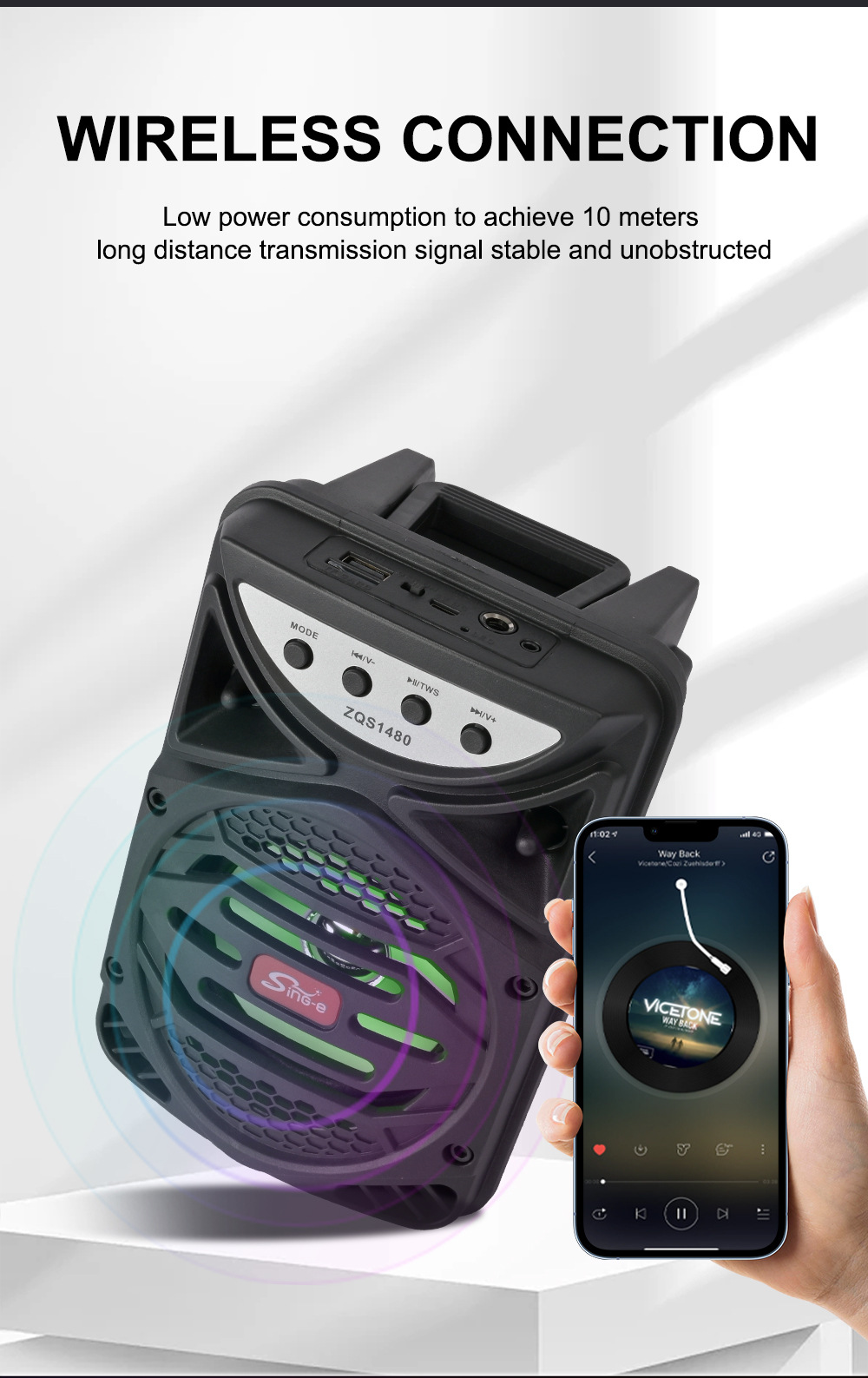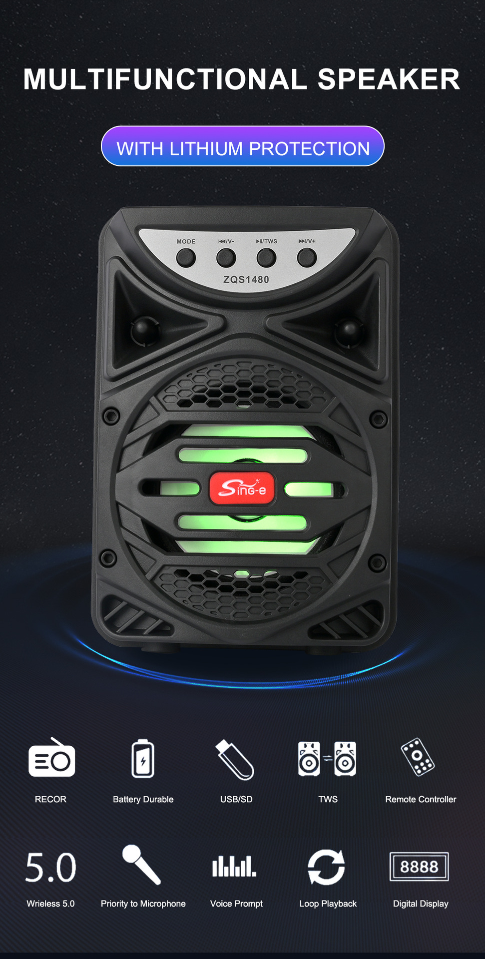 带蓝牙/带收音/带AUX/USB/TF卡/MIC、DC-5V充电+HAA2018单功放、/带麦克风、对箱功能+带充电管理IC、按键音量+USB不升压、带七彩灯、彩灯不受MODE控制