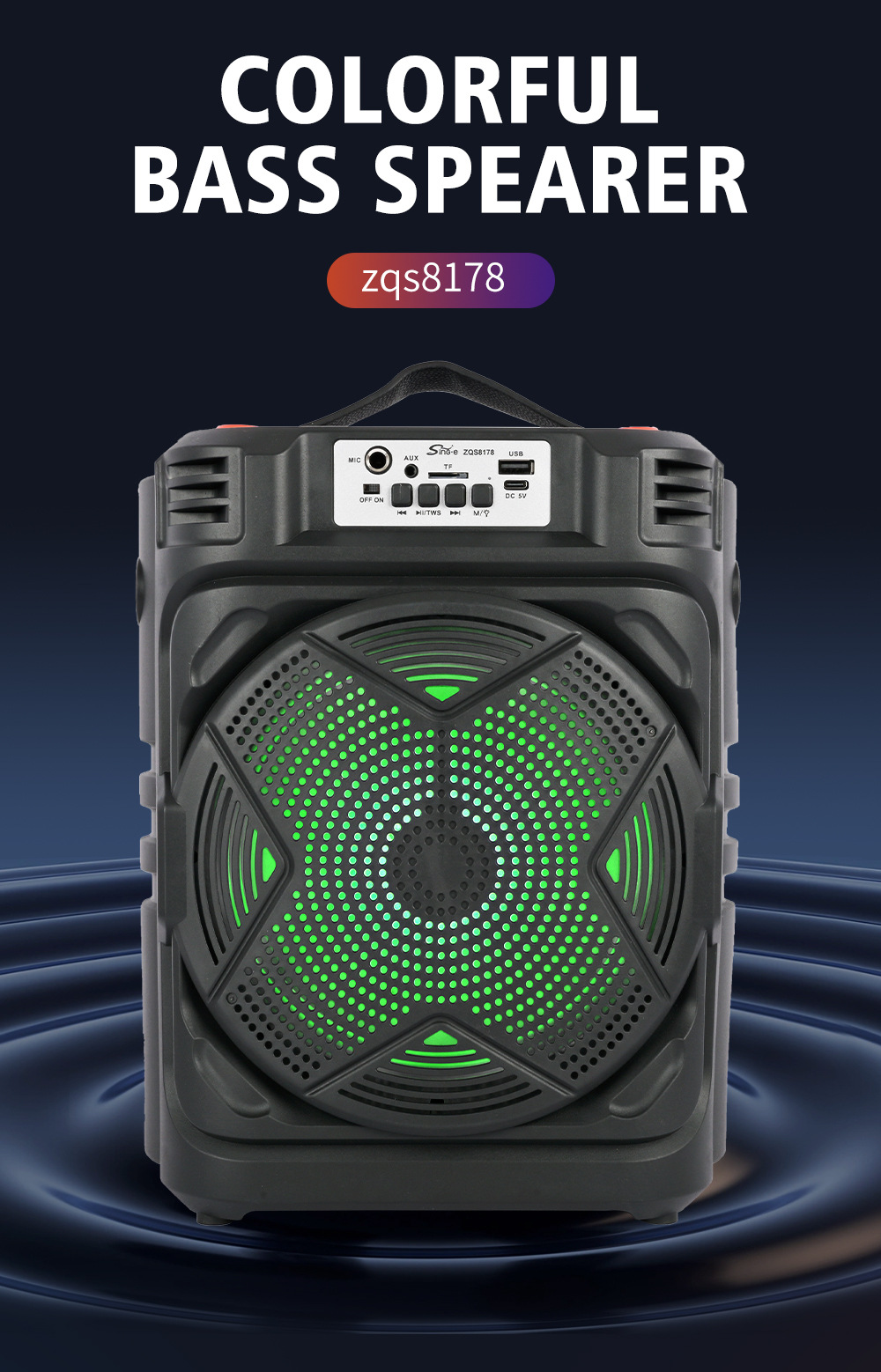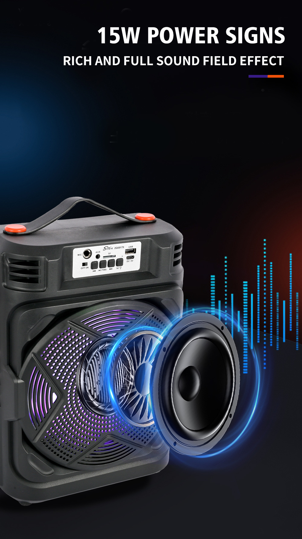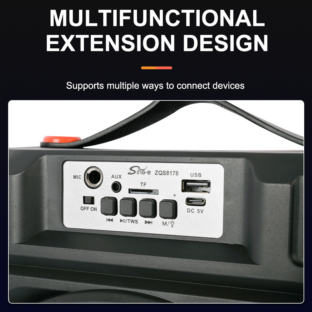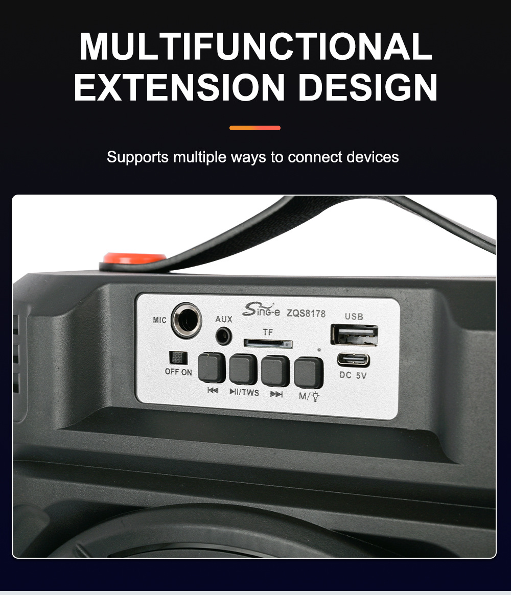 带BT/USB/TF卡/FM/MIC/AUX、DC-5V充电(Type-c座)单功放、无屏、无遥控