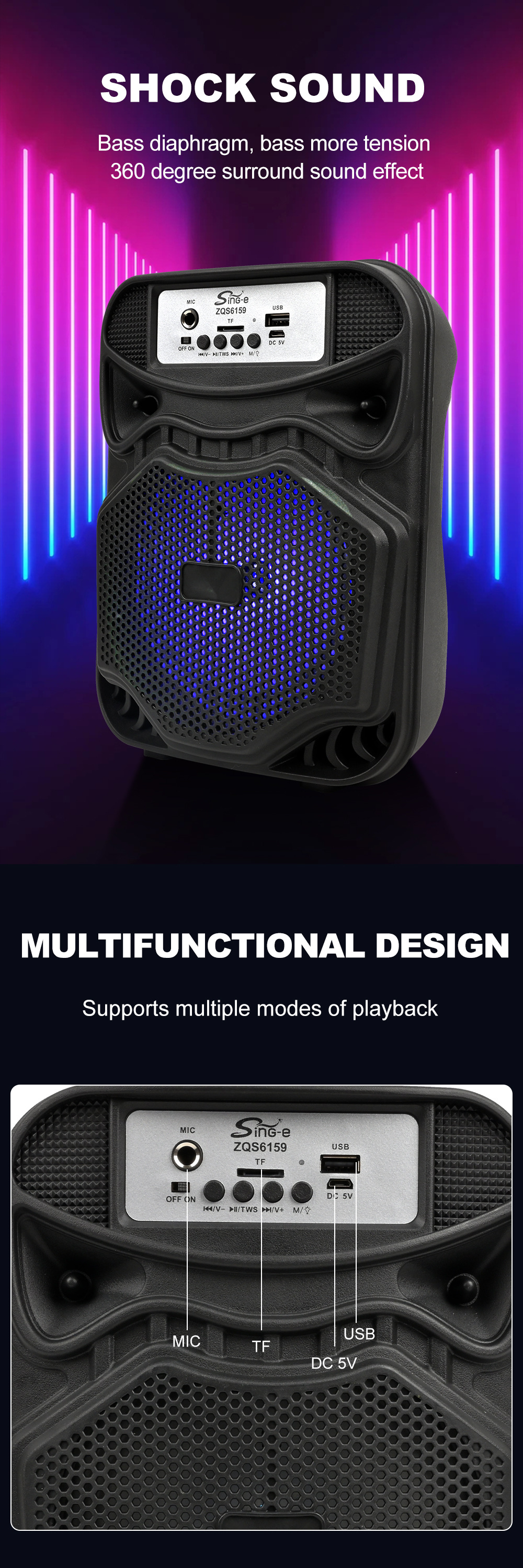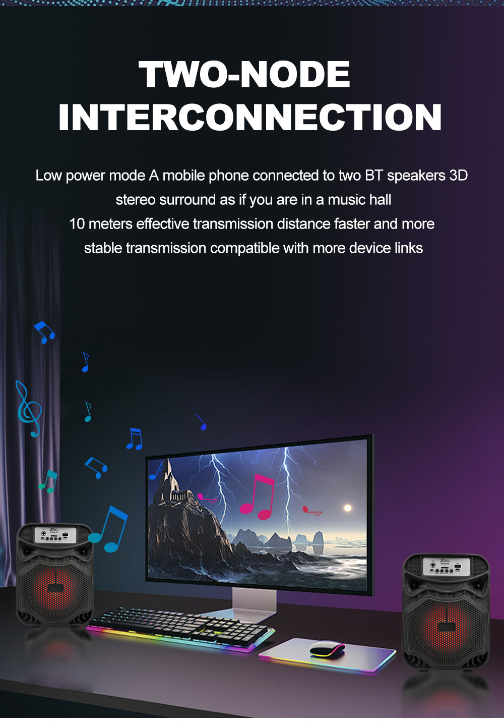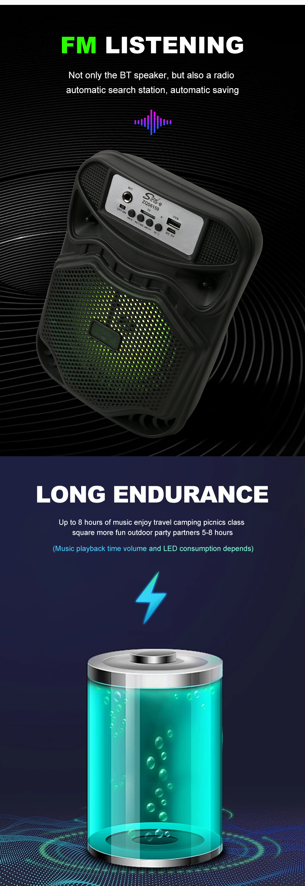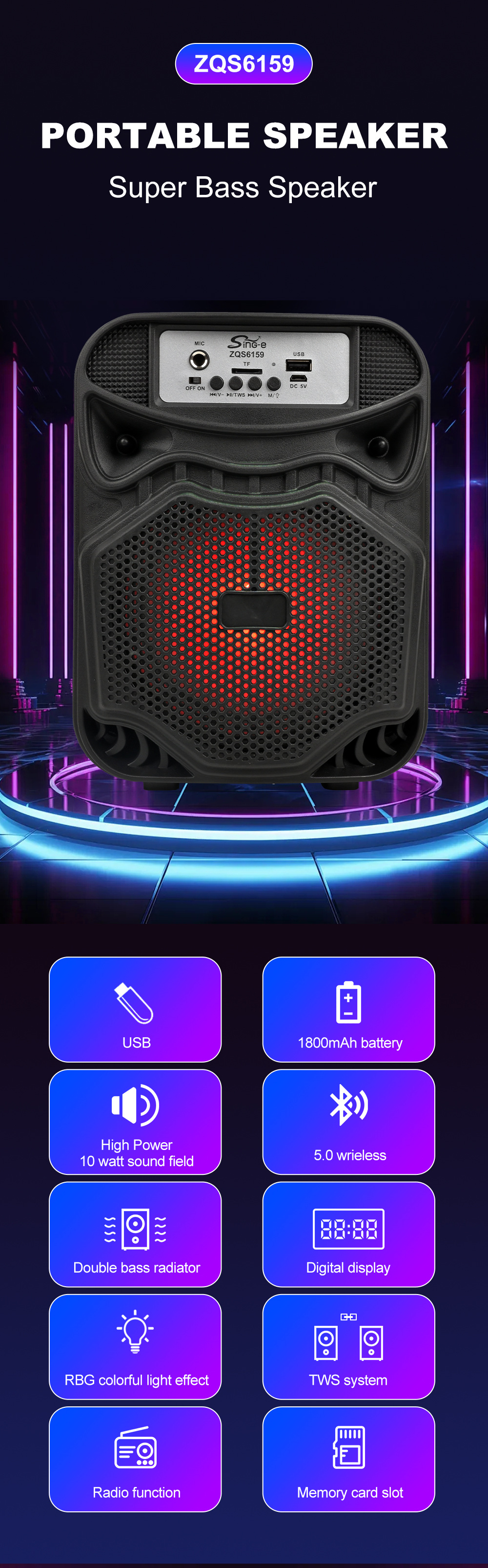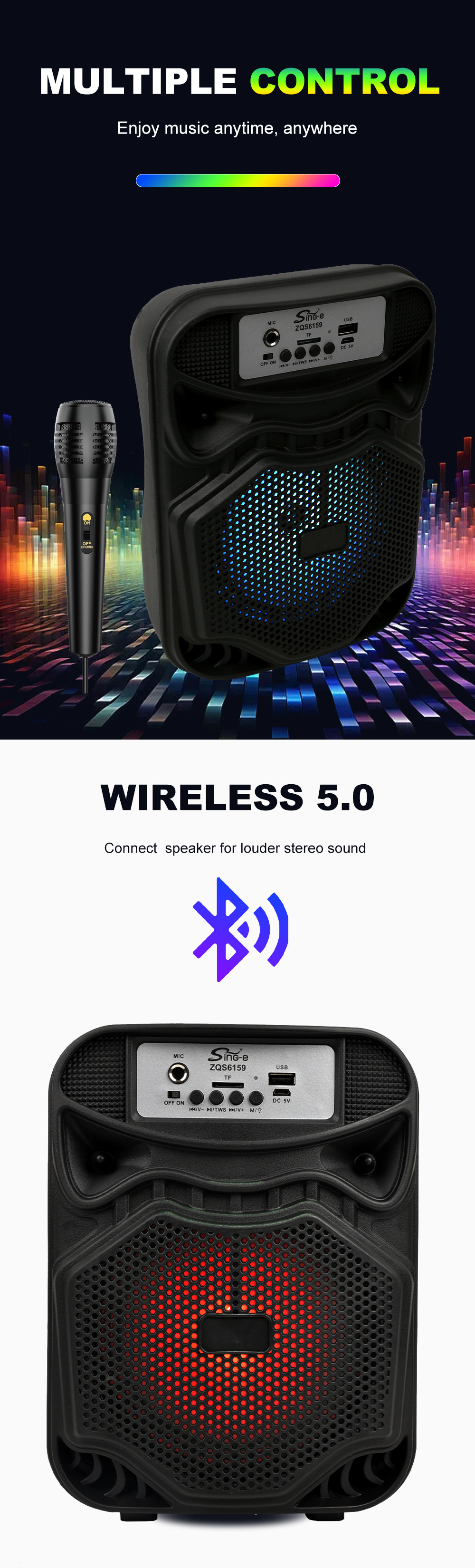 带蓝牙/带收音/带麦克风/无遥控+无屏/USB/TF卡/MIC/DC-5V充电/+USB不升压/带充电管理IC/按键音量+七彩灯不受MODE控制、对箱功能 电池规格:18650/3.7V/1200MAH