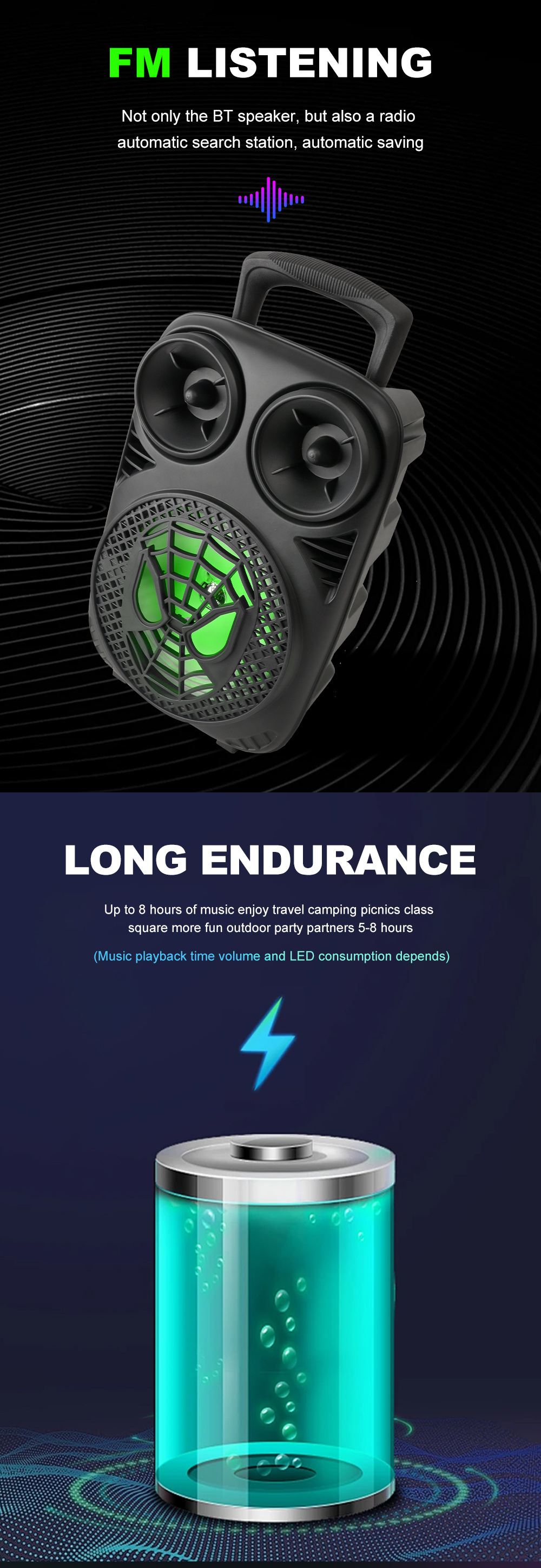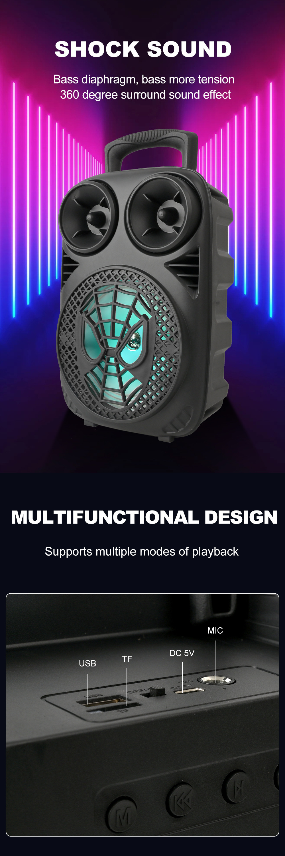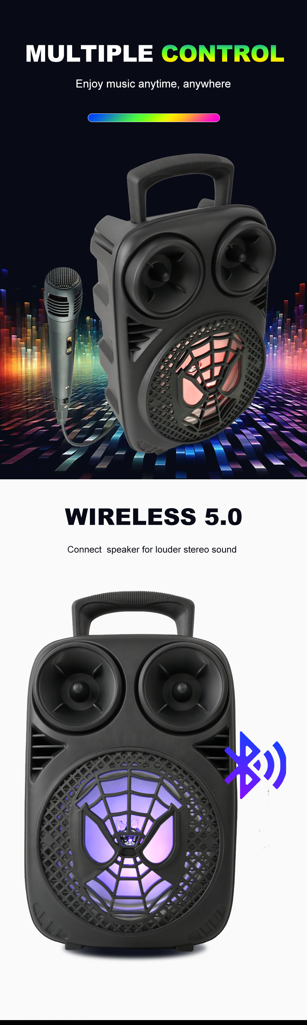带蓝牙/带收音/带麦克风/无遥控+无屏/USB/TF卡/MIC/DC-5V充电/+USB不升压/带充电管理IC/按键音量+七彩灯不受MODE控制、对箱功能 电池规格:18650/3.7V/1200MAH