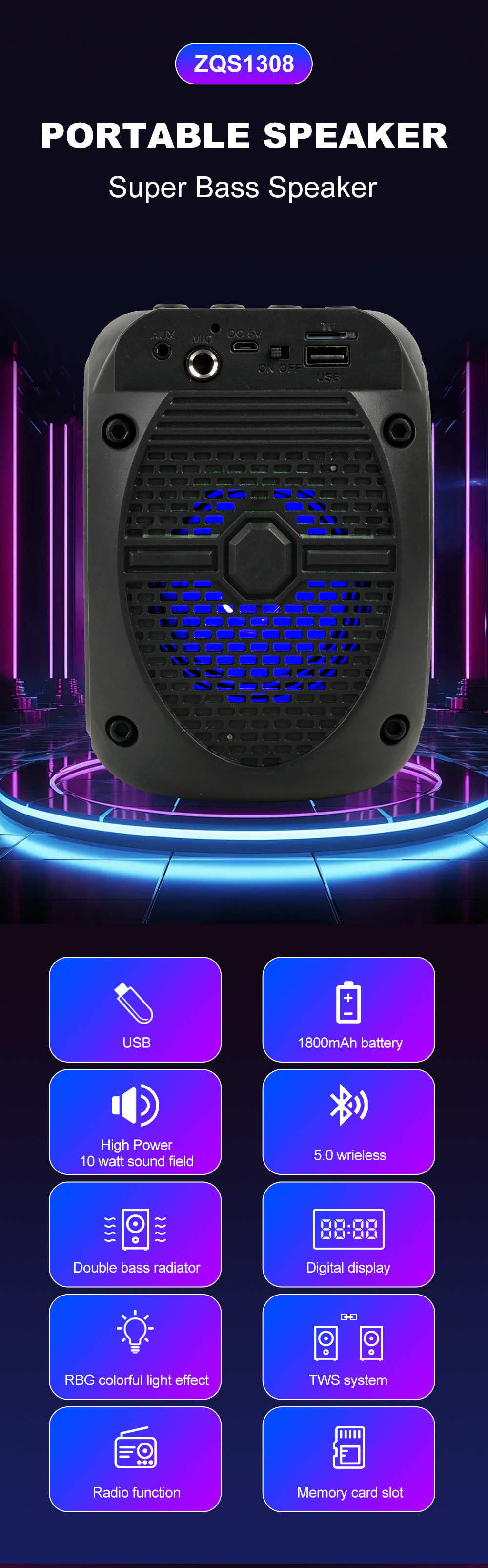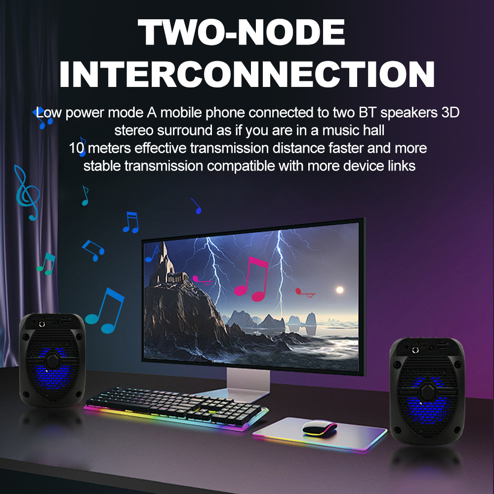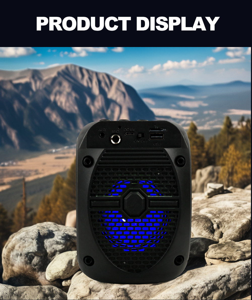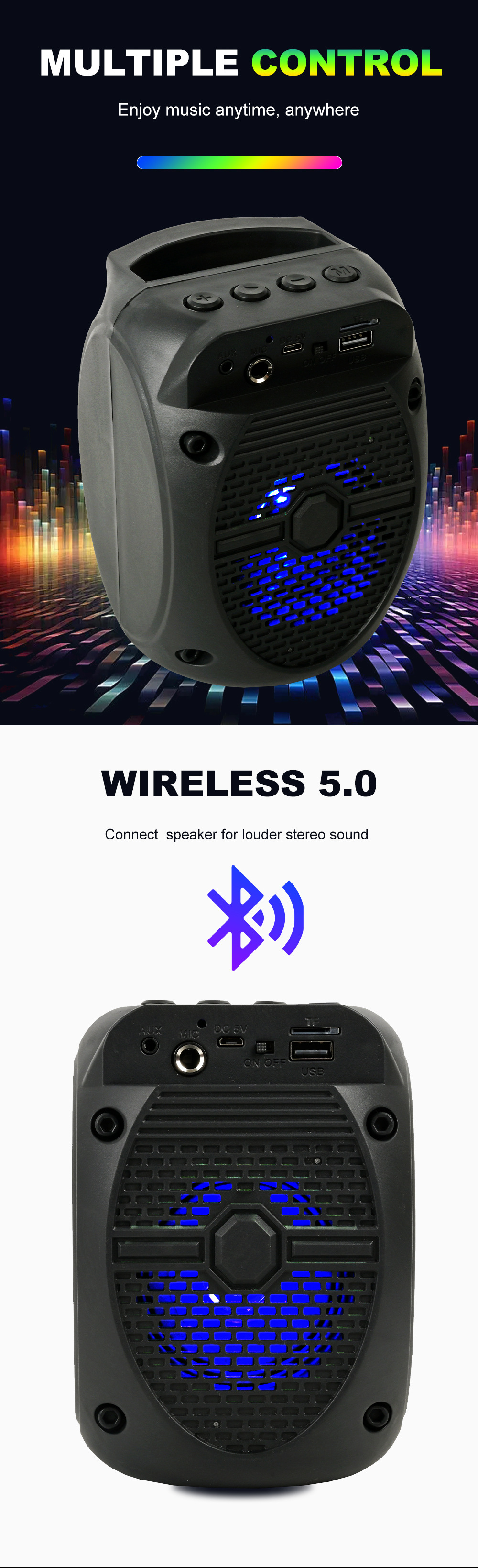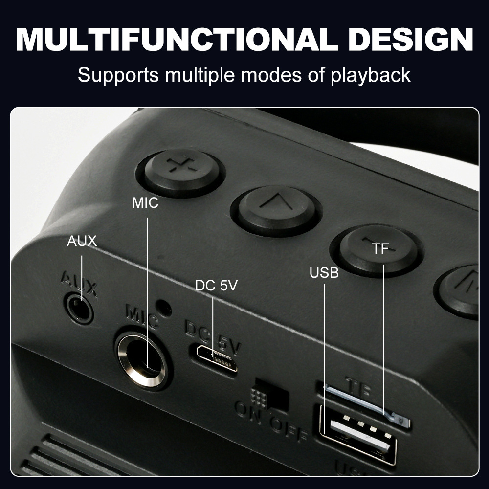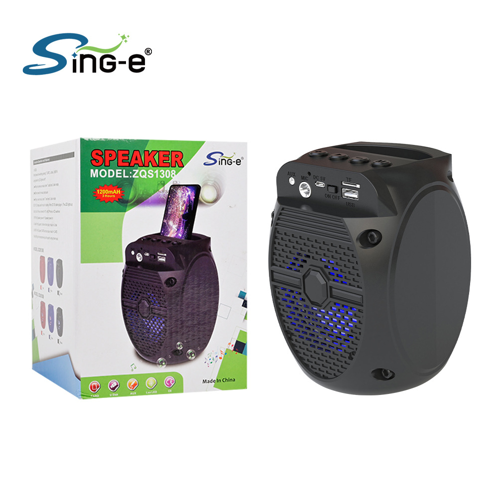 带蓝牙/带收音/USB/MIC、DC-5V充电.带麦克风功能、对箱功能/、按键音量+带七彩灯、
