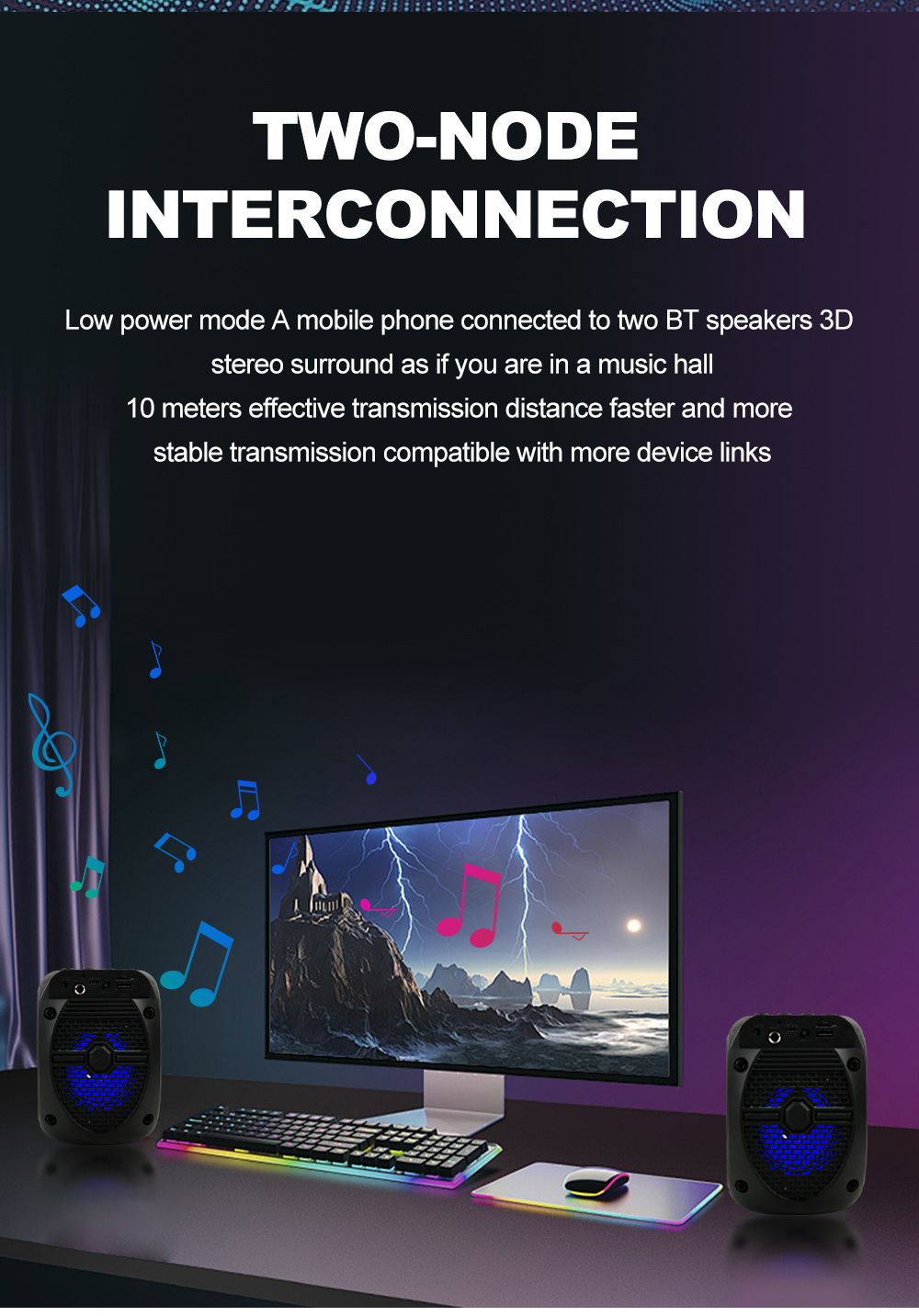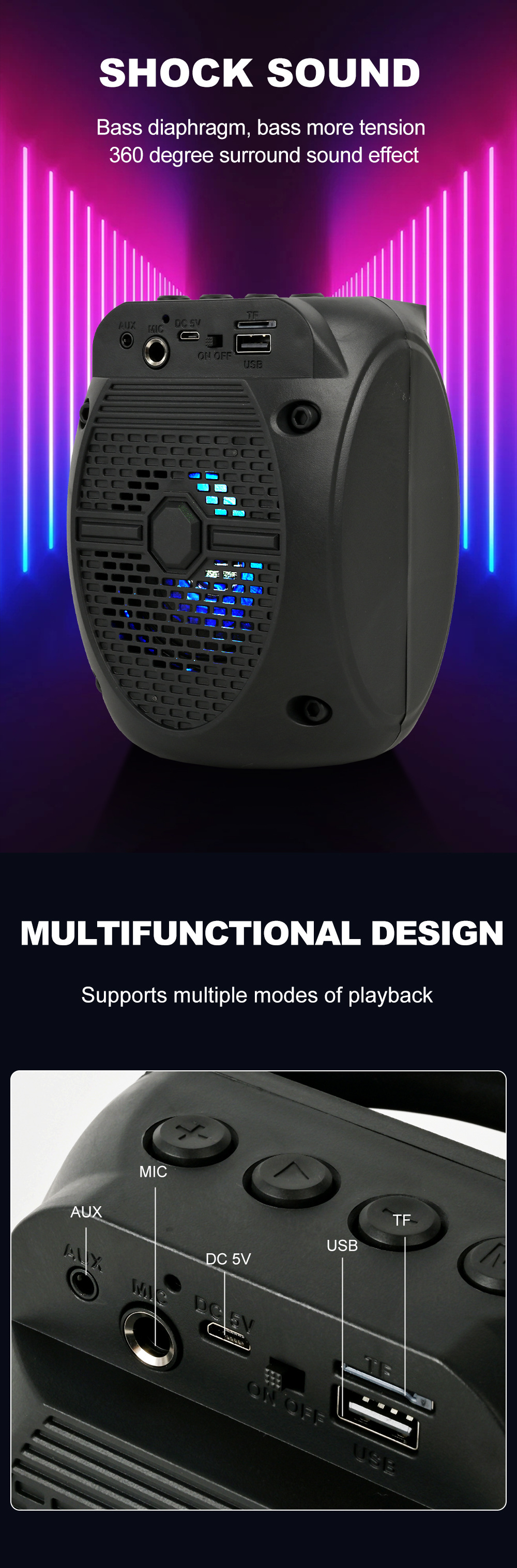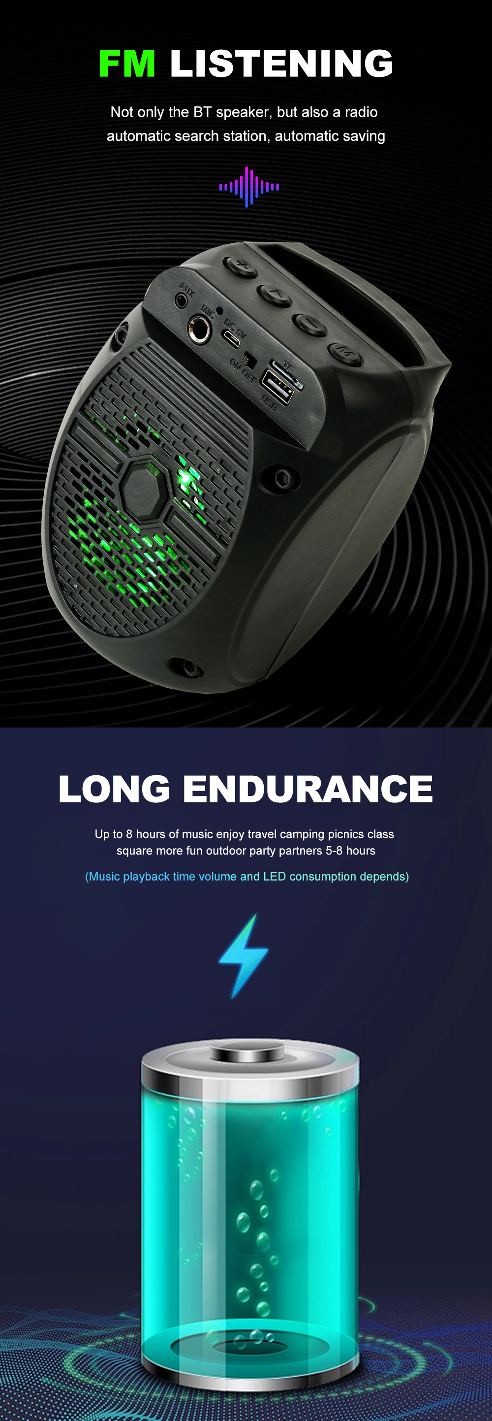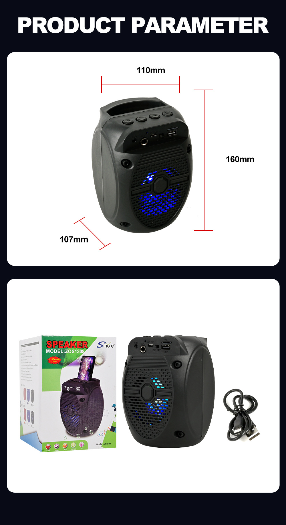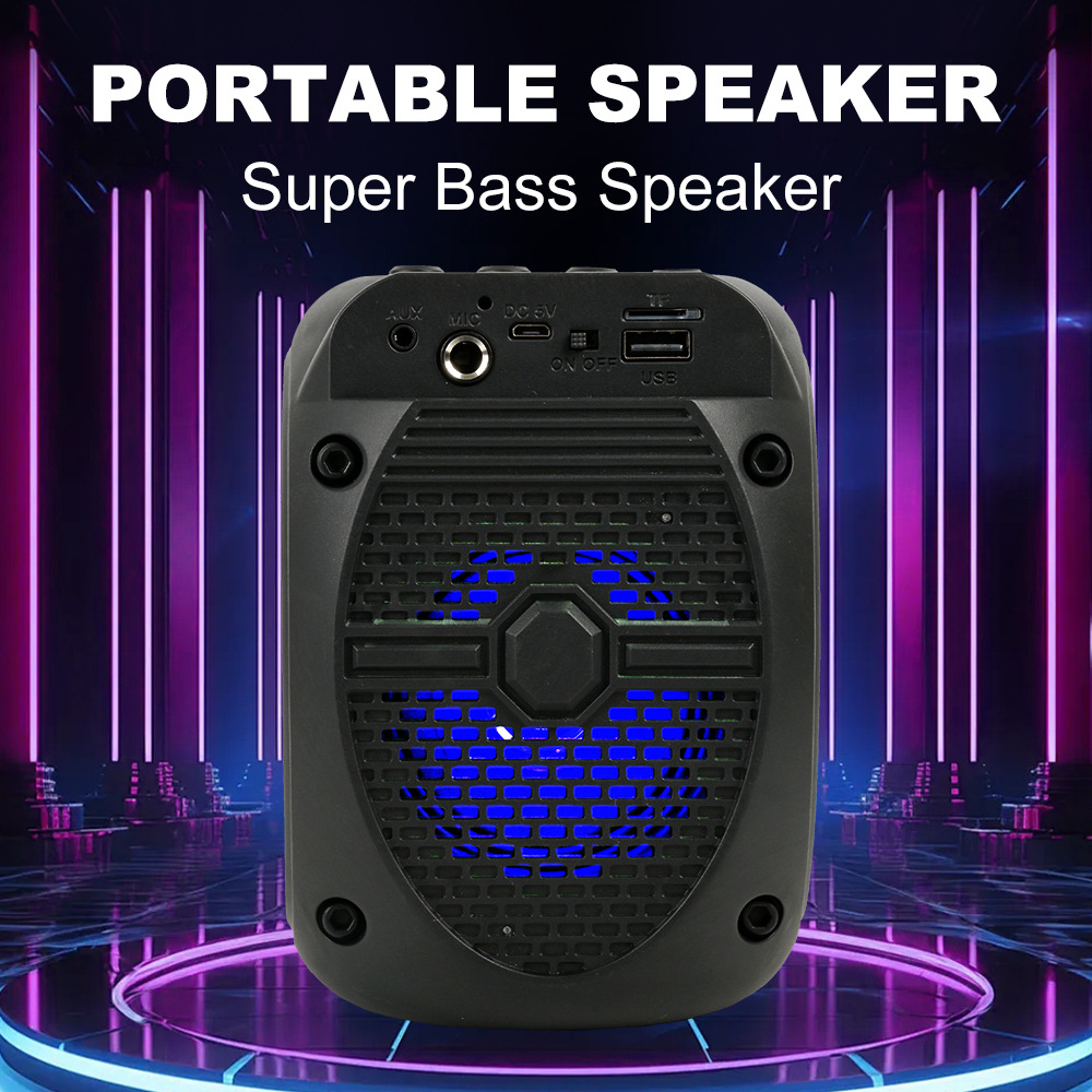 带蓝牙/带收音/USB/MIC、DC-5V充电.带麦克风功能、对箱功能/、按键音量+带七彩灯、