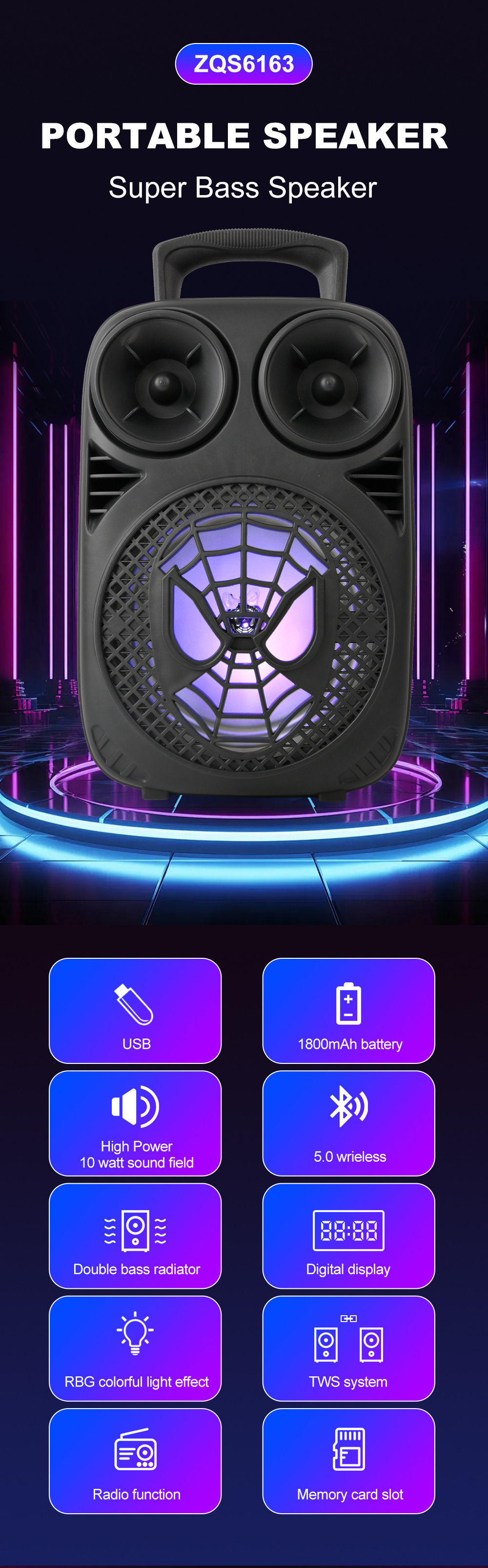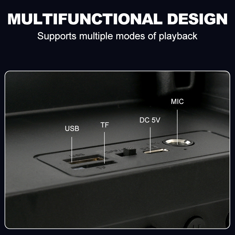 带蓝牙/带收音/带麦克风/无遥控+无屏/USB/TF卡/MIC/DC-5V充电/+USB不升压/带充电管理IC/按键音量+七彩灯不受MODE控制、对箱功能 电池规格:18650/3.7V/1200MAH