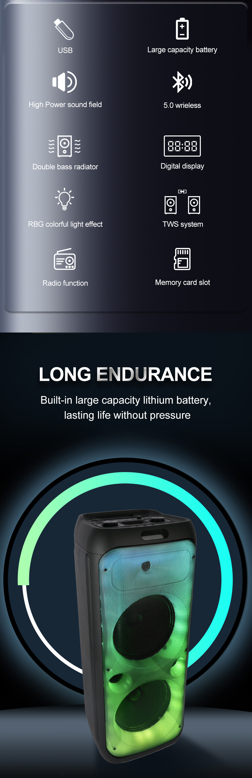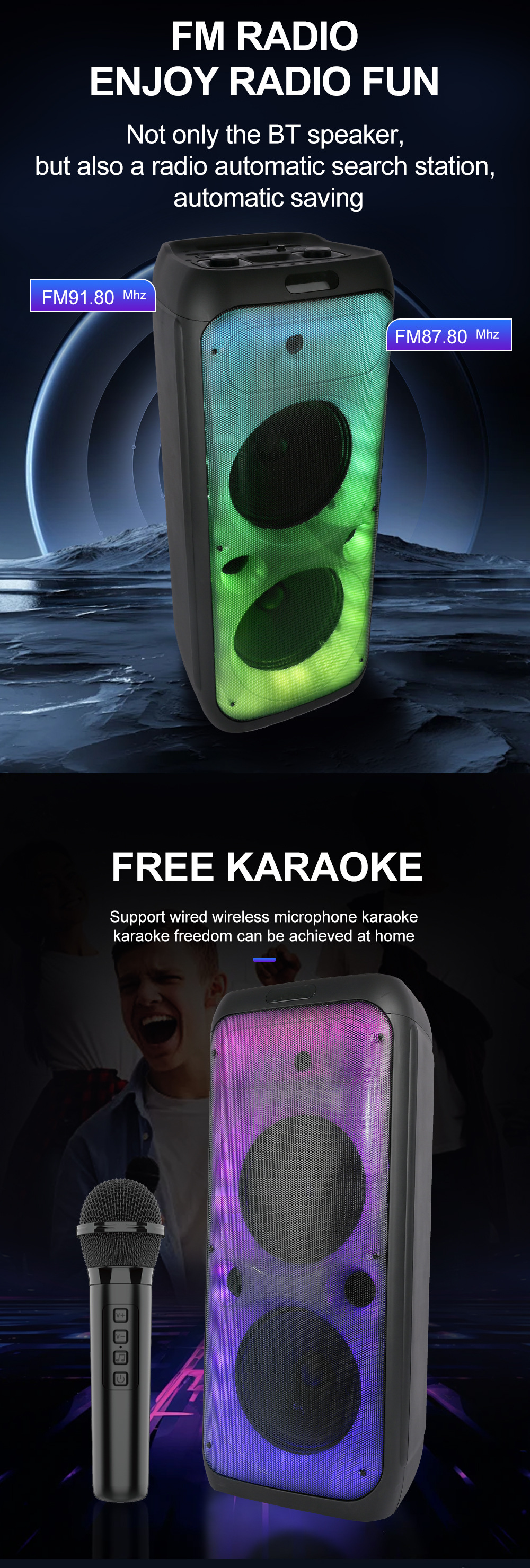 带BT/USB/TF卡/MIC/FM/AUX/TWS/带遥控带显示屏,USB带5V稳压/无锂电保护/电位器音量、带无线麦功能-DC5.5*2.0插座,CS8679E功放+高音/带幻彩灯/幻彩灯受LED按键控制。