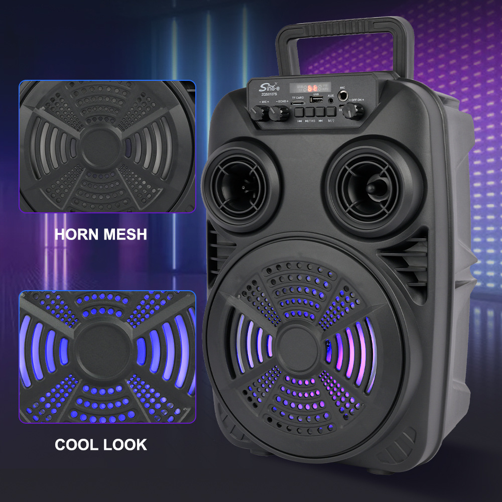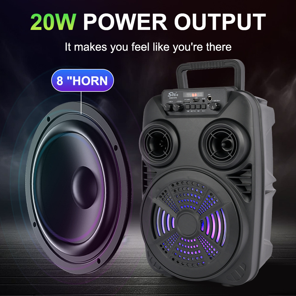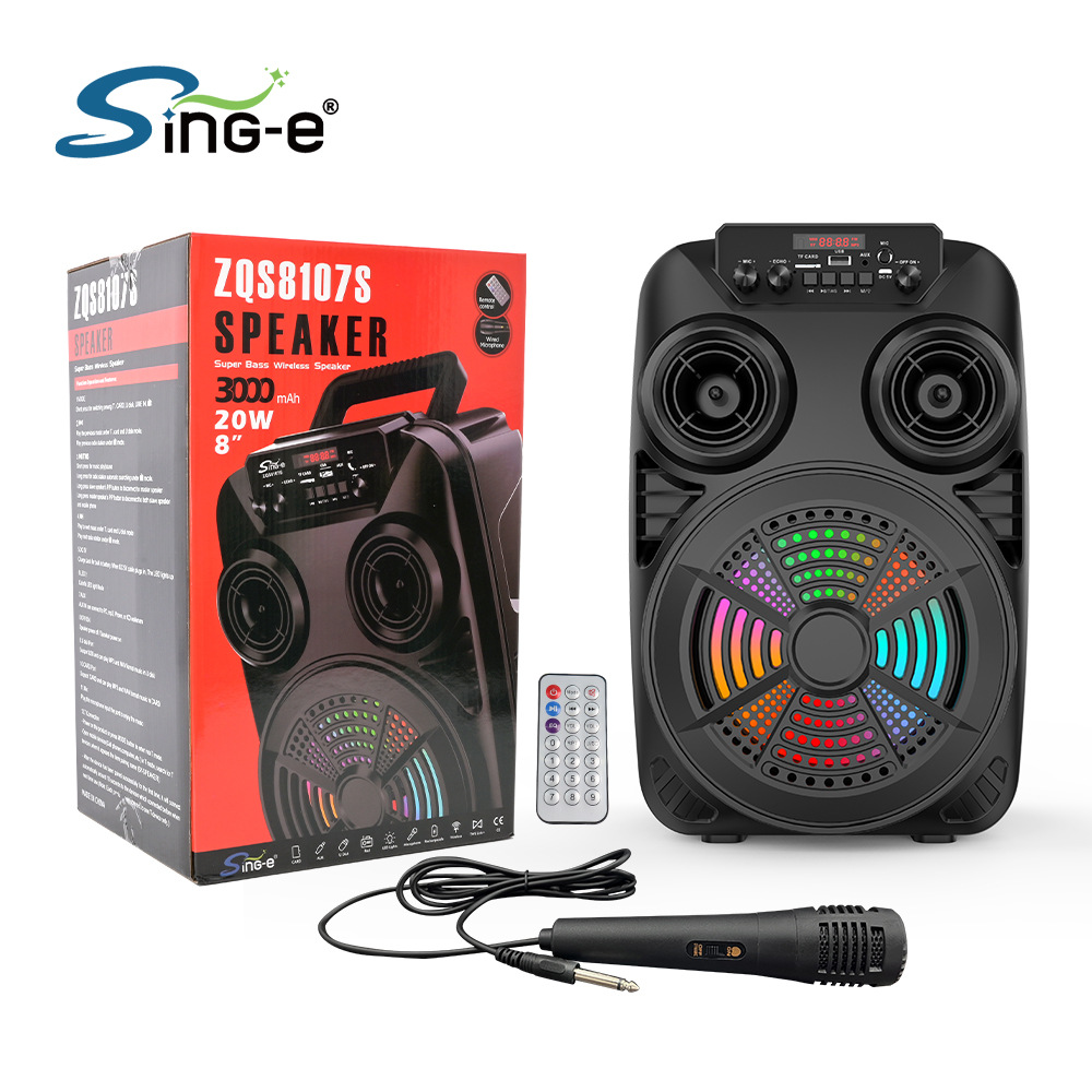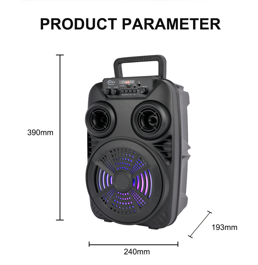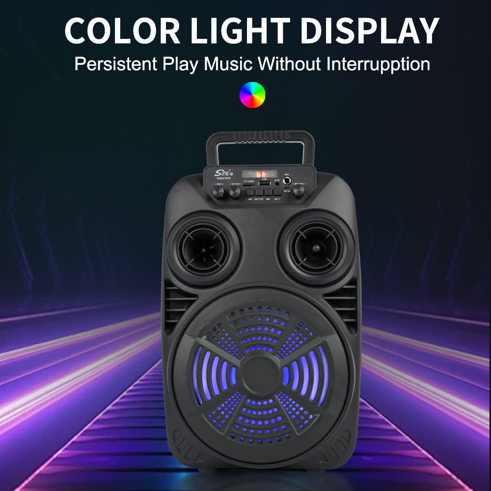 支持USB/TF/FM/AUX/蓝牙,带麦克风功能。带遥控功能。旋钮调控音量。带屏,带喇叭七彩灯。